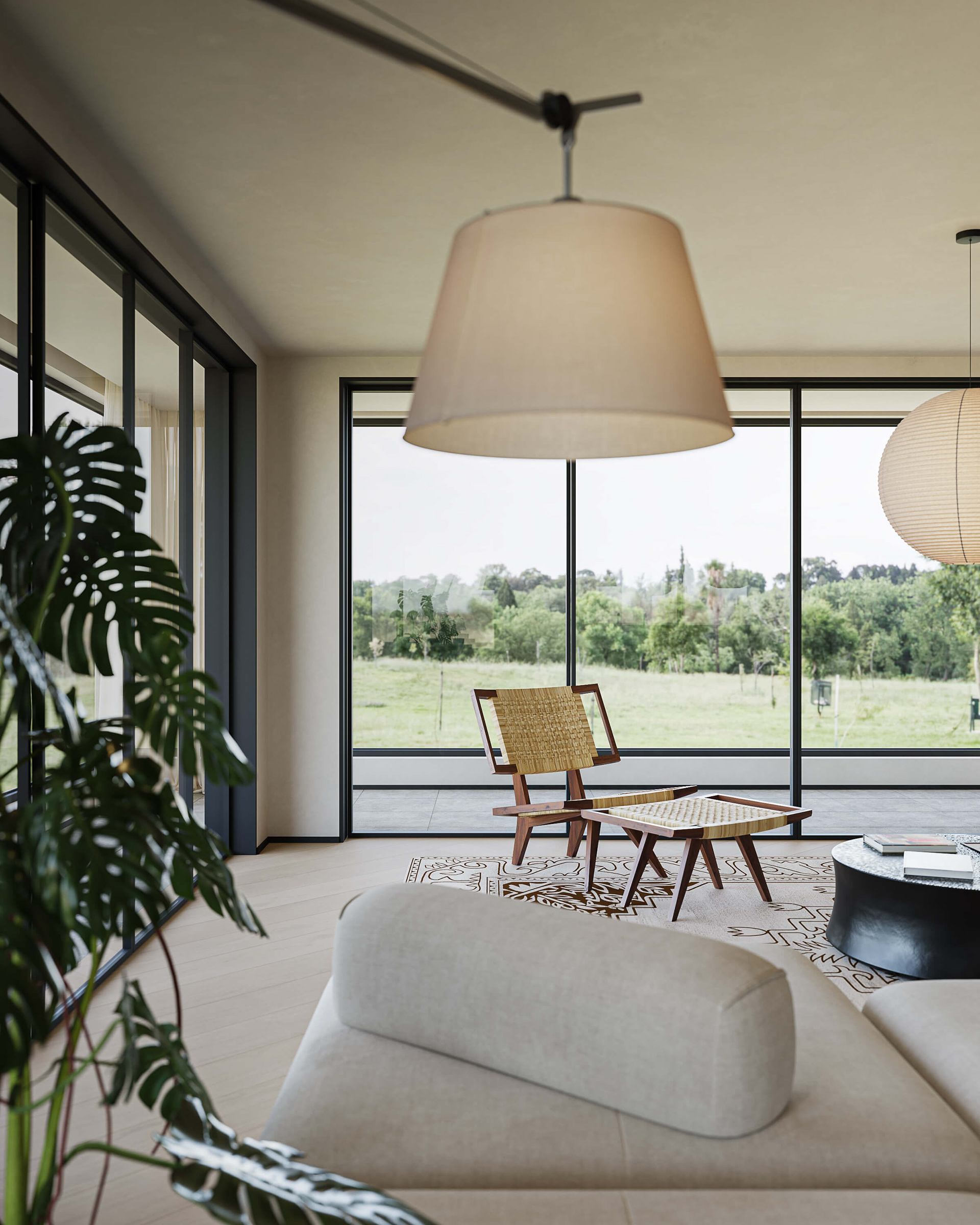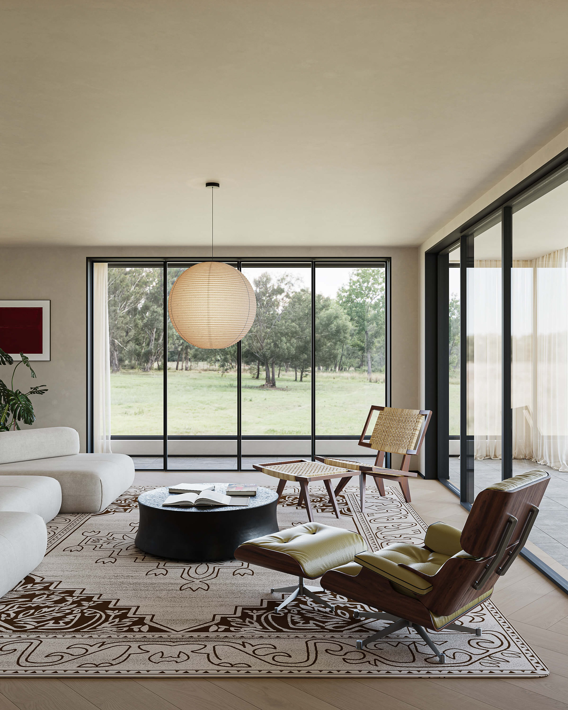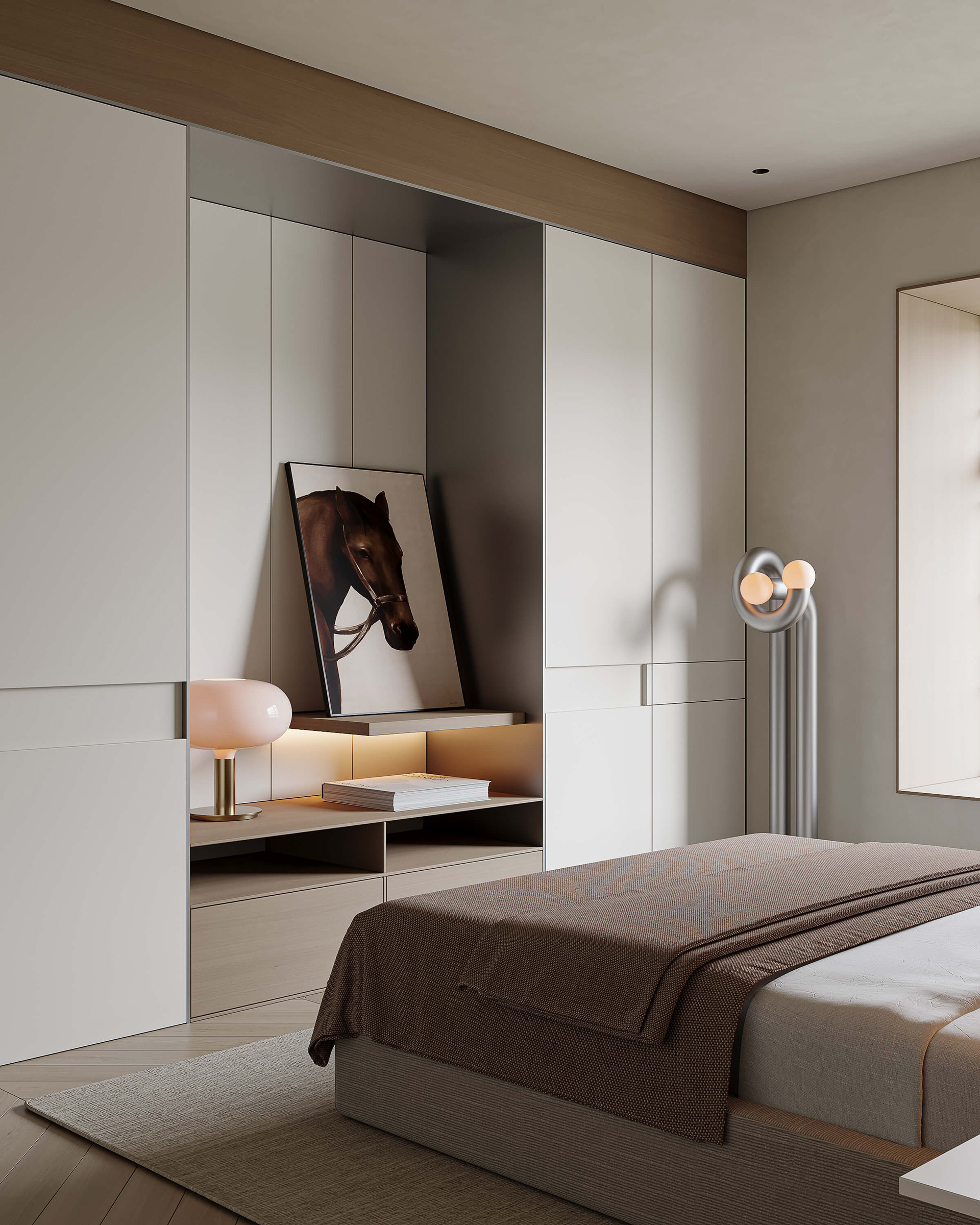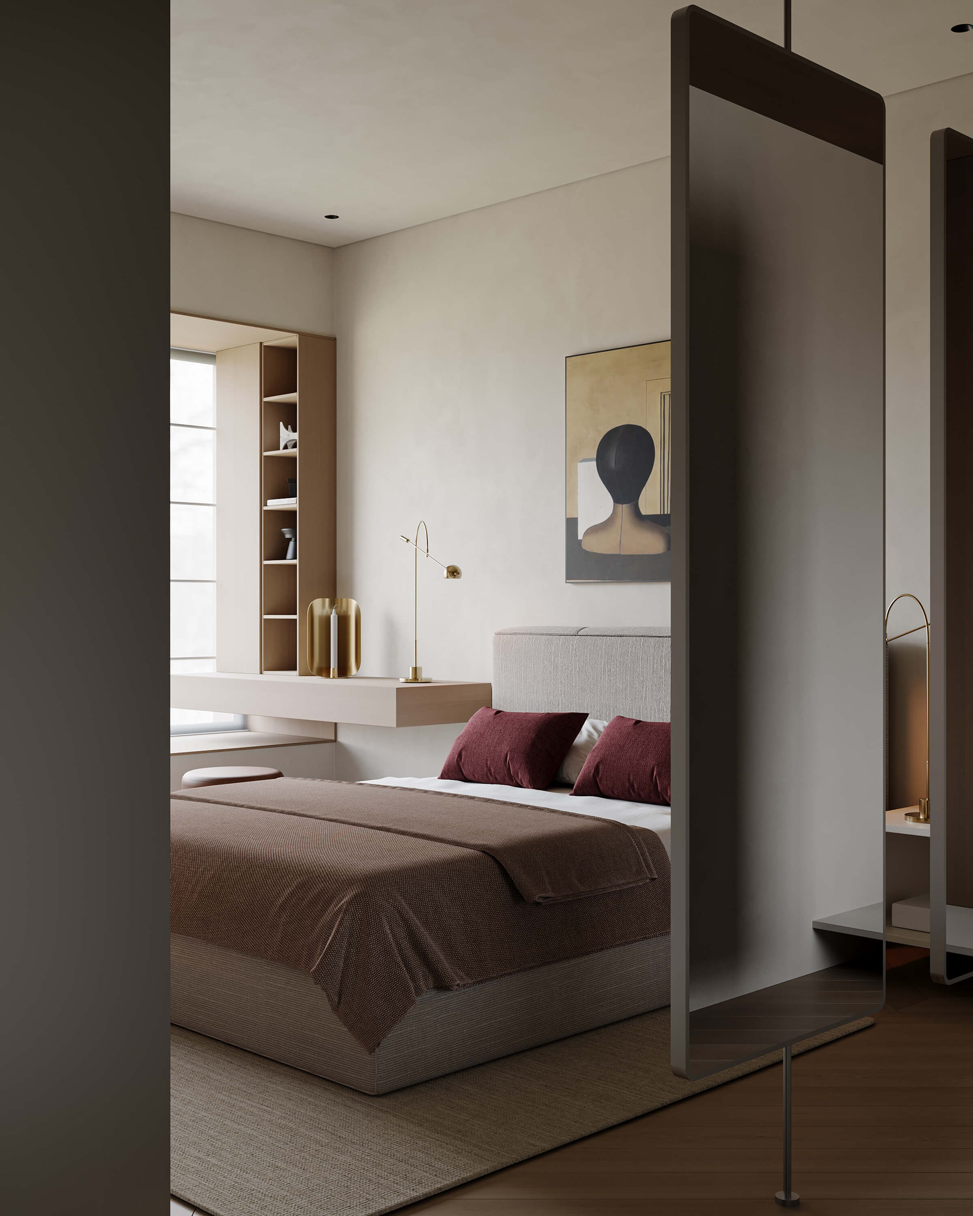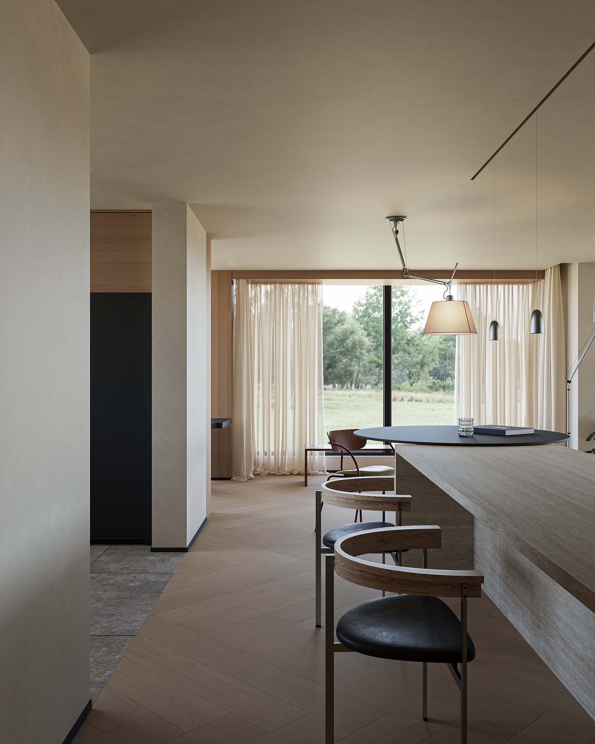 A restrained palette of light timber, neutral wall finishes, and stone surfaces is applied consistently across the interior, reinforcing material continuity and visual calm. Custom joinery integrates storage, seating, and display functions into the architecture, allowing walls to remain clean and uninterrupted.