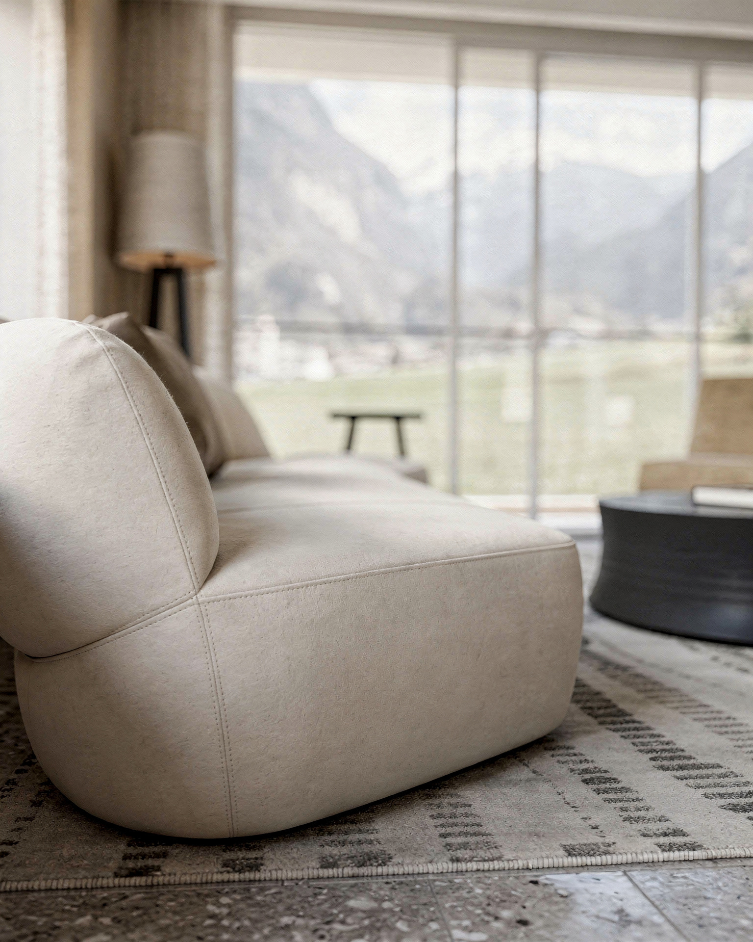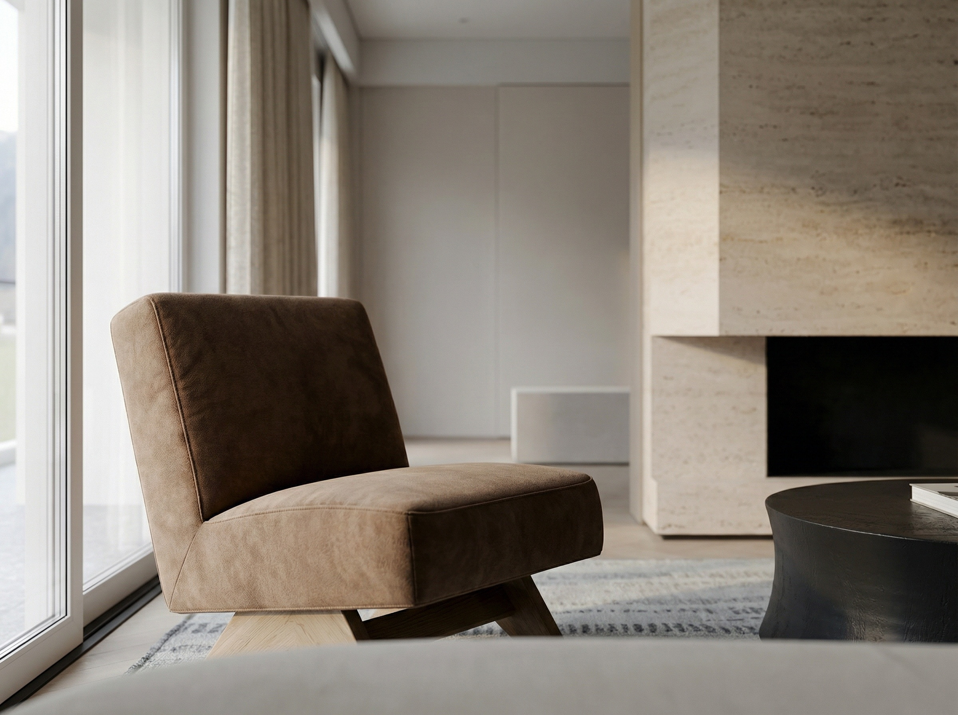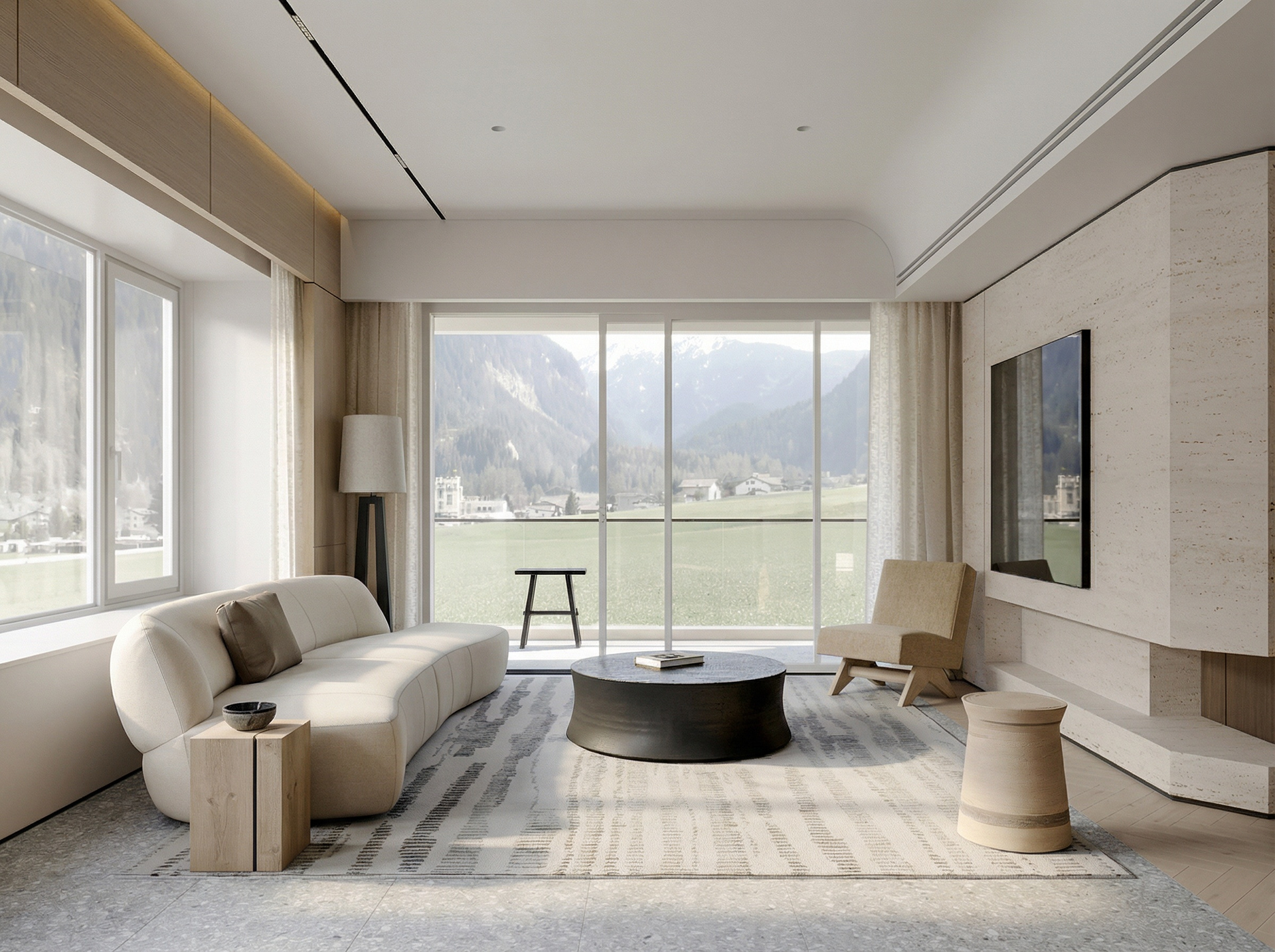 Large windows bring abundant natural light into the space and establish a strong visual connection with the surrounding landscape. Overall, the design reflects a contemporary and refined approach focused on materiality, clarity, and spatial balance.