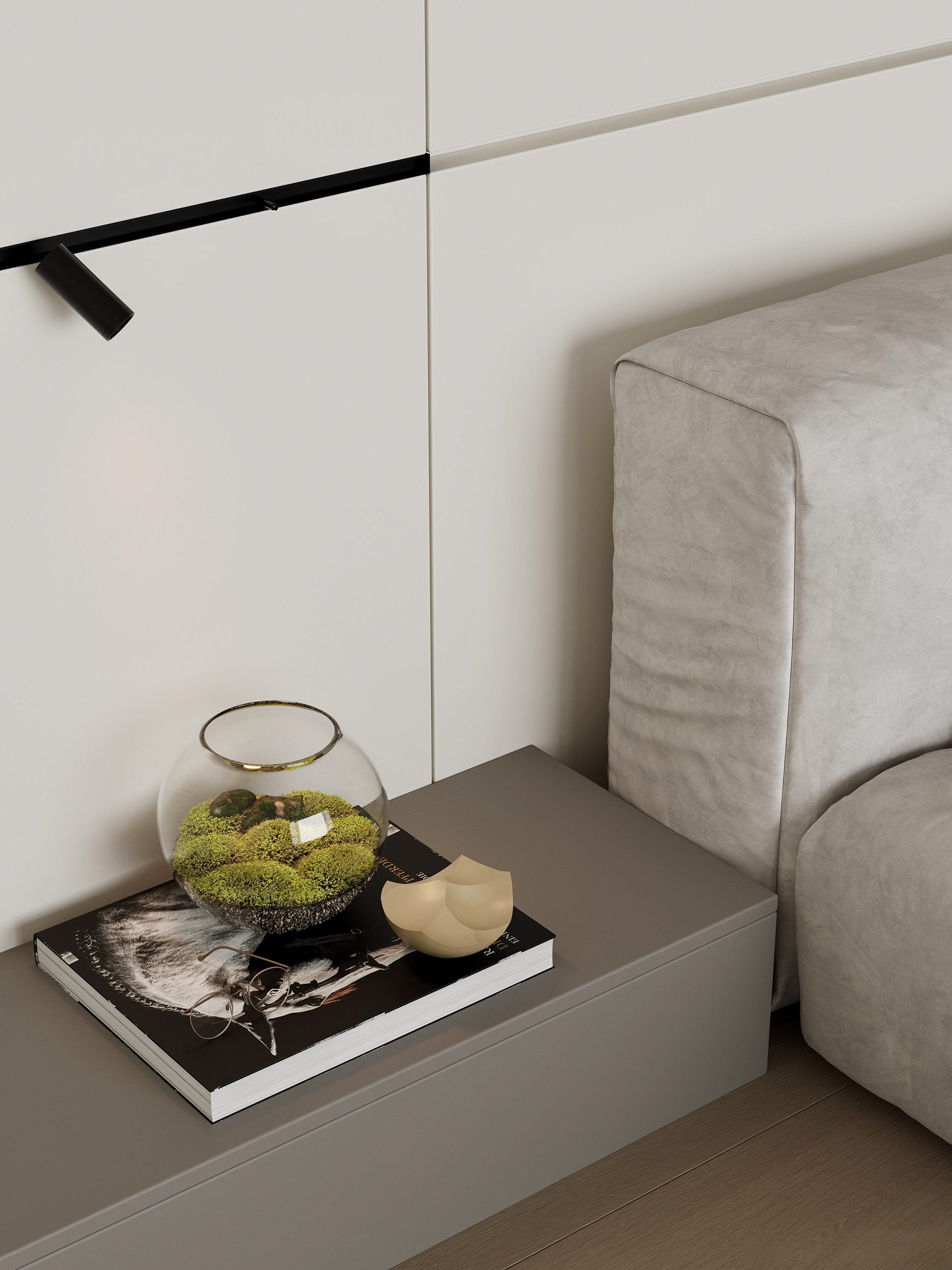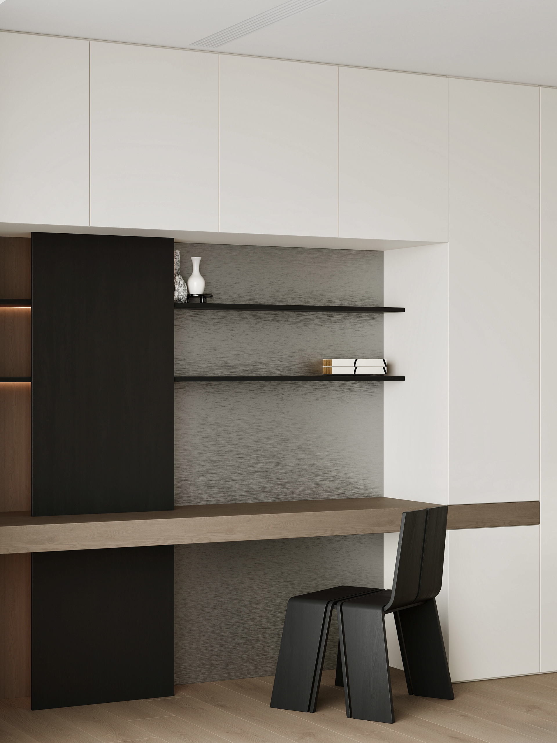 The bedroom continues the open and minimalist language of the main living space. The design maintains a cohesive material palette of soft neutrals, light oak wood, and subtle black accents, creating visual continuity throughout the interior. Clean lines, integrated storage, and carefully selected textures enhance the sense of calm and balance.