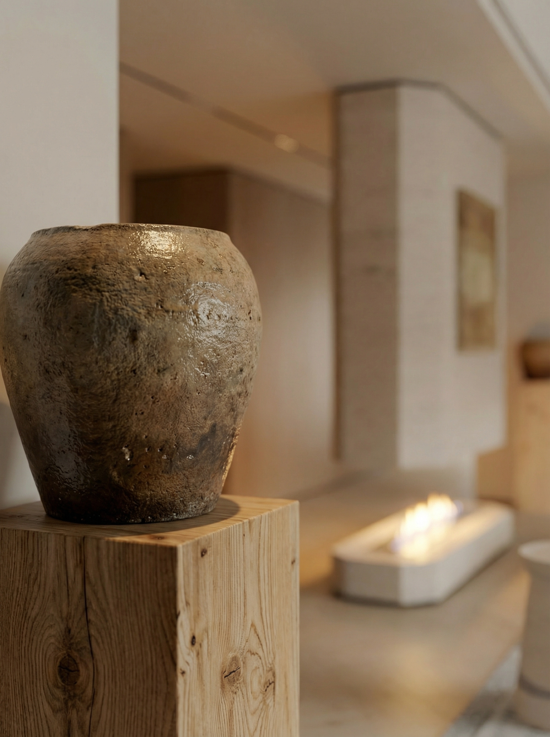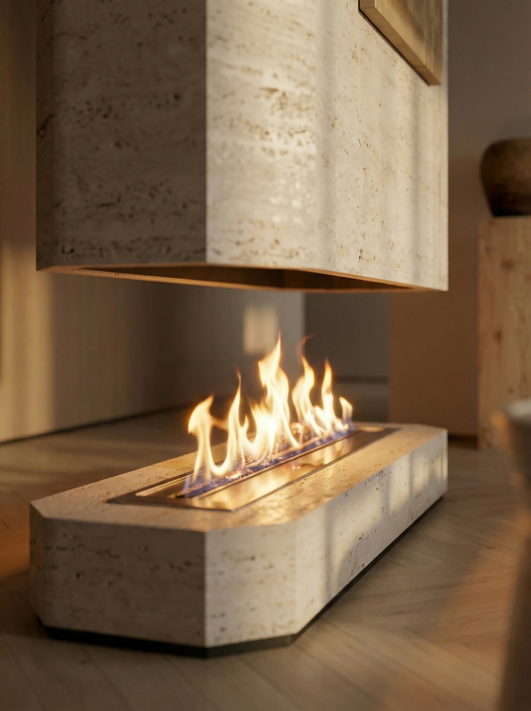 A travertine fireplace acts as the central architectural focal point, complemented by a linear bioethanol flame that adds warmth and subtle movement. The dining area is defined by a round black table with a fluted base, surrounded by solid wood chairs with woven seats, highlighting craftsmanship and texture.