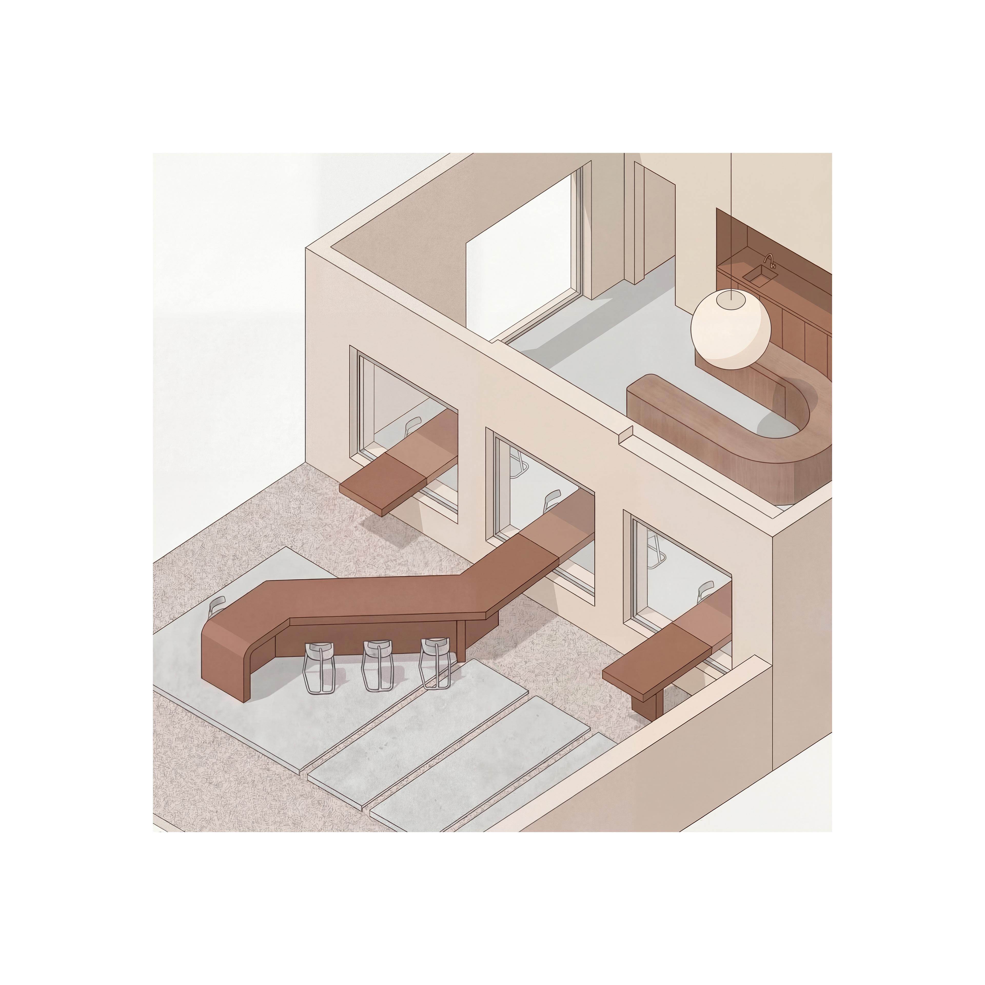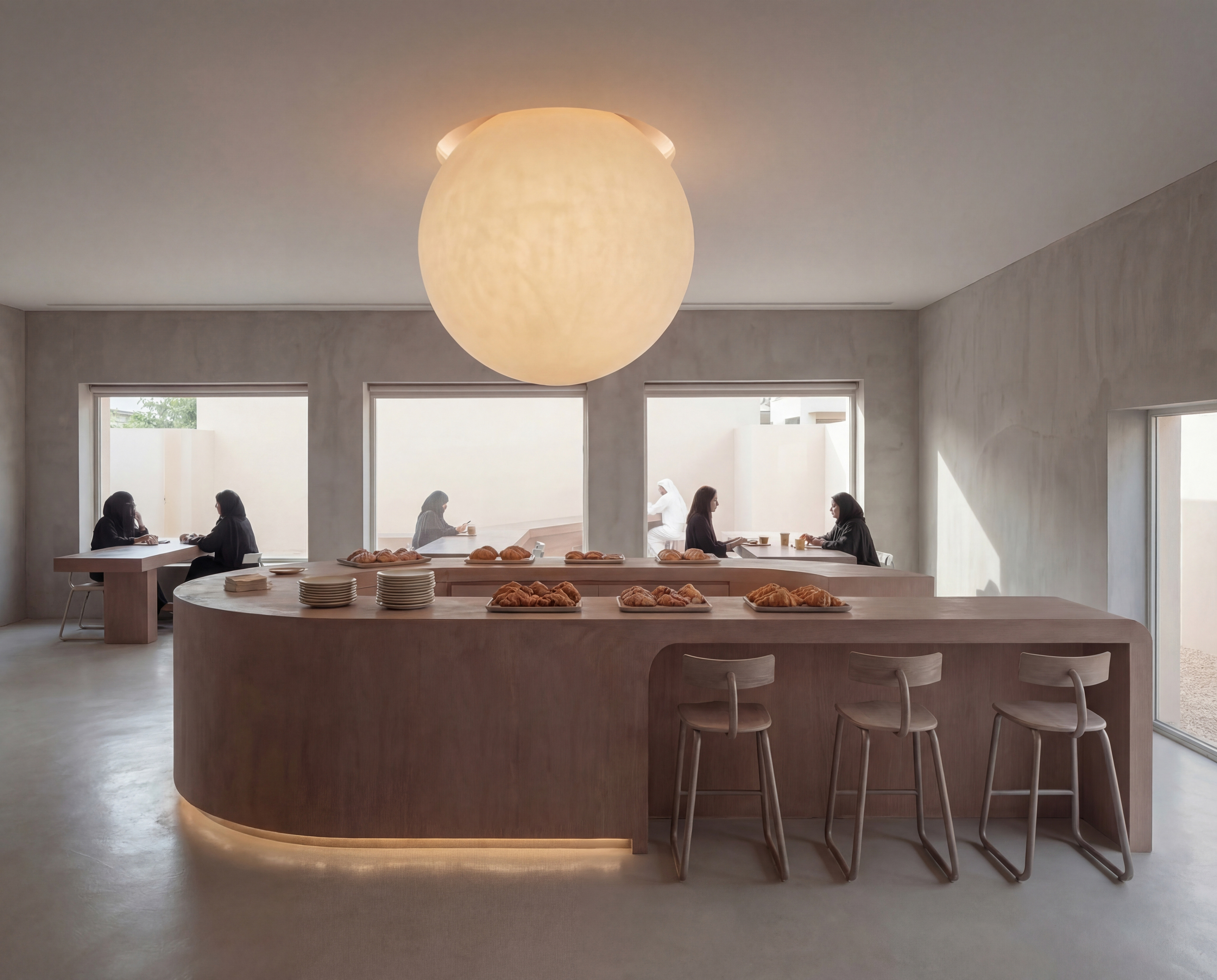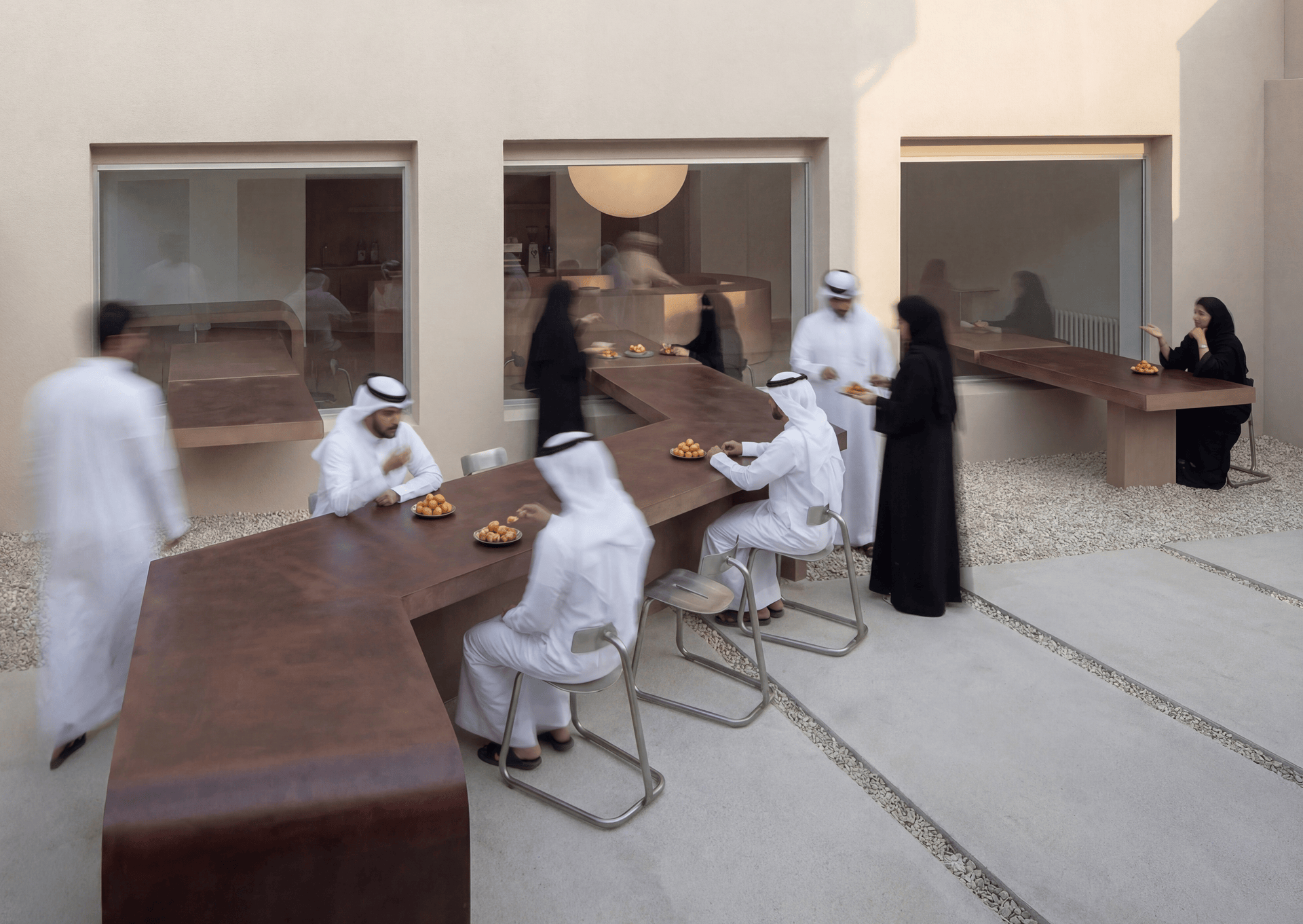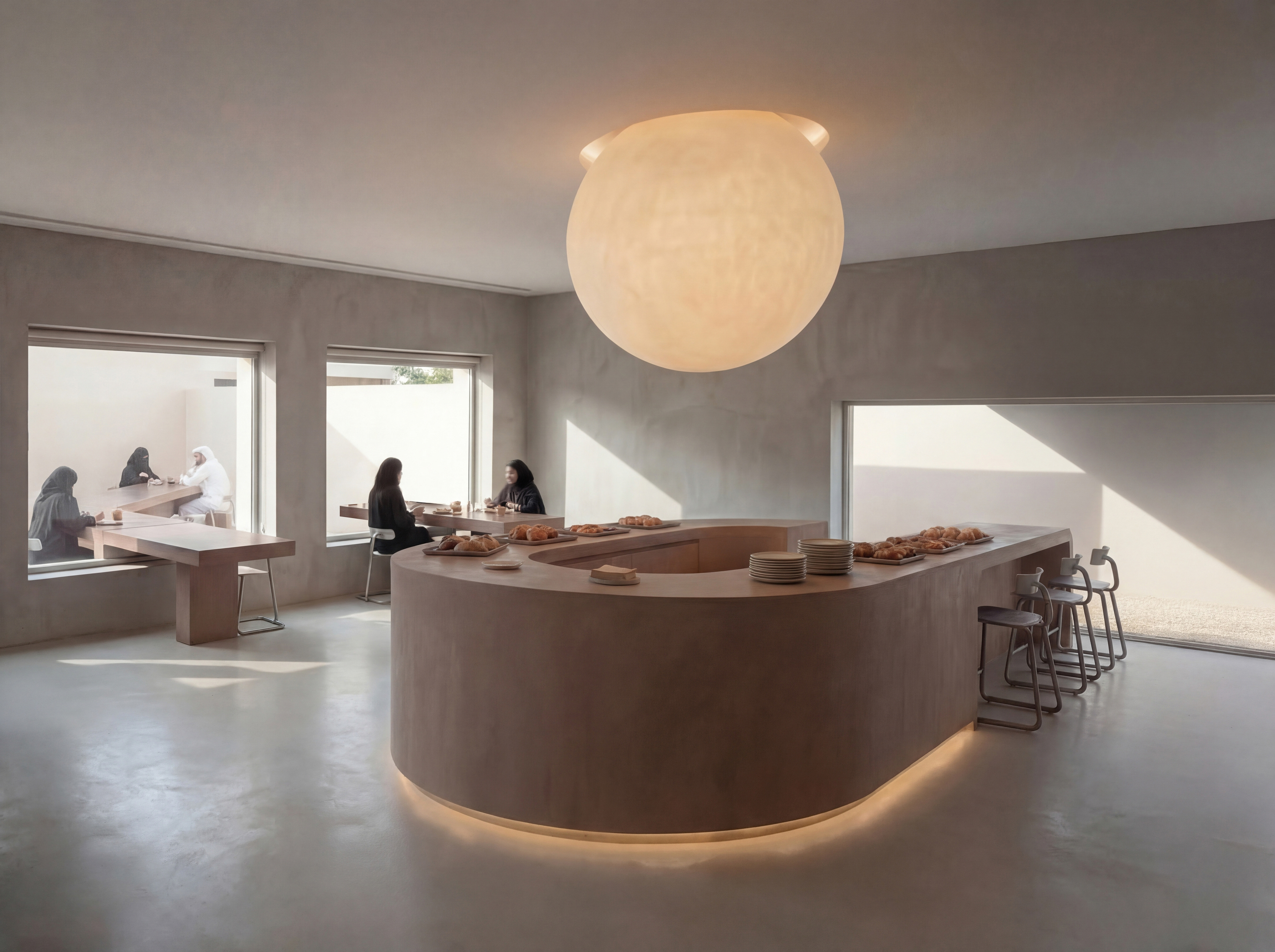 This café and bakery is inspired by traditional UAE desserts such as luqaimat, reinterpreted through a contemporary spatial experience. The concept is centered around sharing, not only desserts, but moments. Instead of isolated tables, a continuous surface connects the interior with the exterior, encouraging people to sit close, interact, and feel part of a collective experience. Through its layout and spatial flow, the design creates a sense of togetherness, where enjoying dessert becomes a shared moment within a continuous experience.