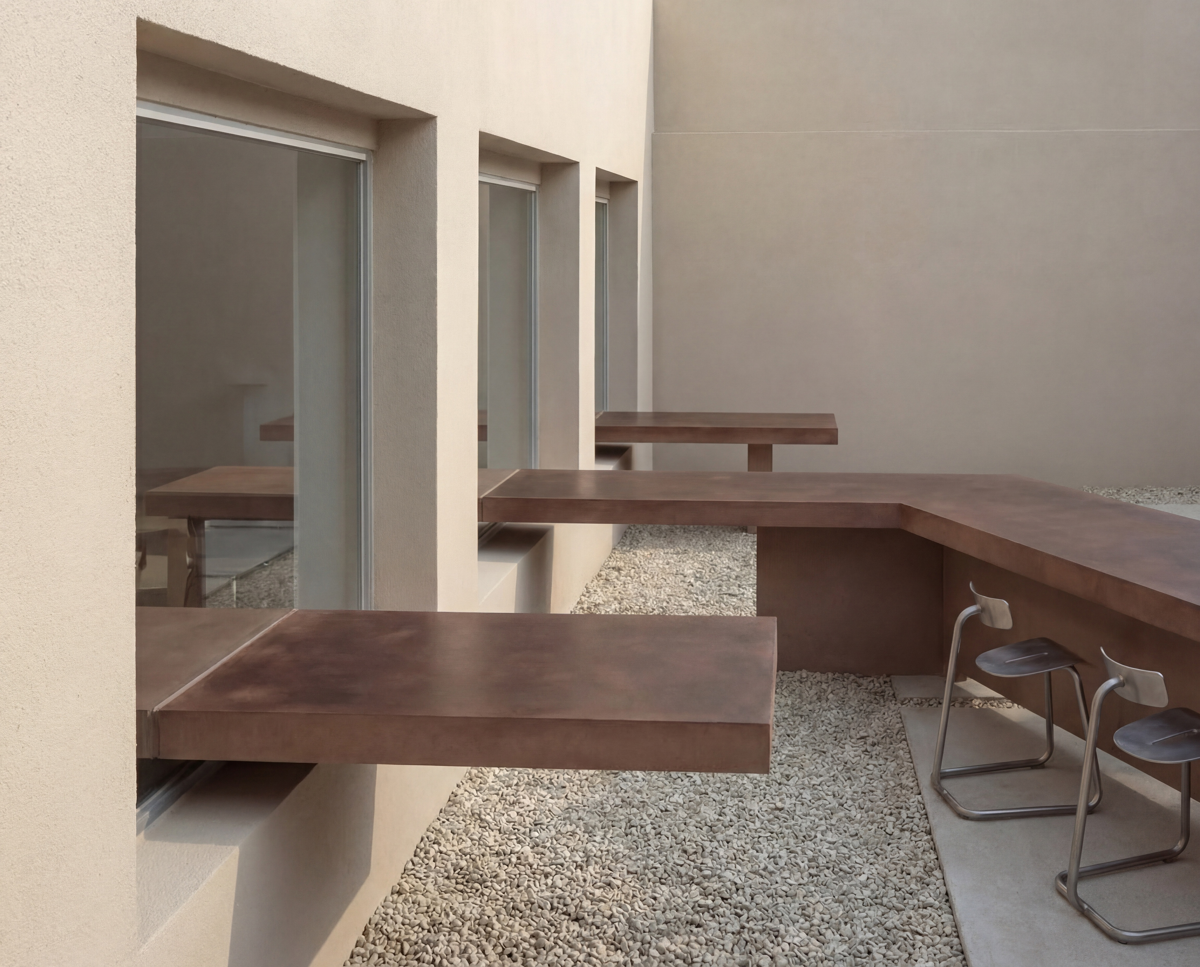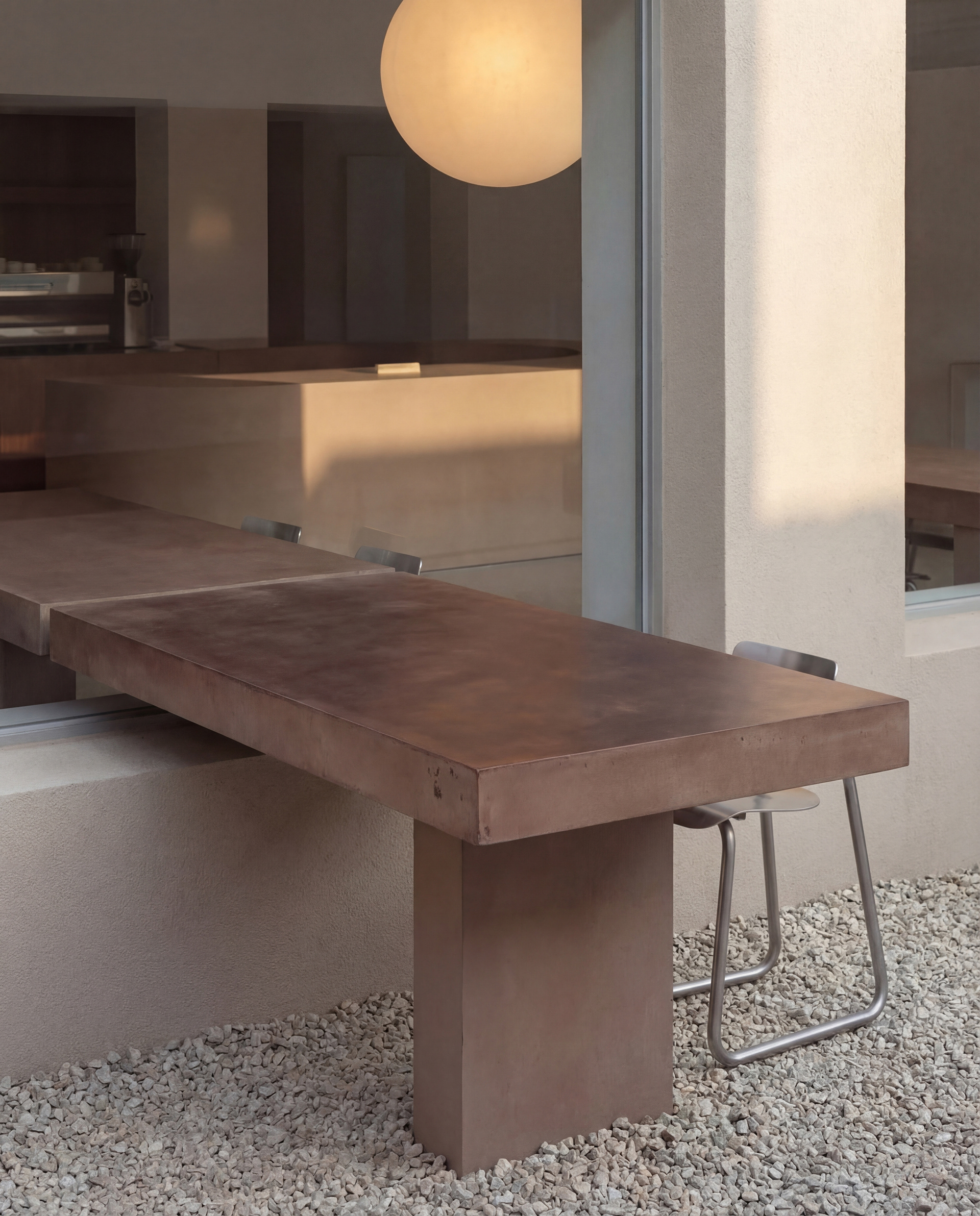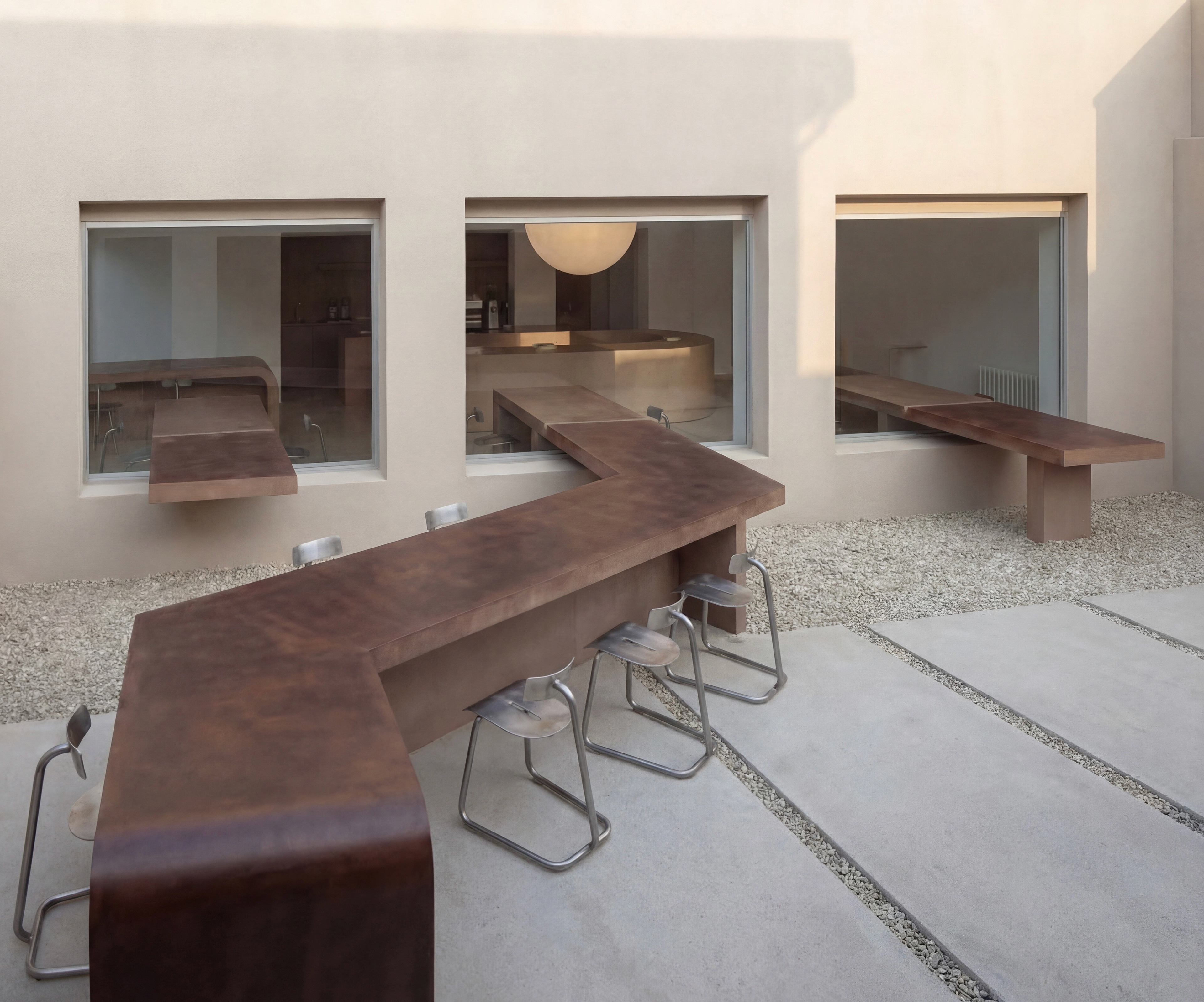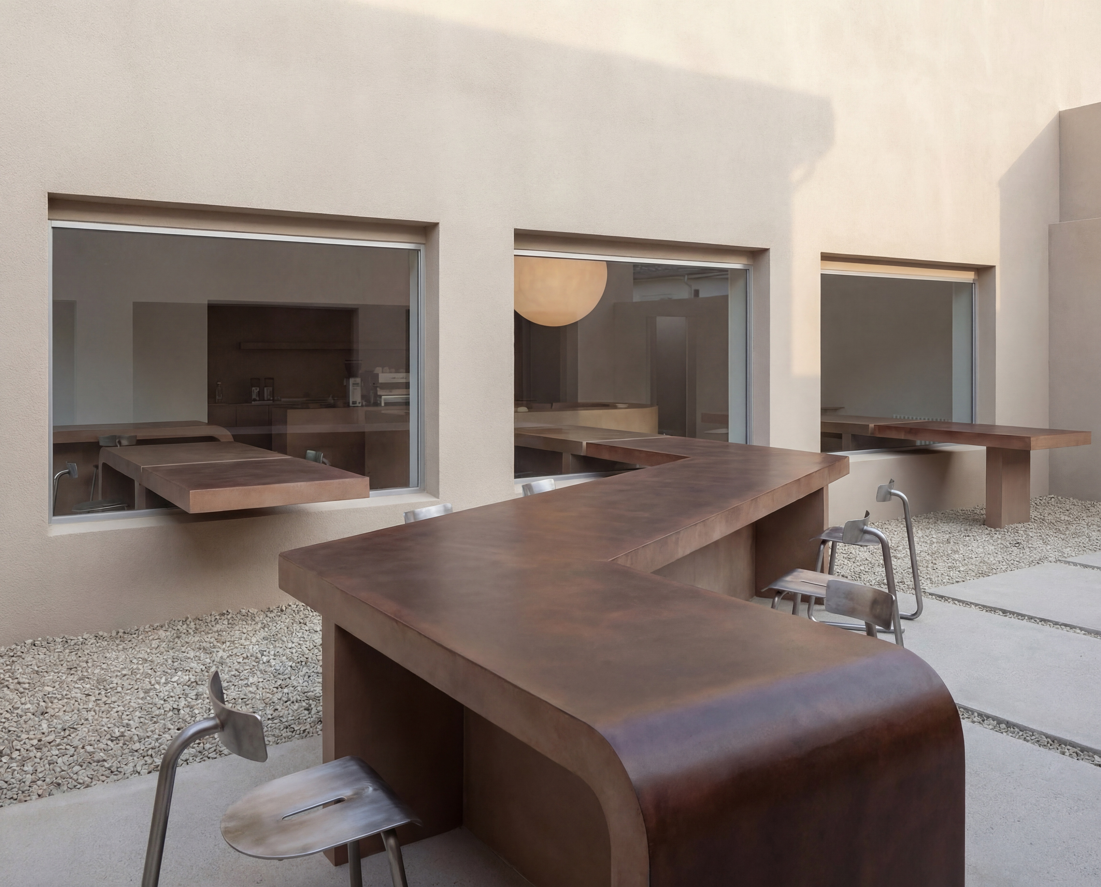 This café and bakery is inspired by traditional UAE desserts such as luqaimat, reinterpreted through a contemporary spatial experience. The concept is centered around sharing, not only desserts, but moments. Instead of isolated tables, a continuous surface connects the interior with the exterior, encouraging people to sit close, interact, and feel part of a collective experience. Through its layout and spatial flow, the design creates a sense of togetherness, where enjoying dessert becomes a shared moment within a continuous experience.