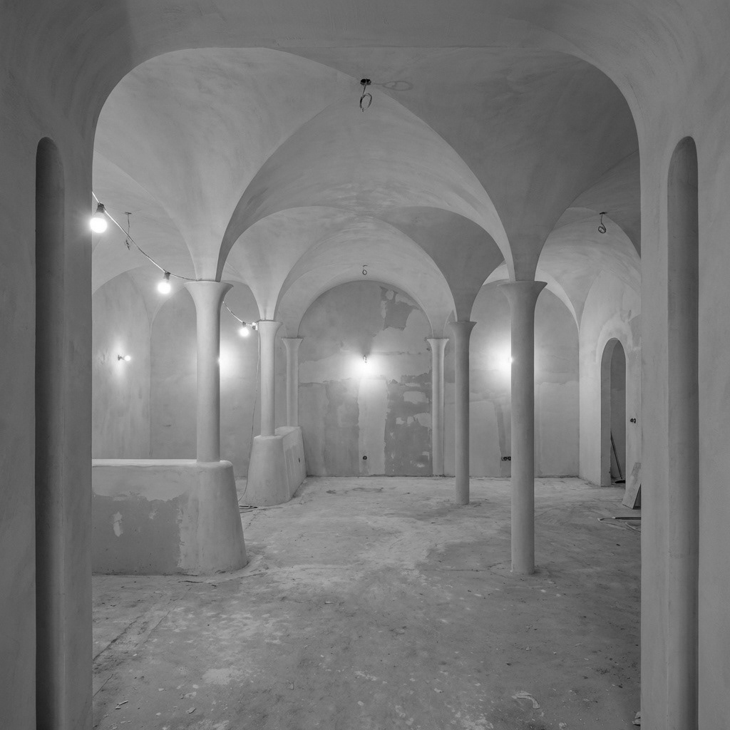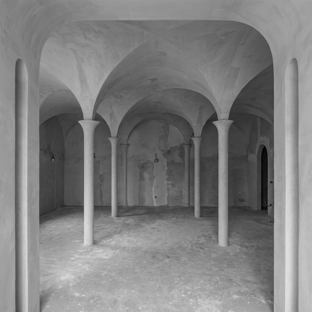 The vaulted ceilings amplify this concept, allowing light to spread smoothly across the curved surfaces, much like a flame reflecting within a sheltered space. The result is an atmosphere where light feels contained, calm, and alive, rather than projected.