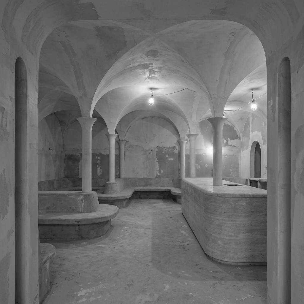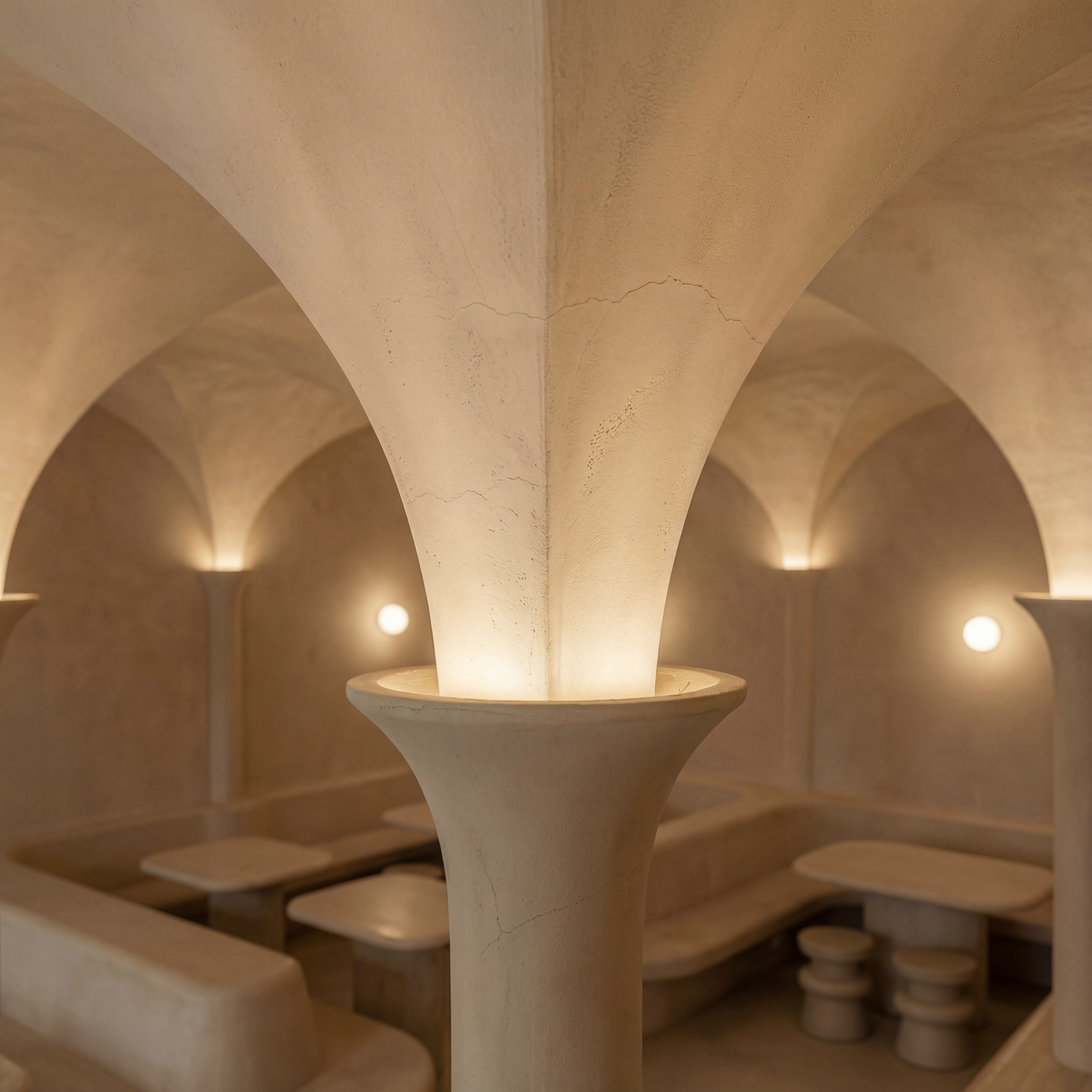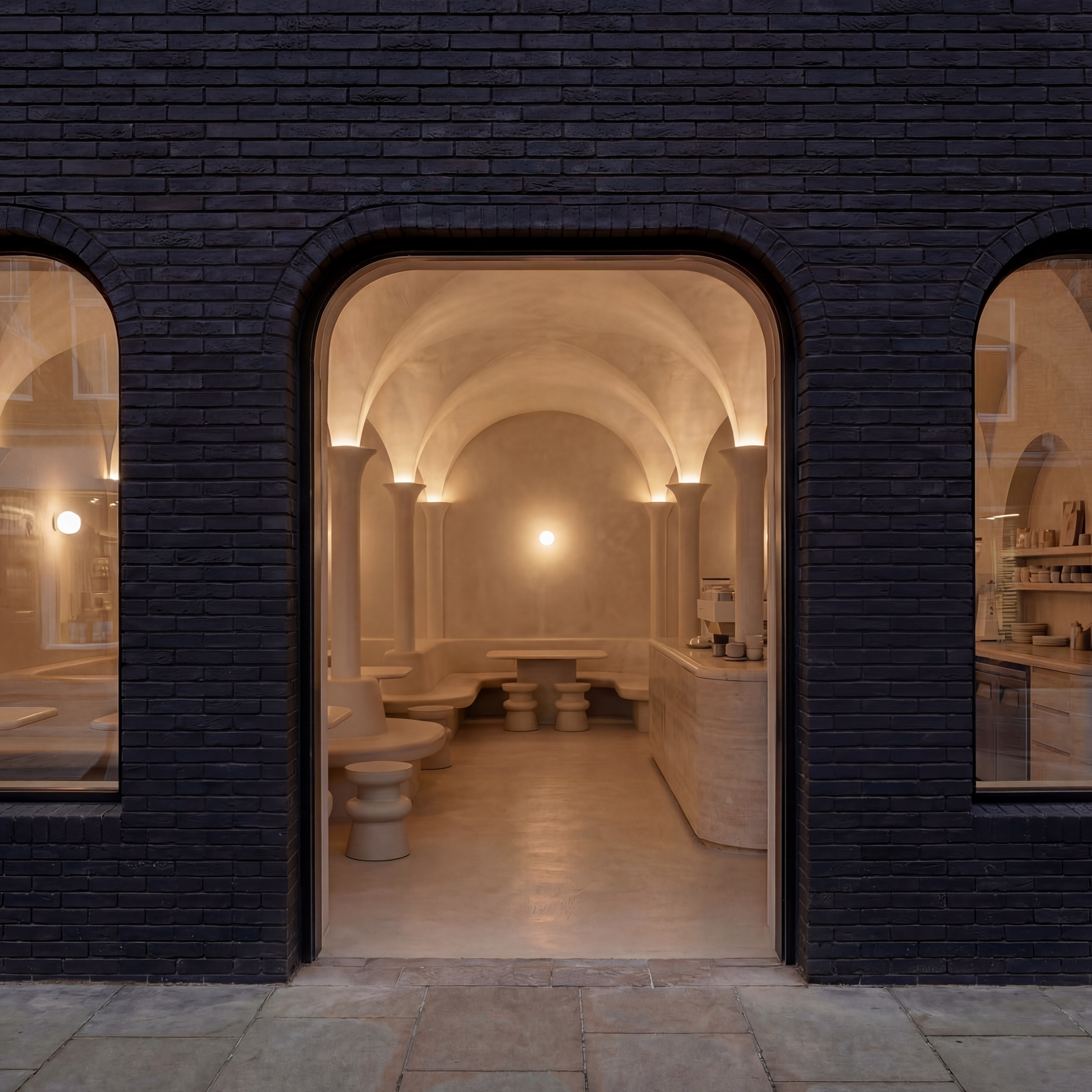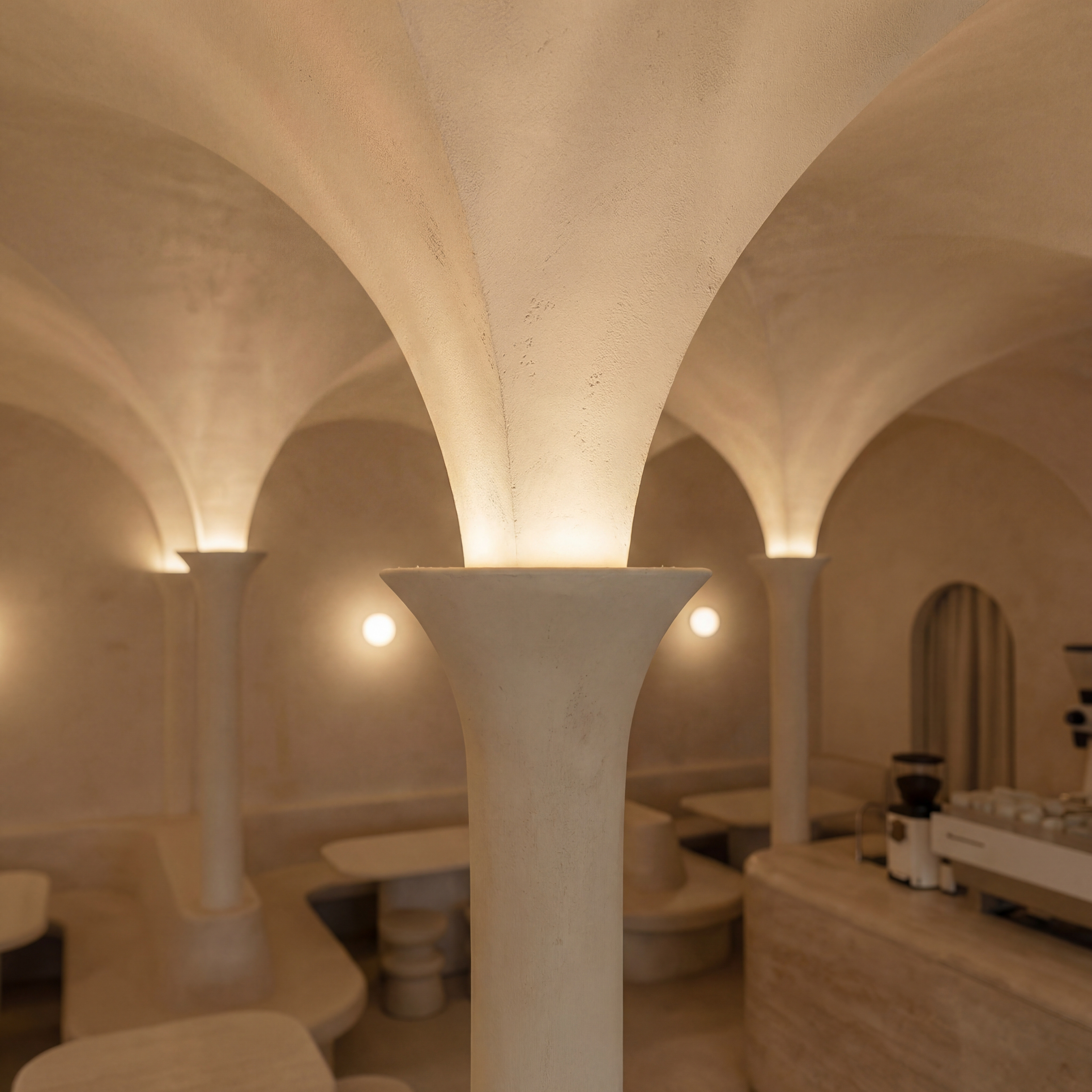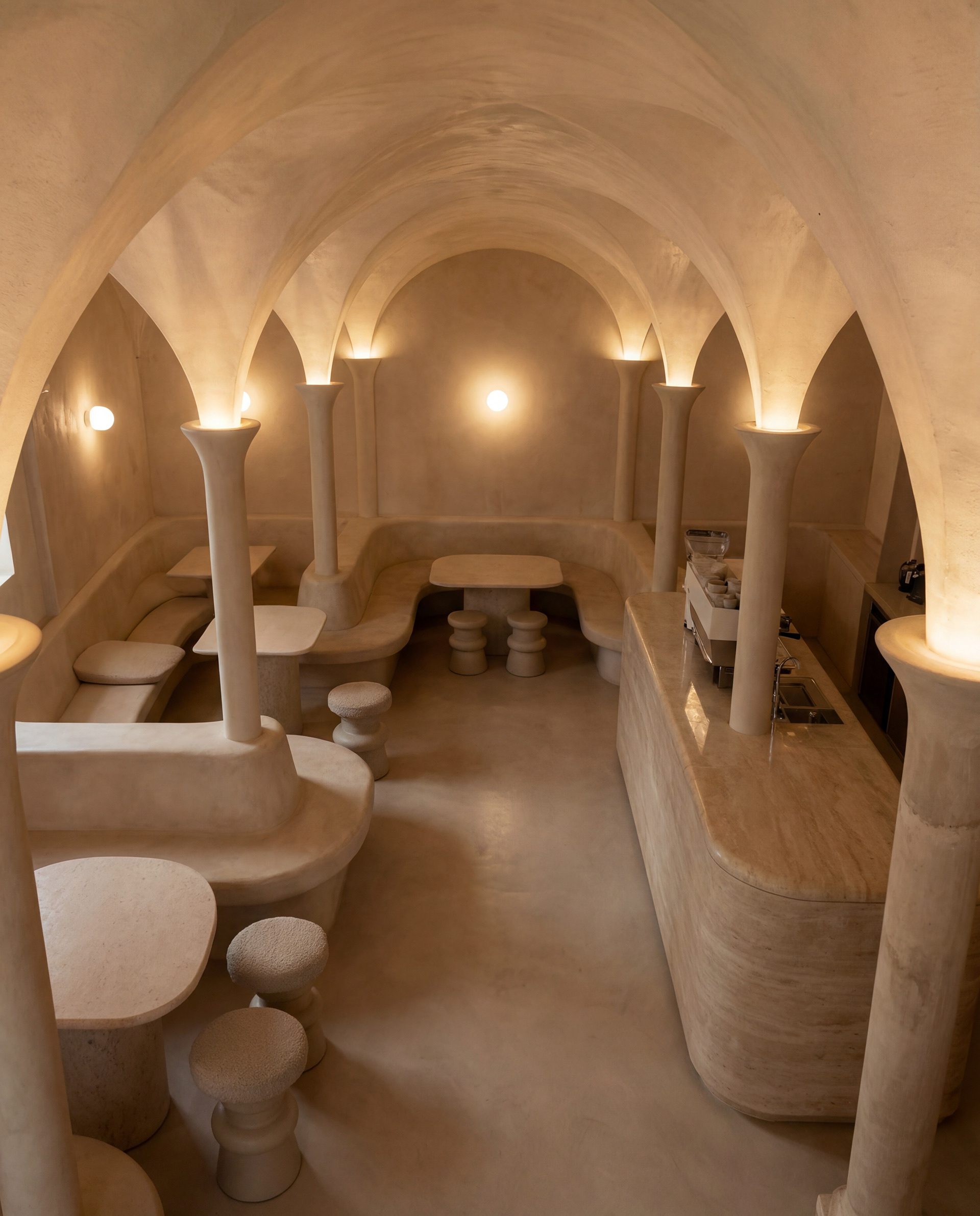 The material palette, monolithic, mineral, and warm-toned—reinforces this idea of stillness and permanence, echoing the solidity of wax while allowing light to become the primary expressive element. Seating, counters, and built-in furniture are shaped as continuous, carved forms, enhancing the sense of flow and softness throughout the interior.