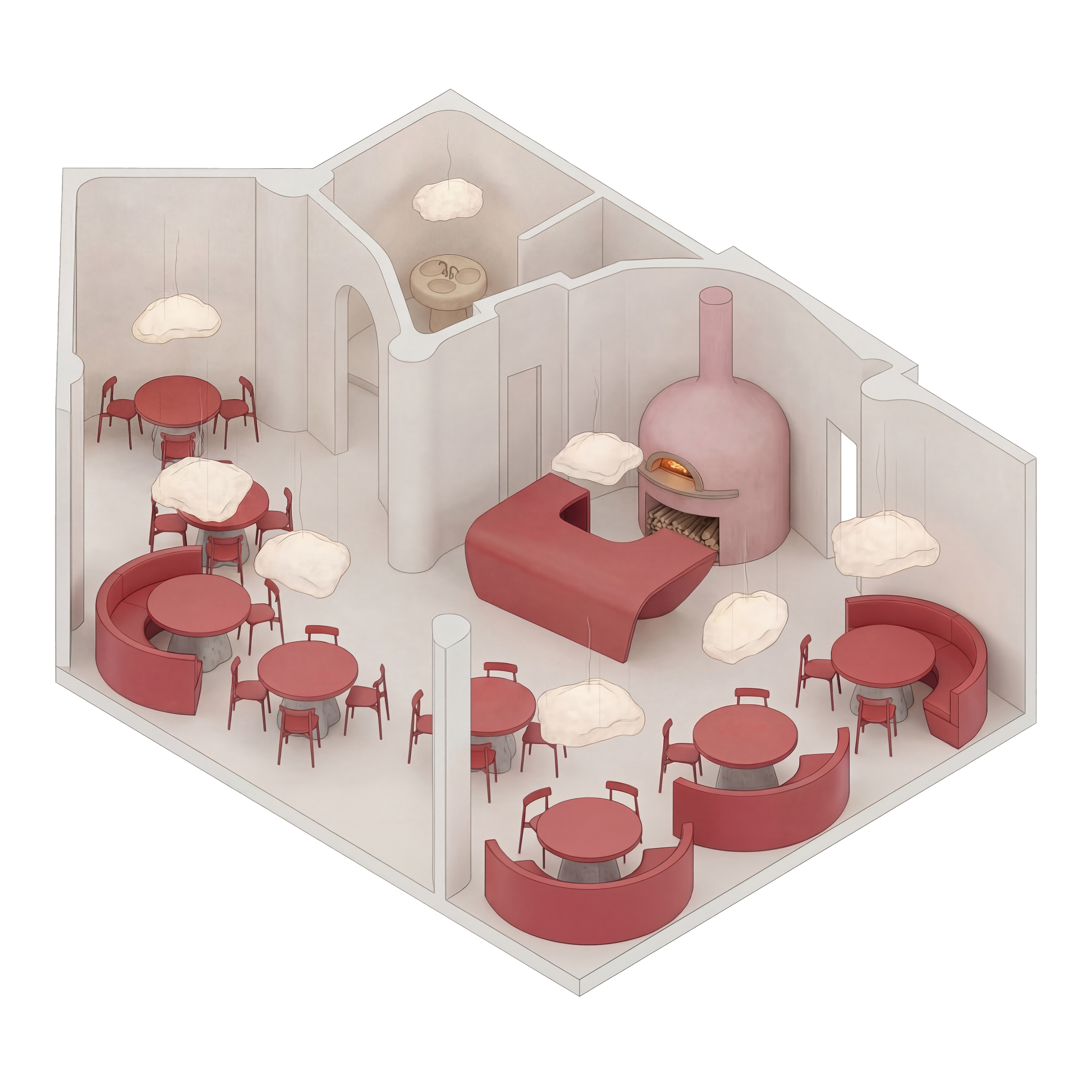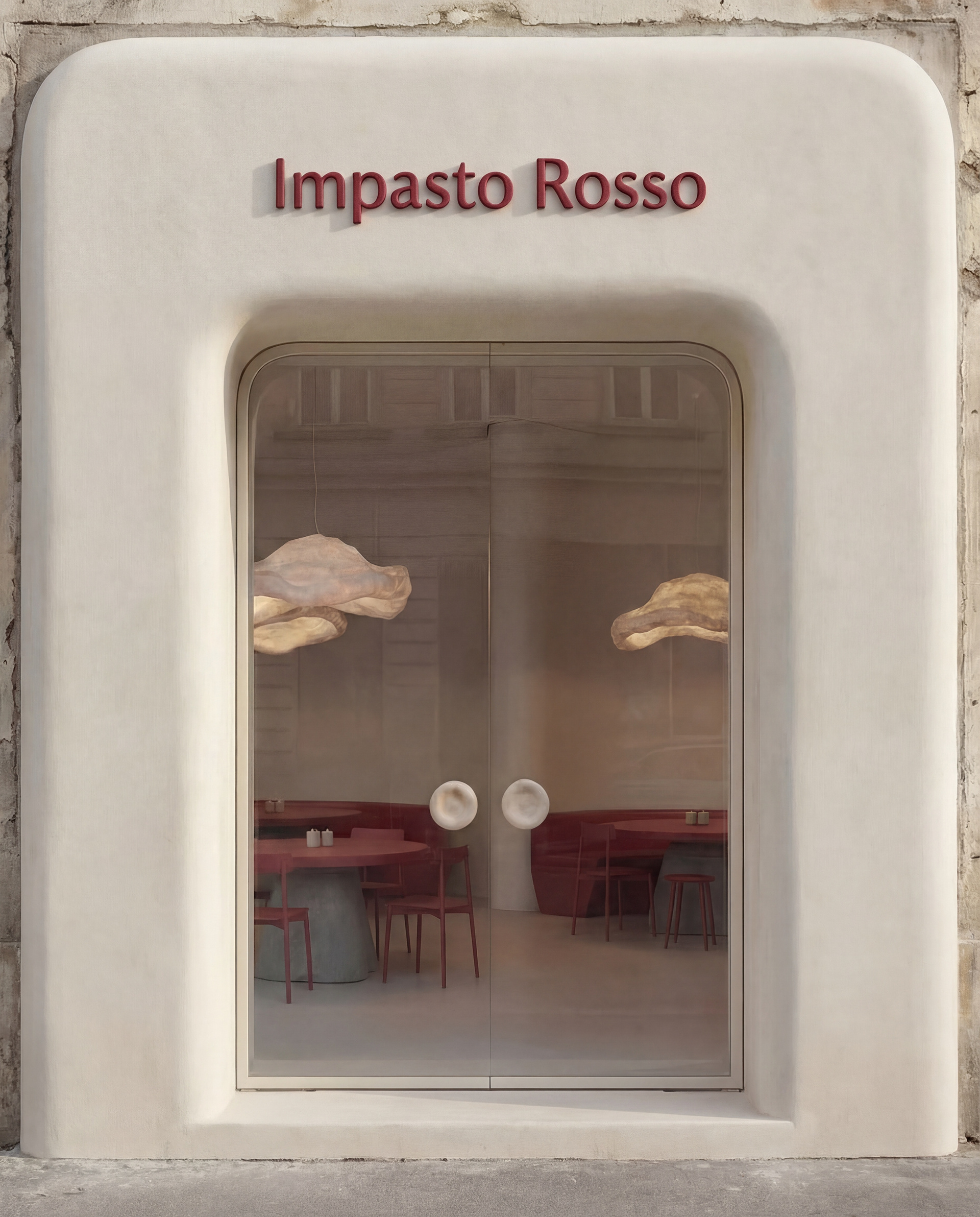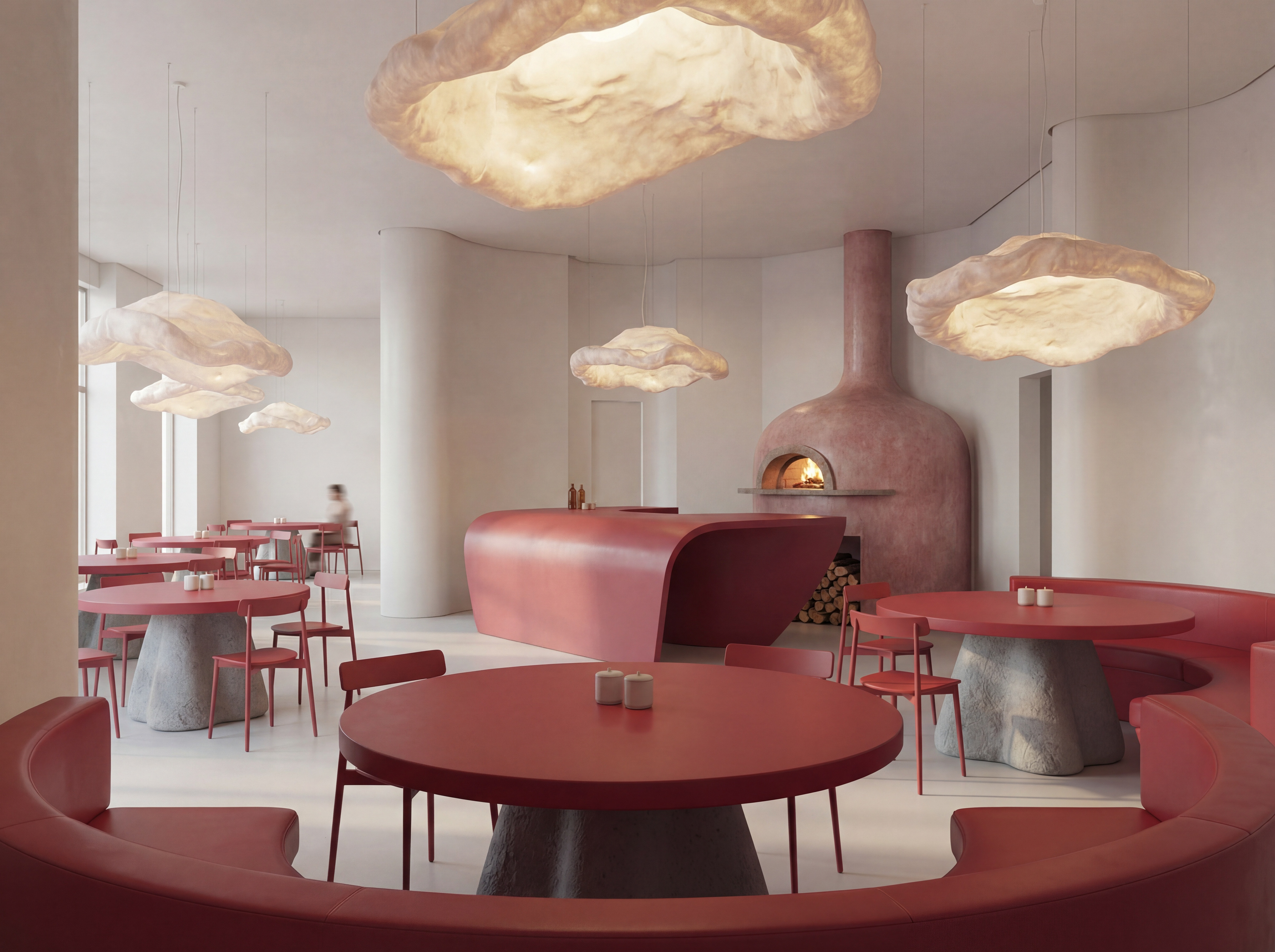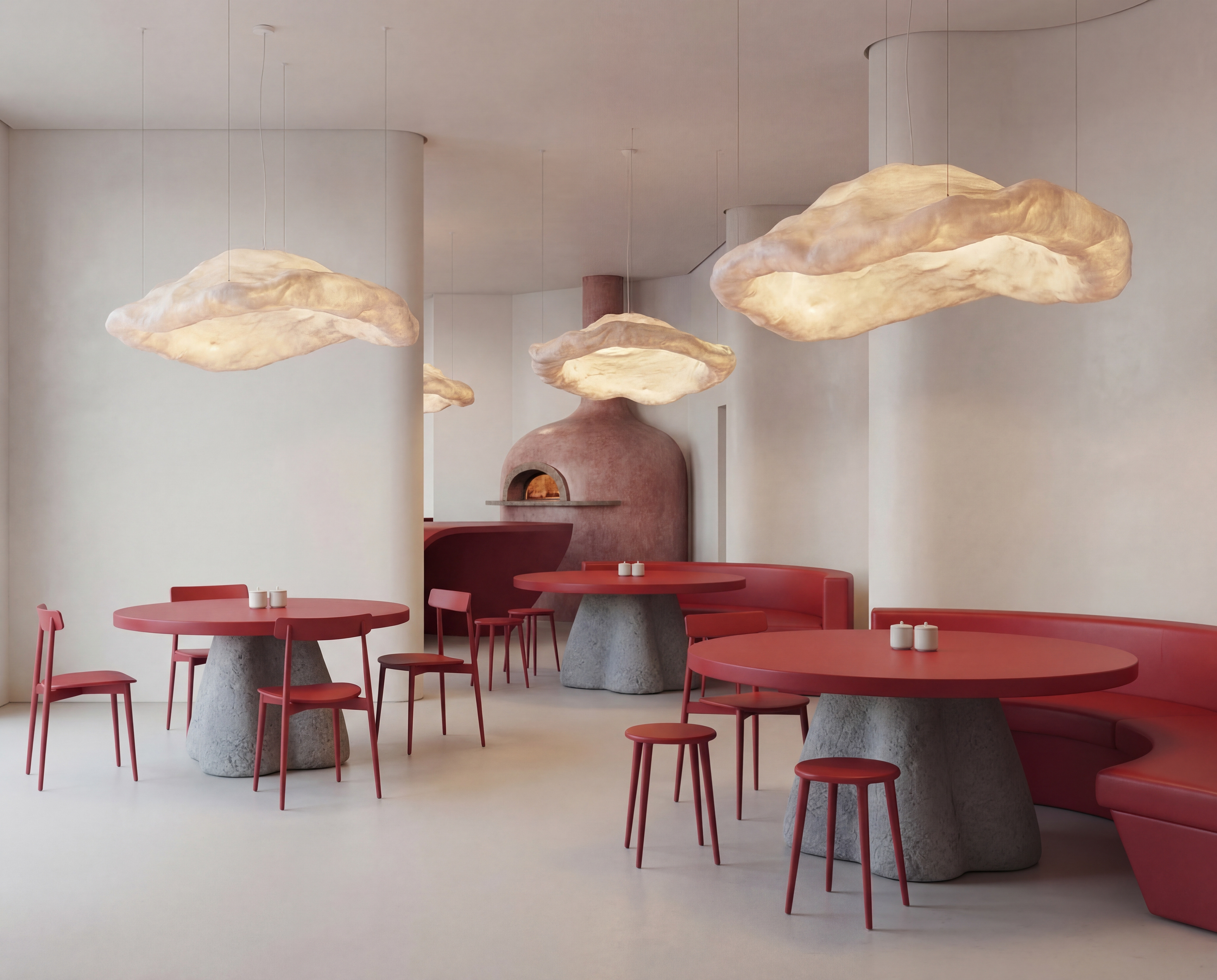 The Impasto Rosso's design is inspired by the process of making pizza, capturing the exact moment when the dough is thrown into the air and translating it into suspended lighting elements, as if frozen in time. This gesture becomes the central narrative of the space, while other ingredients such as sauce and mushrooms inform the warm tones and tactile materiality. Through soft, curved geometries and inflated volumes, the project explores the relationship between material, form, and sensory experience.