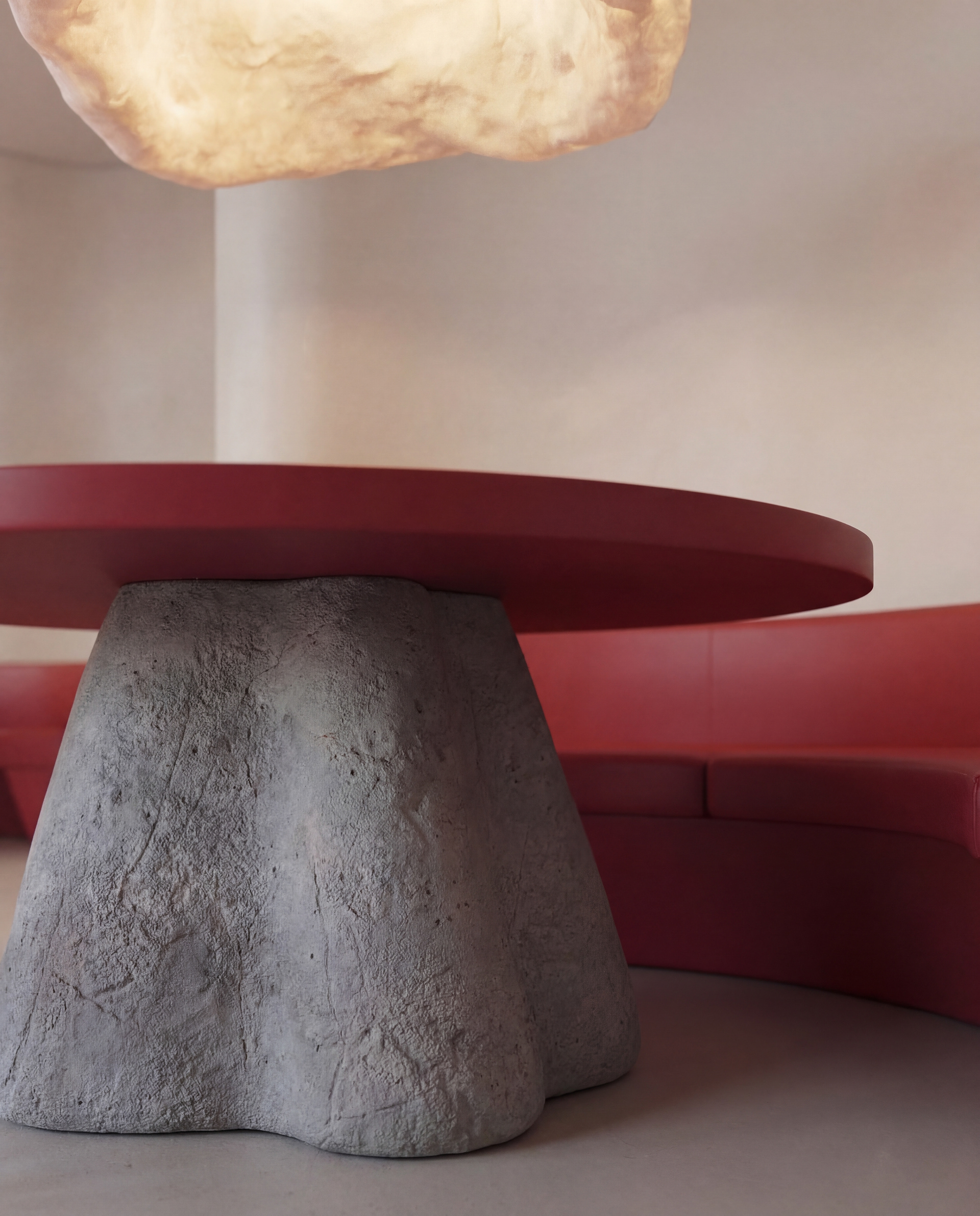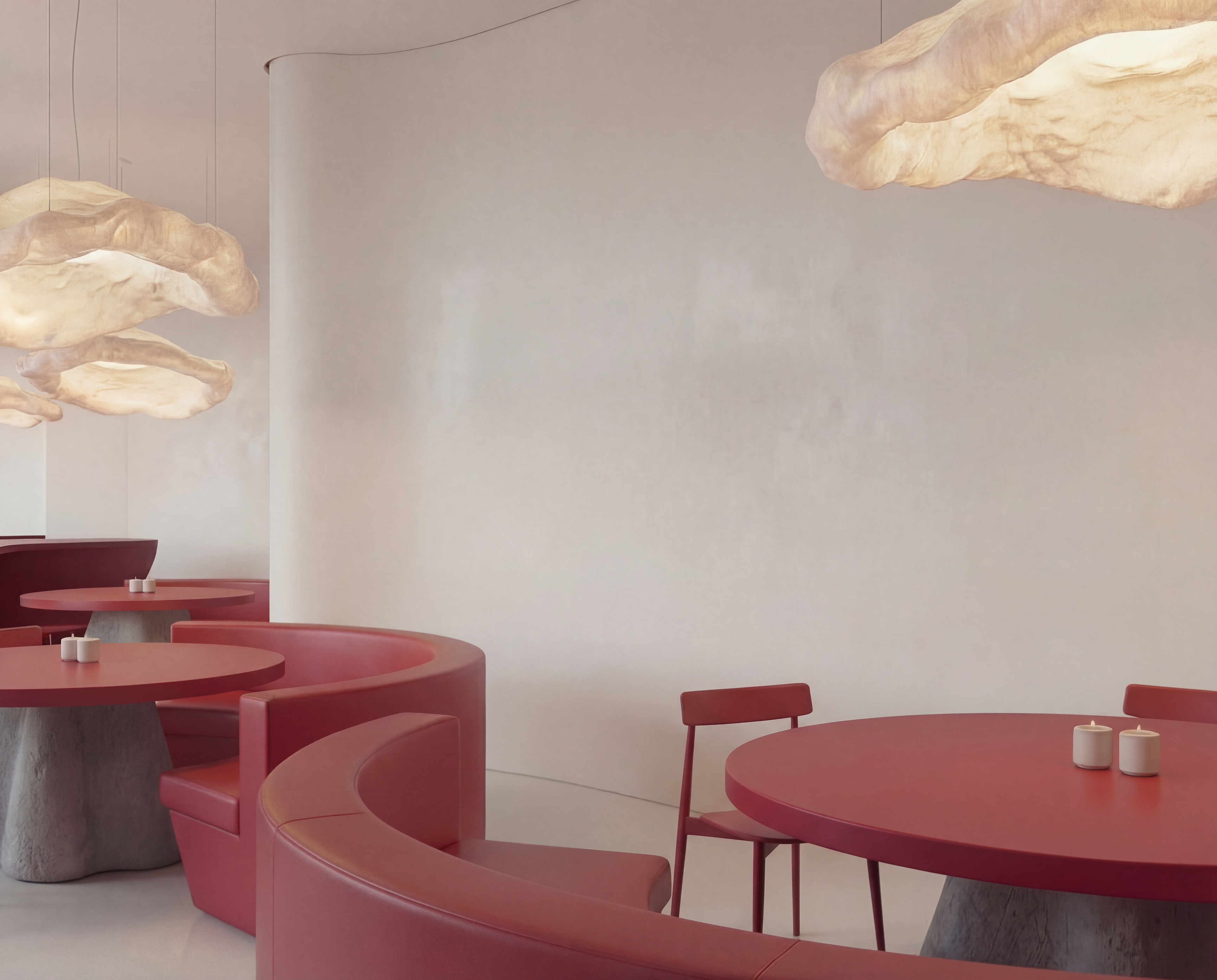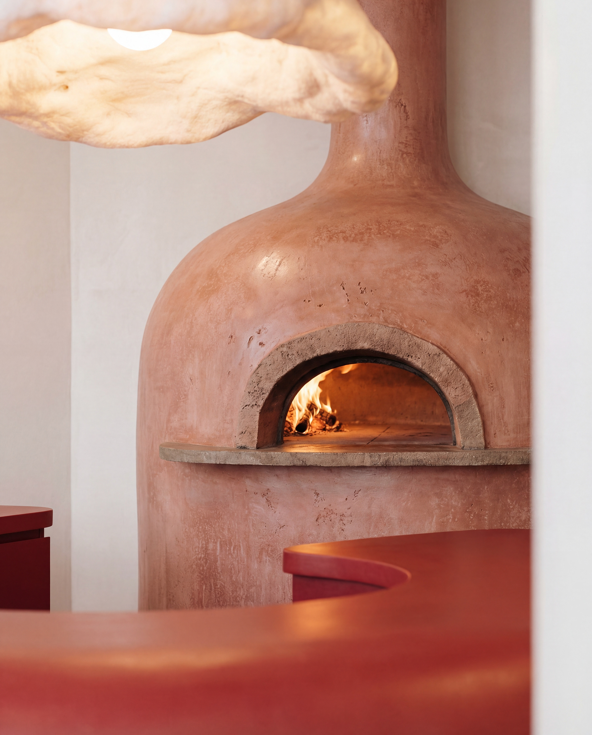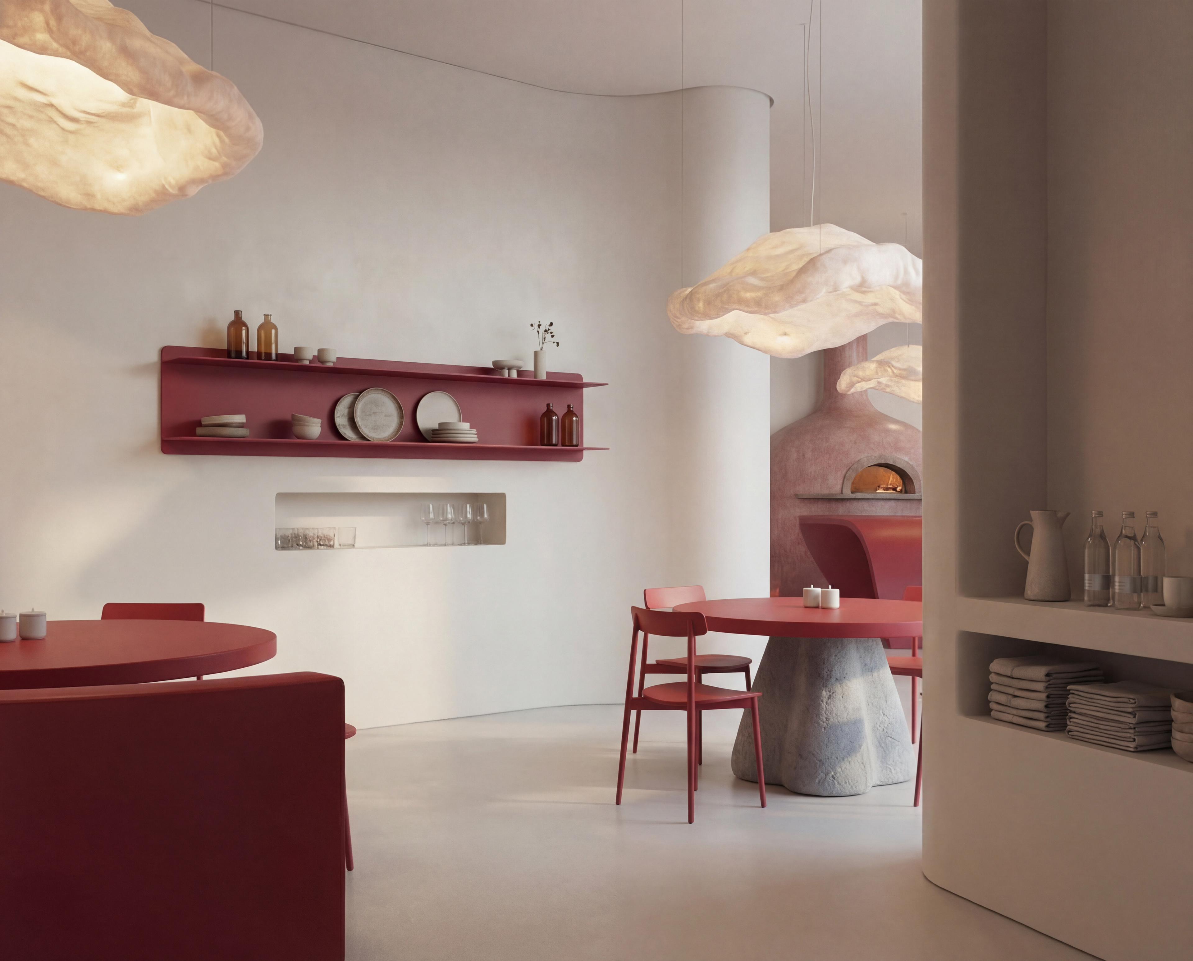 The Impasto Rosso's design is inspired by the process of making pizza, capturing the exact moment when the dough is thrown into the air and translating it into suspended lighting elements, as if frozen in time. This gesture becomes the central narrative of the space, while other ingredients such as sauce and mushrooms inform the warm tones and tactile materiality. Through soft, curved geometries and inflated volumes, the project explores the relationship between material, form, and sensory experience.