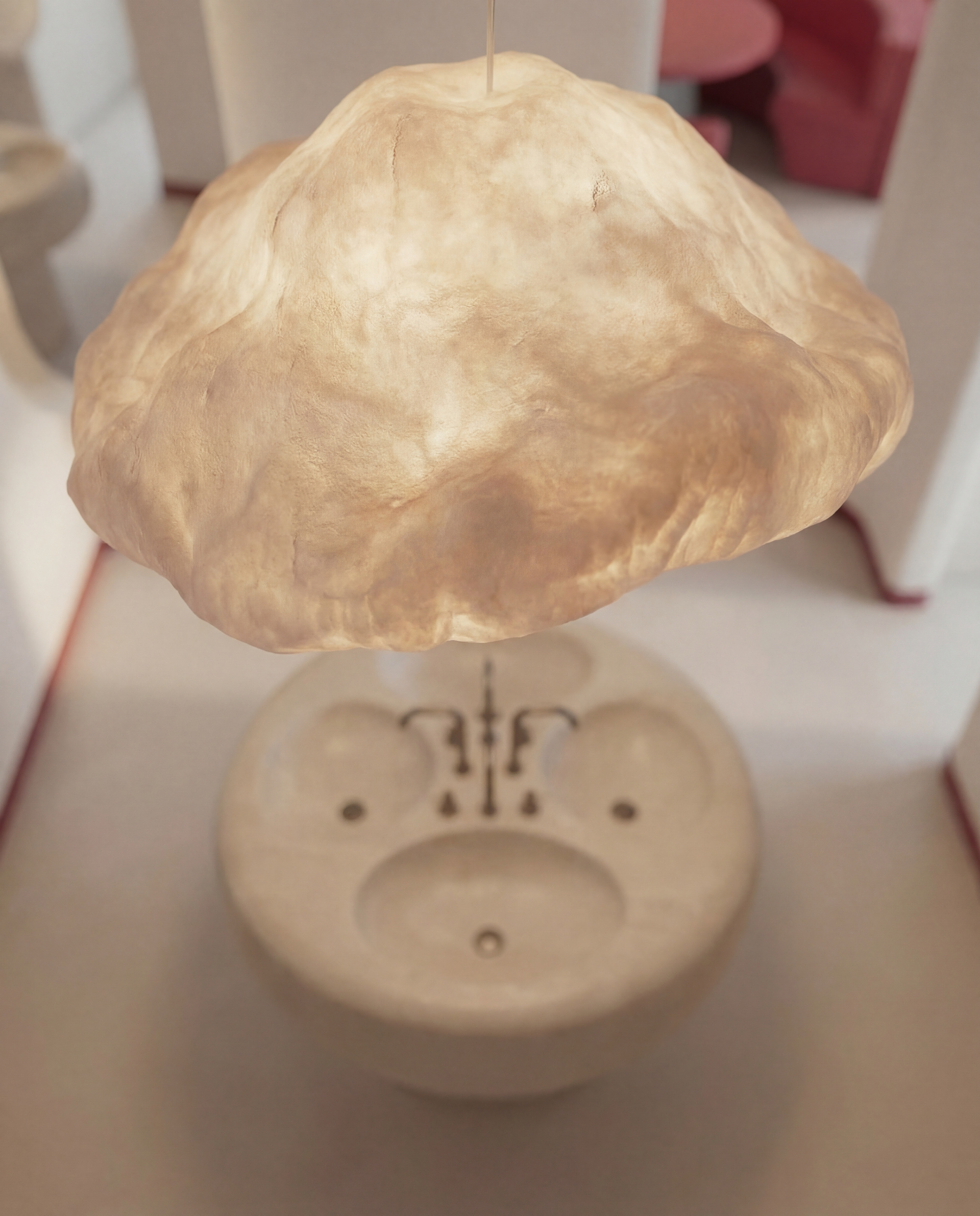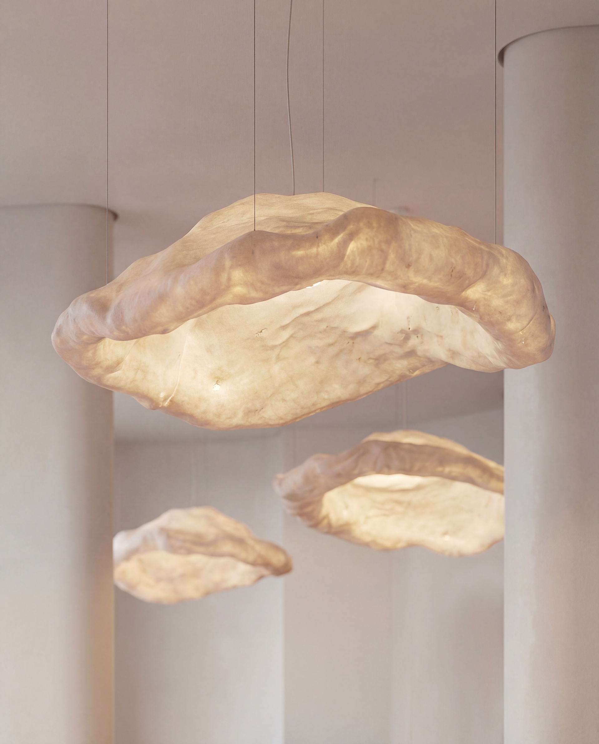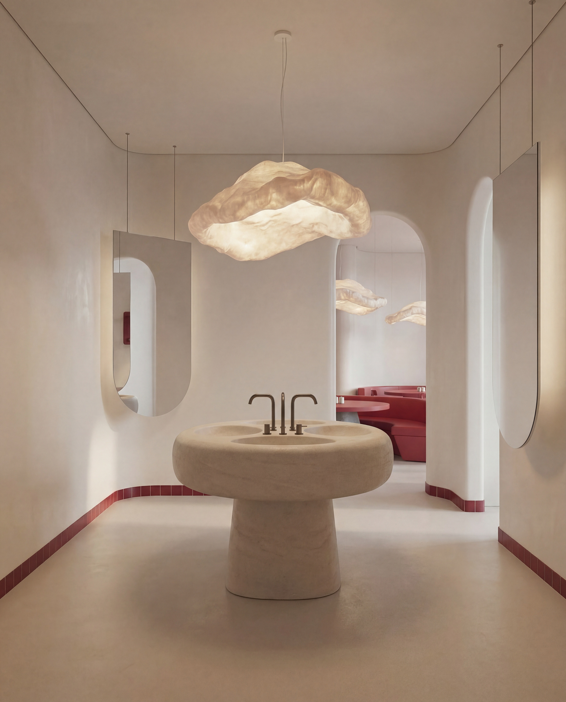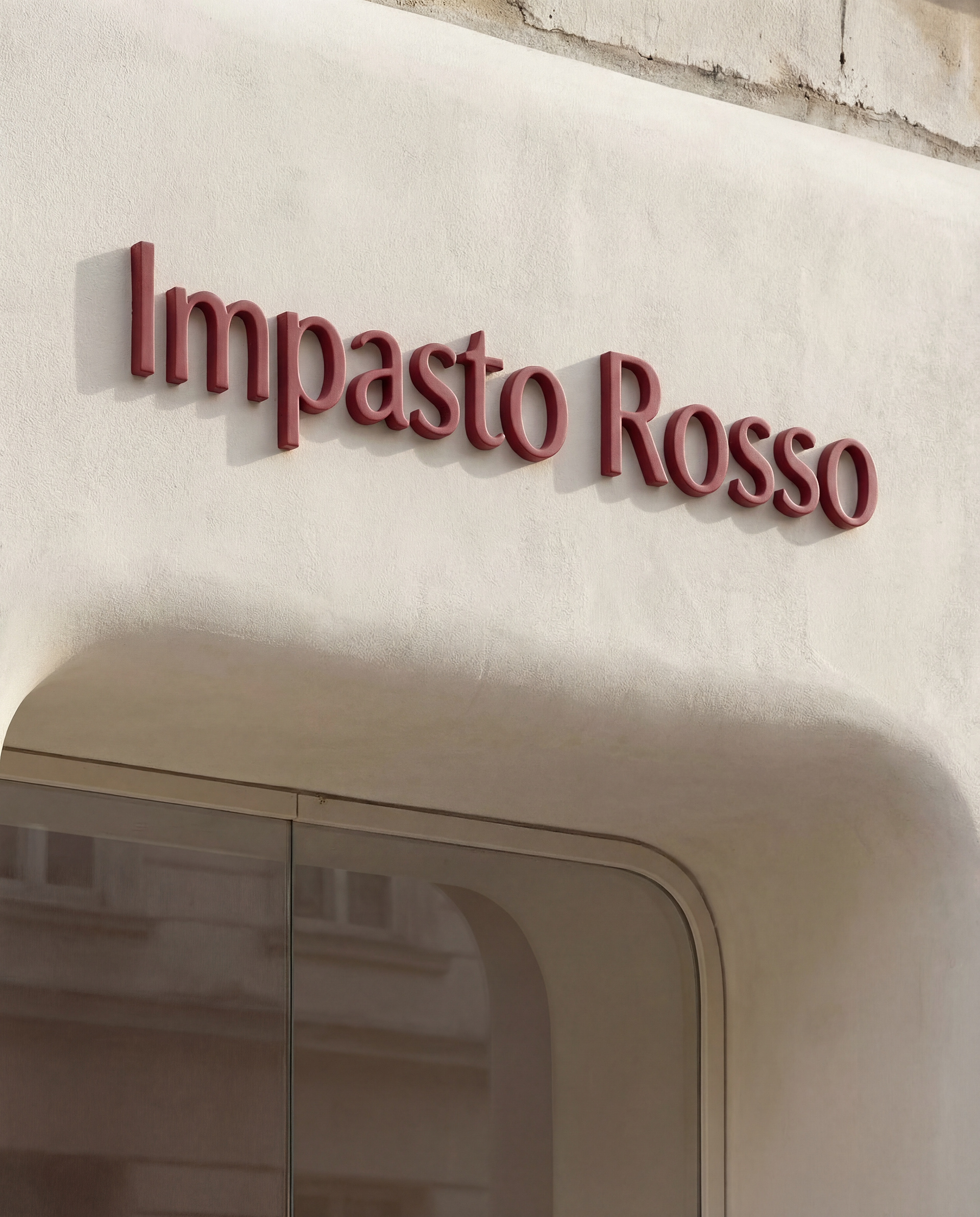 The Impasto Rosso's design is inspired by the process of making pizza, capturing the exact moment when the dough is thrown into the air and translating it into suspended lighting elements, as if frozen in time. This gesture becomes the central narrative of the space, while other ingredients such as sauce and mushrooms inform the warm tones and tactile materiality. Through soft, curved geometries and inflated volumes, the project explores the relationship between material, form, and sensory experience.