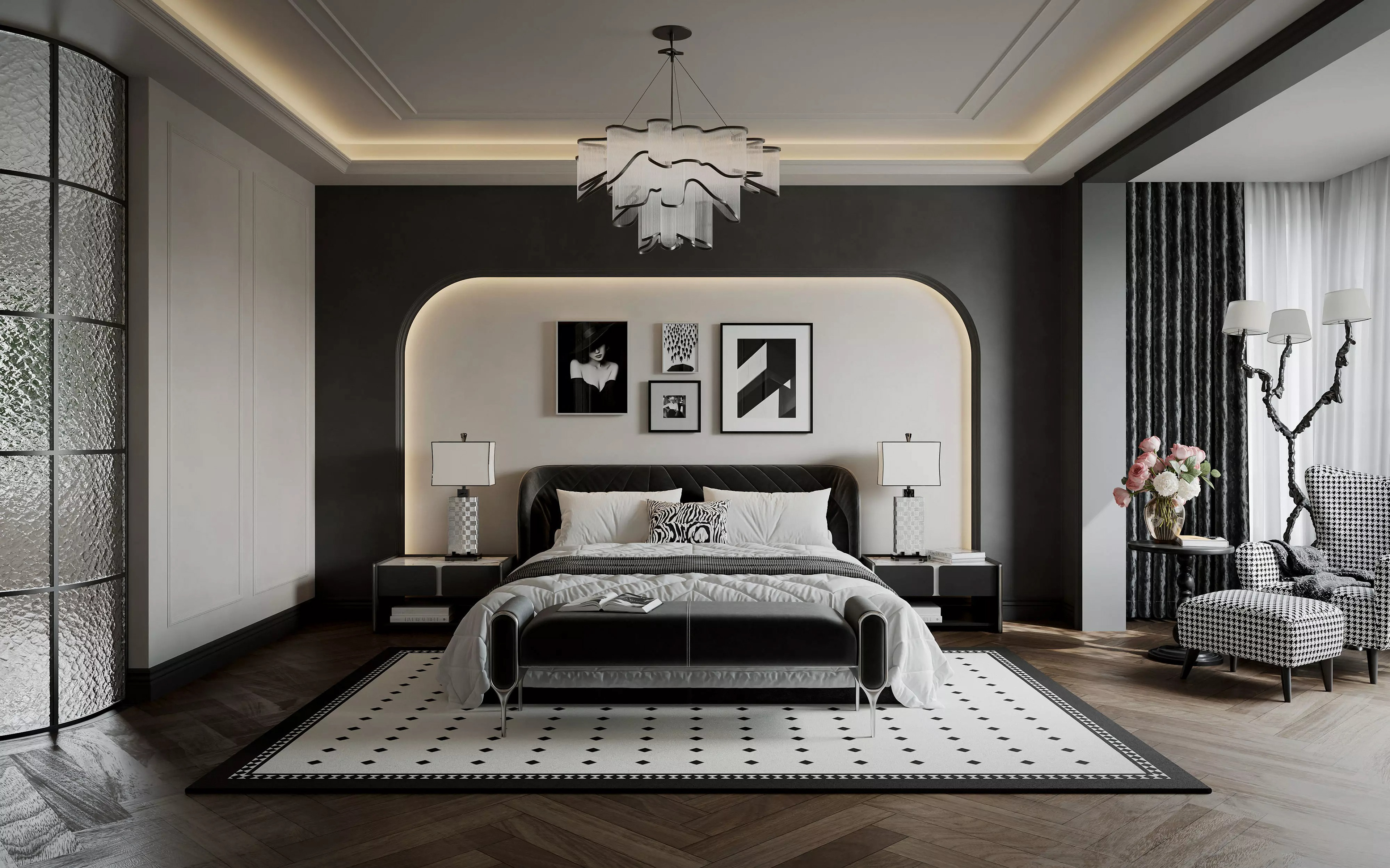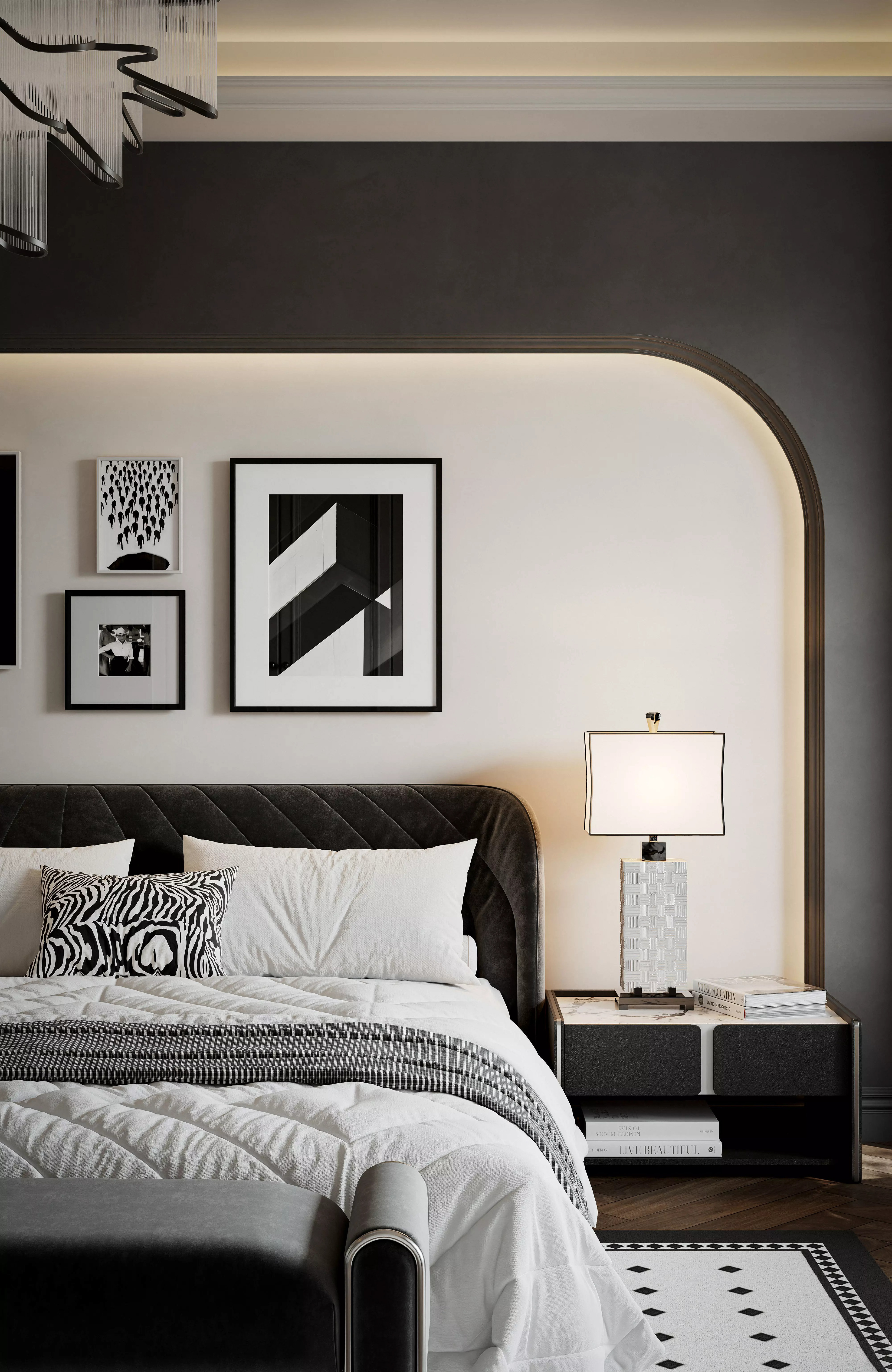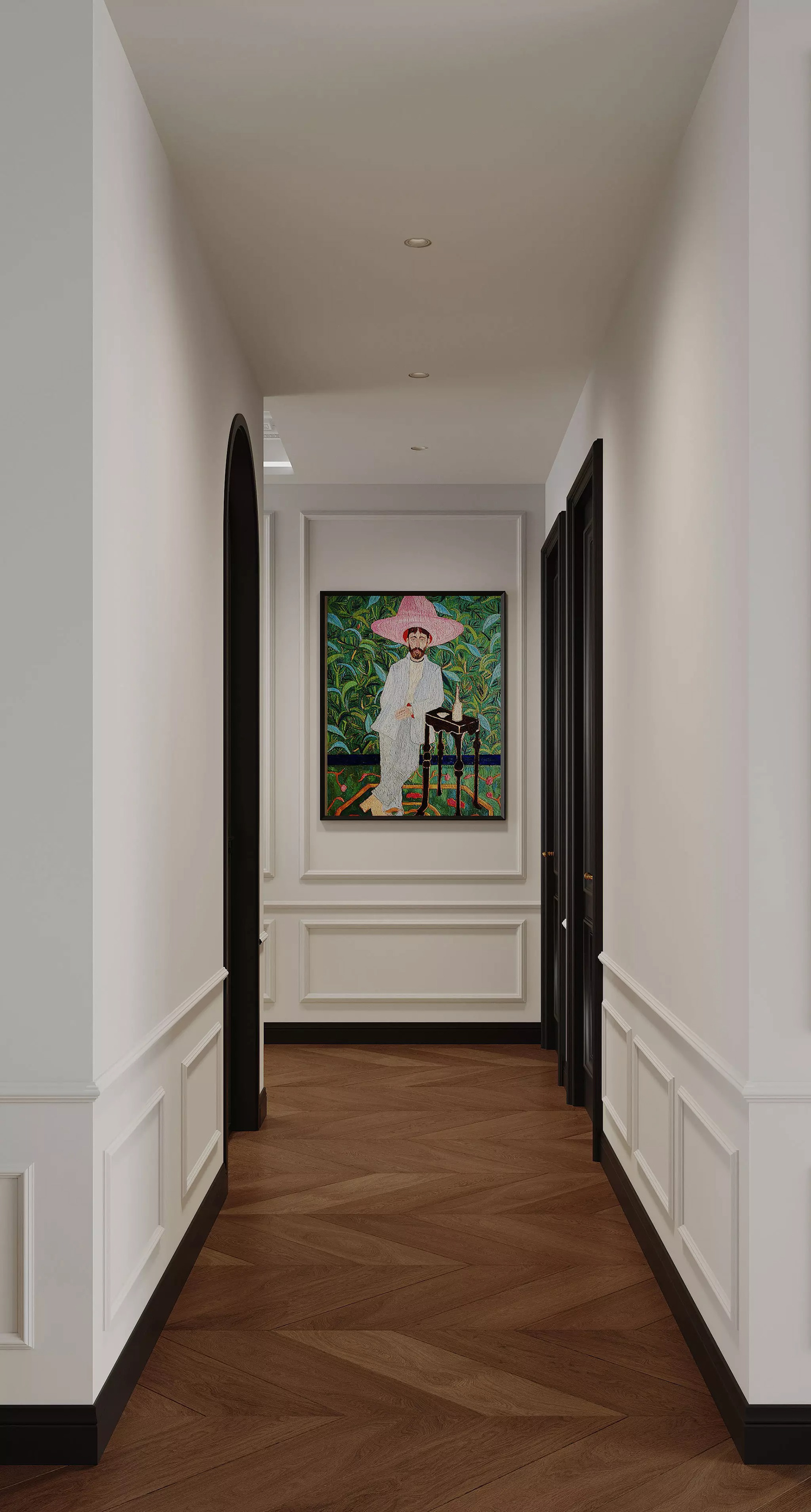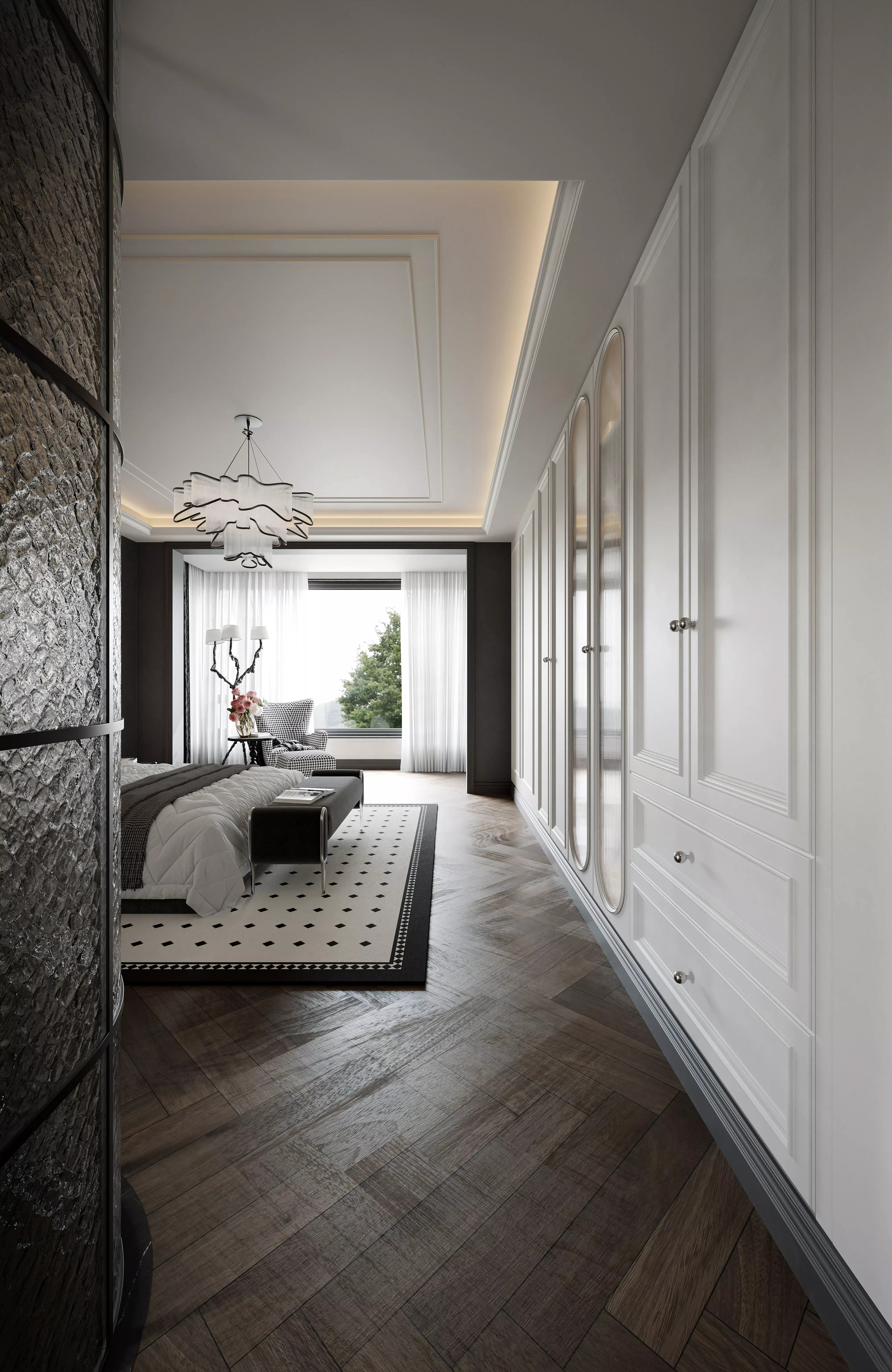This interior features a contemporary classic layout with a strong emphasis on geometry, proportion, and material consistency. Black and white finishes are paired with warm herringbone wood flooring, used throughout the apartment to create continuity between spaces. Walls are articulated with paneling, arches, and ceiling moldings, defining each area clearly without excessive ornamentation. The bedroom, living, dining, kitchen, and corridor are designed with coordinated cabinetry, furniture, and lighting elements. Dark-toned furniture and built-in units contrast with light walls and textiles, while custom lighting fixtures and concealed ceiling lighting define focal points. The spaces are organized, structured, and visually connected through repeated materials, colors, and architectural details.