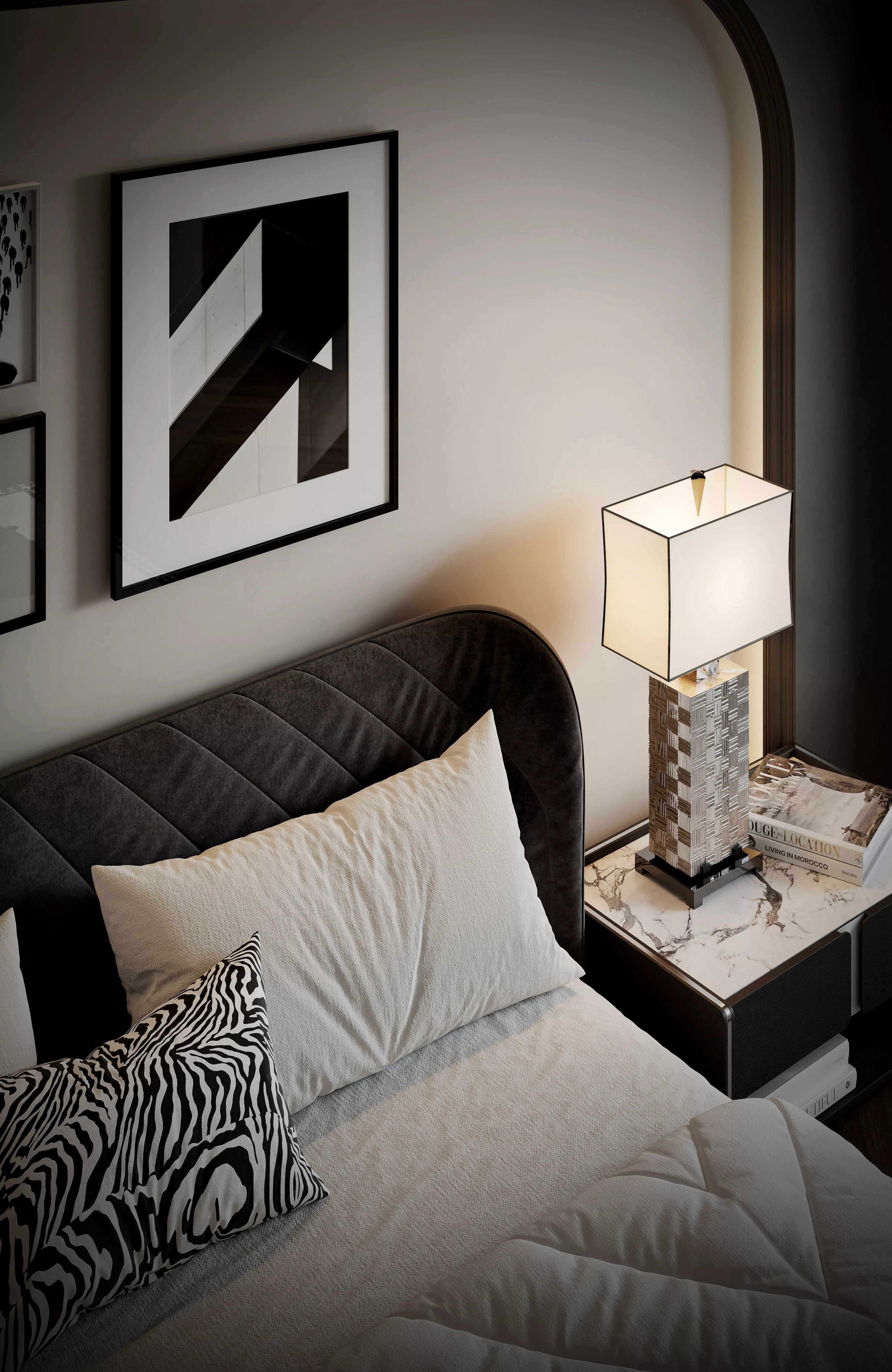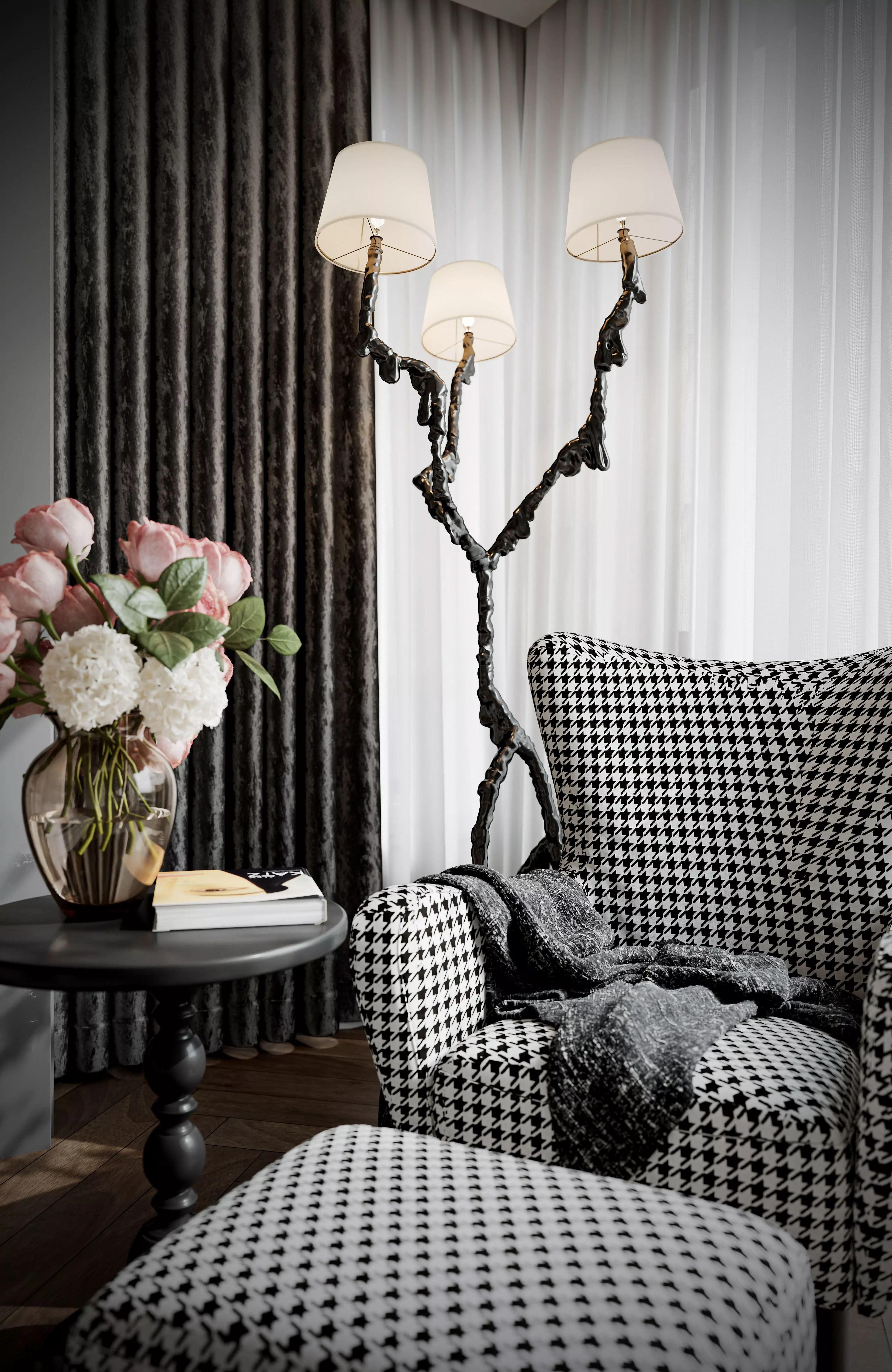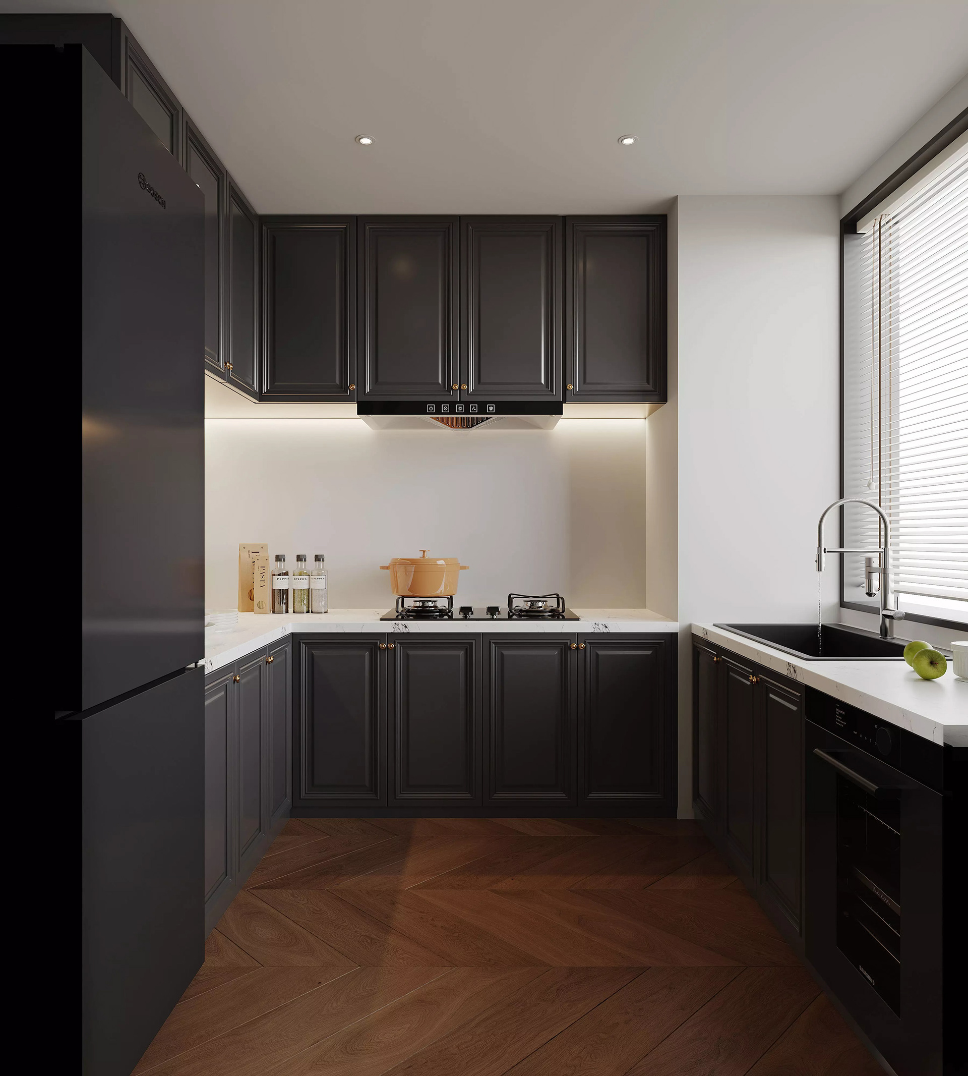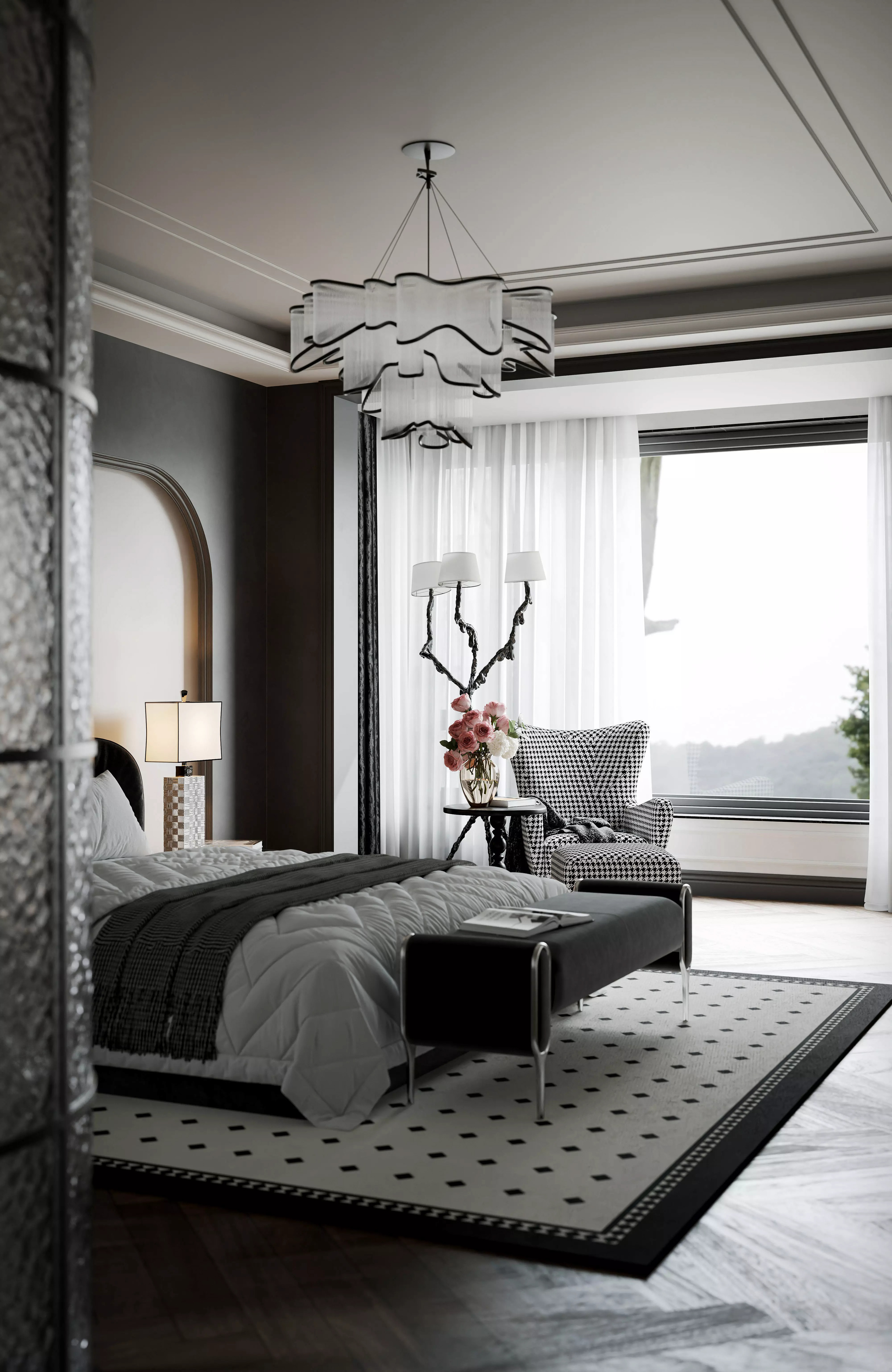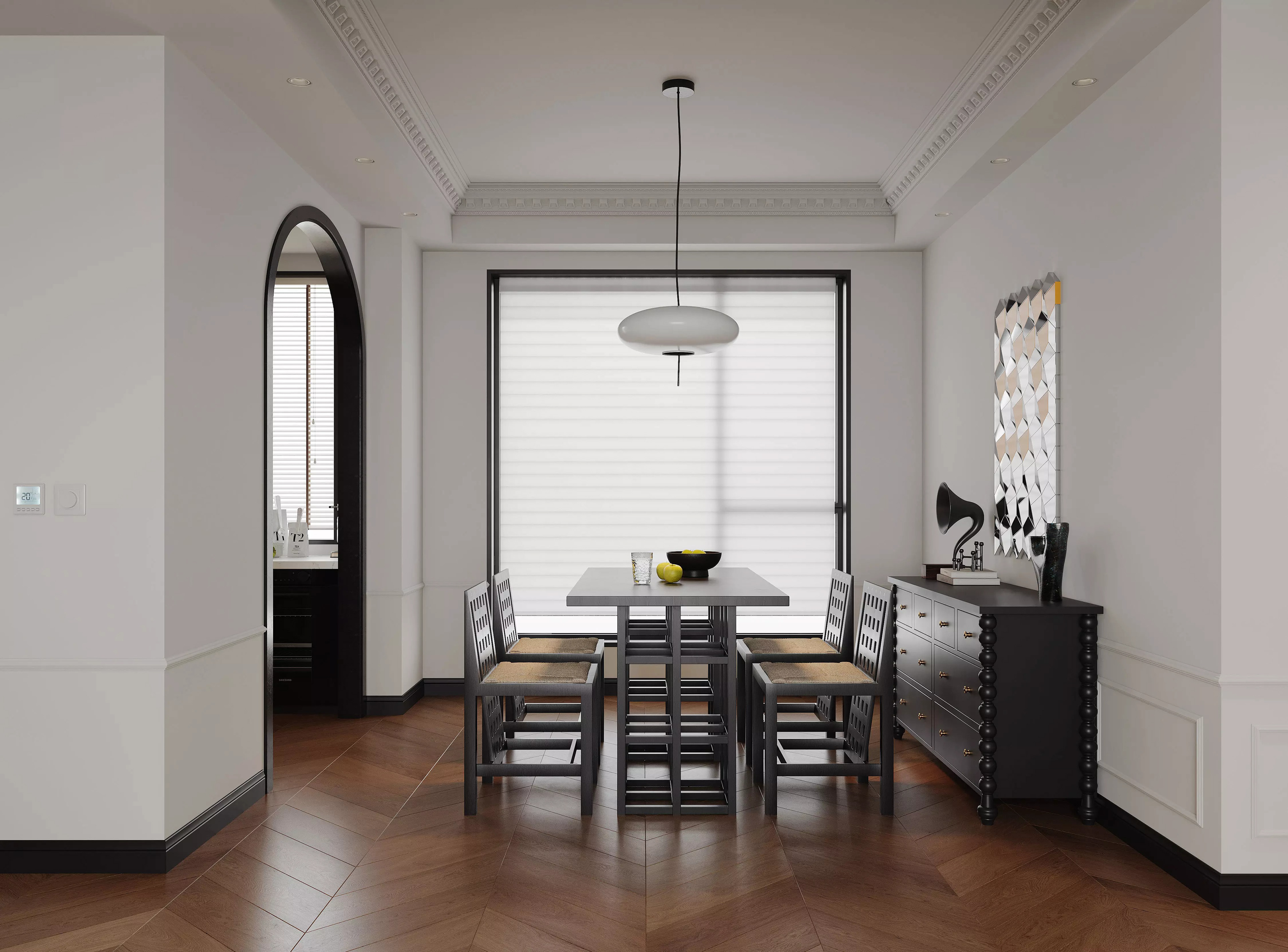 This interior features a contemporary classic layout with a strong emphasis on geometry, proportion, and material consistency. Black and white finishes are paired with warm herringbone wood flooring, used throughout the apartment to create continuity between spaces. Walls are articulated with paneling, arches, and ceiling moldings, defining each area clearly without excessive ornamentation. The bedroom, living, dining, kitchen, and corridor are designed with coordinated cabinetry, furniture, and lighting elements. Dark-toned furniture and built-in units contrast with light walls and textiles, while custom lighting fixtures and concealed ceiling lighting define focal points. The spaces are organized, structured, and visually connected through repeated materials, colors, and architectural details.