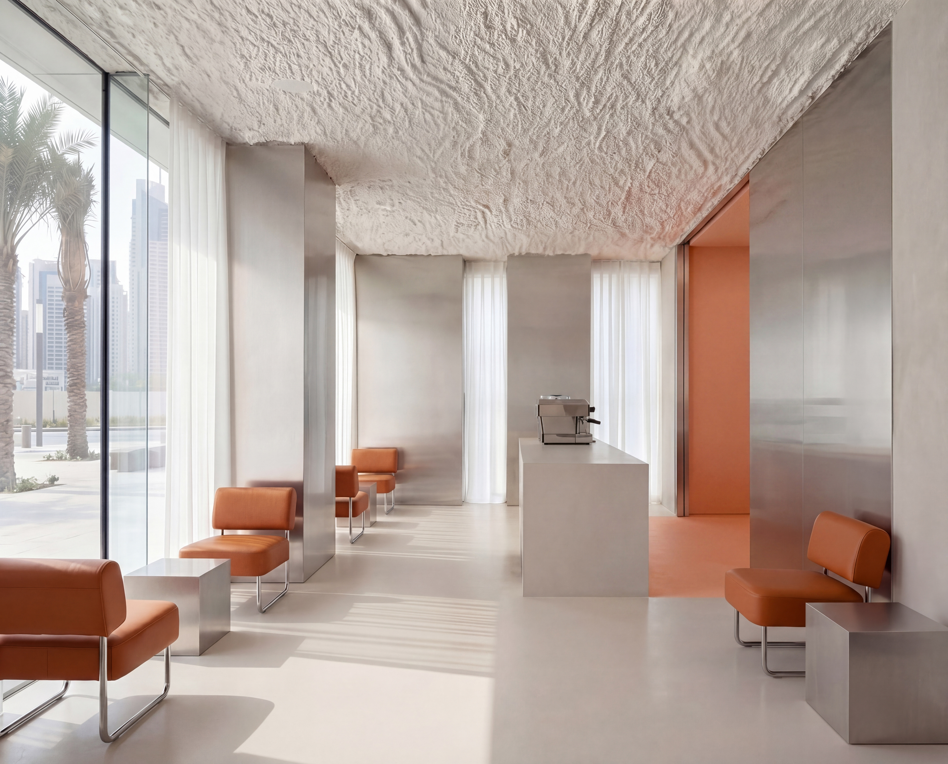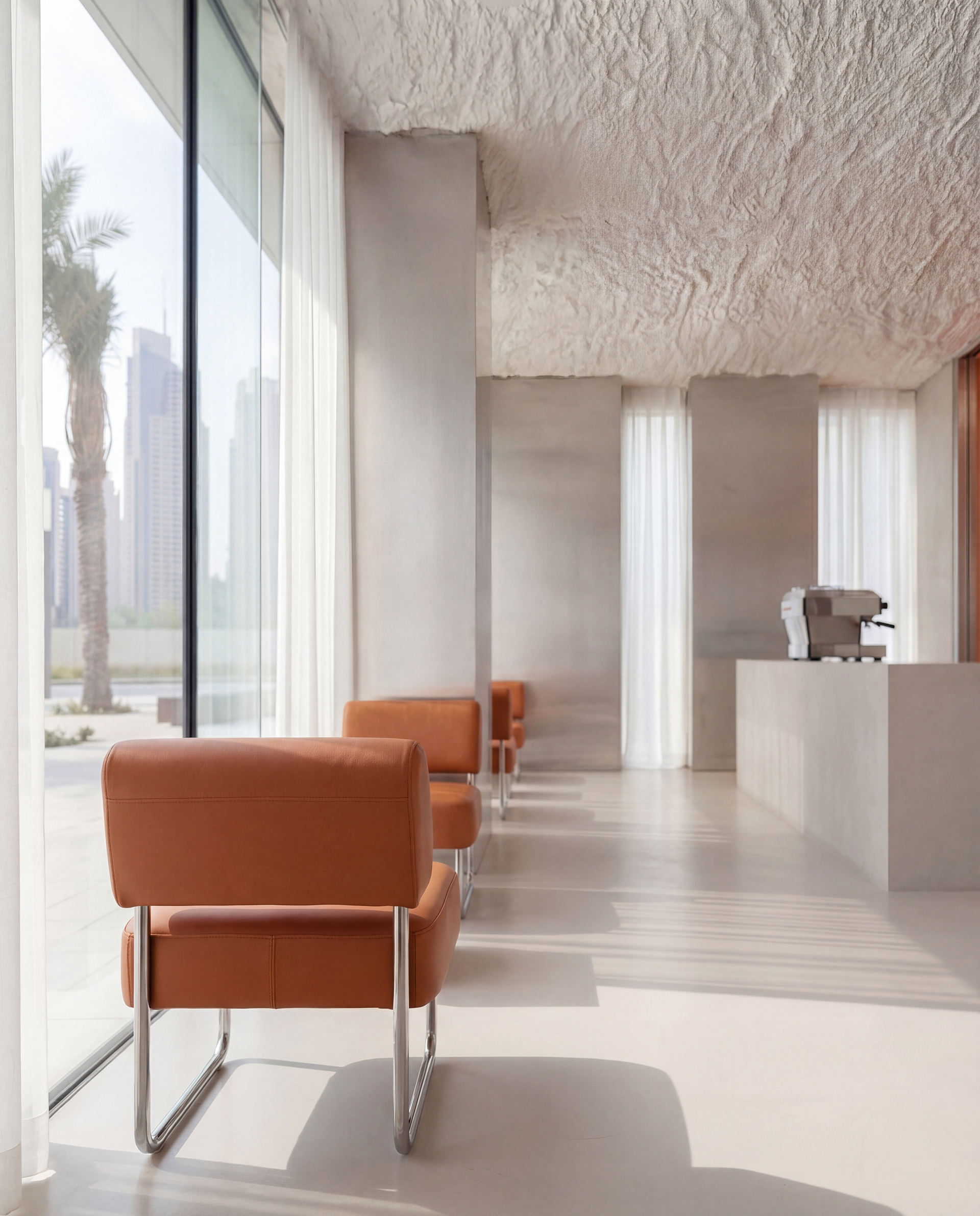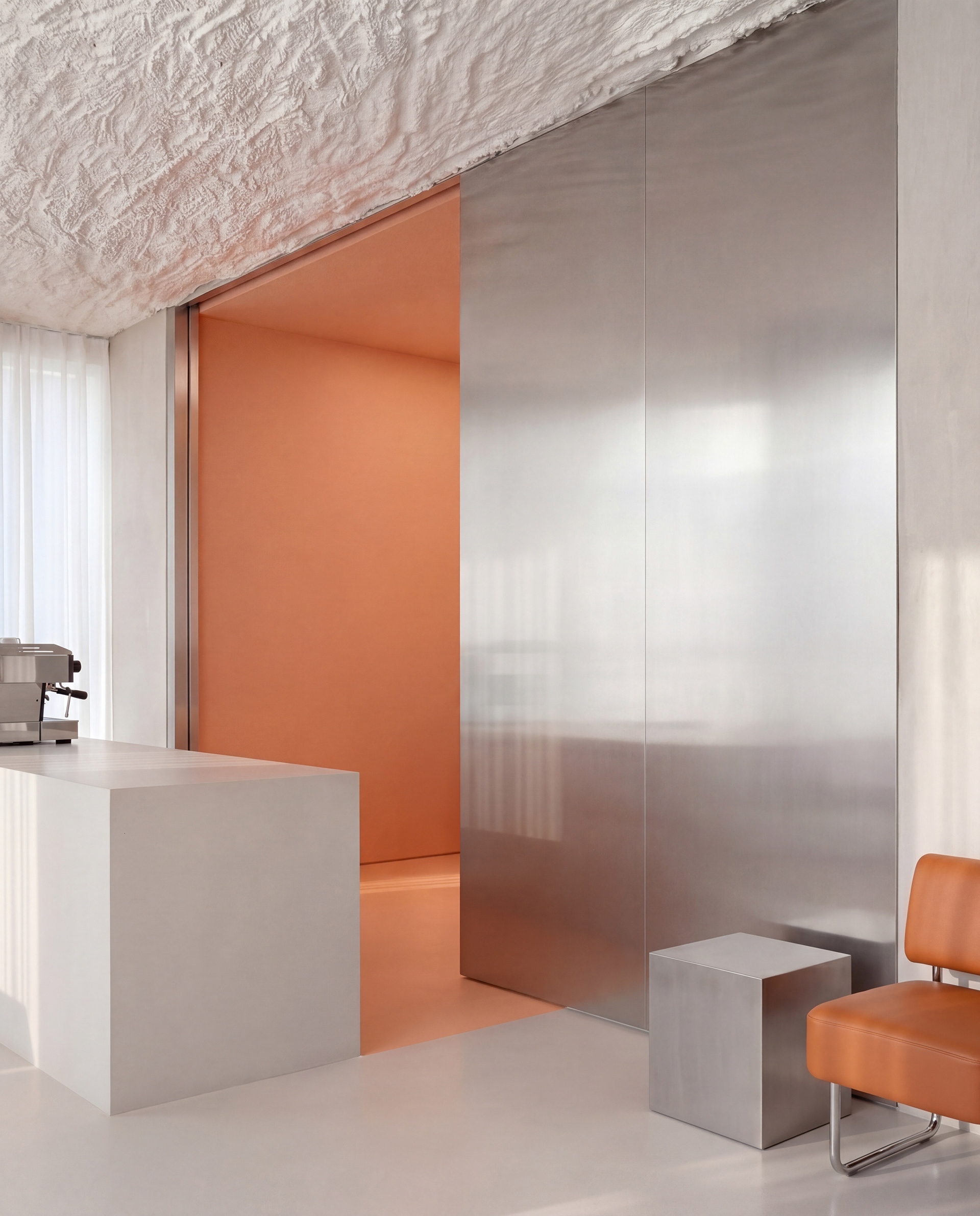 The space combines a soft, neutral base with warm terracotta accents. Textured plaster ceilings add a raw, tactile quality, while brushed stainless steel introduces a clean, contemporary contrast. Warm leather seating ties the palette together, creating a calm and balanced atmosphere. The design balances softness and structure, warmth and minimalism.