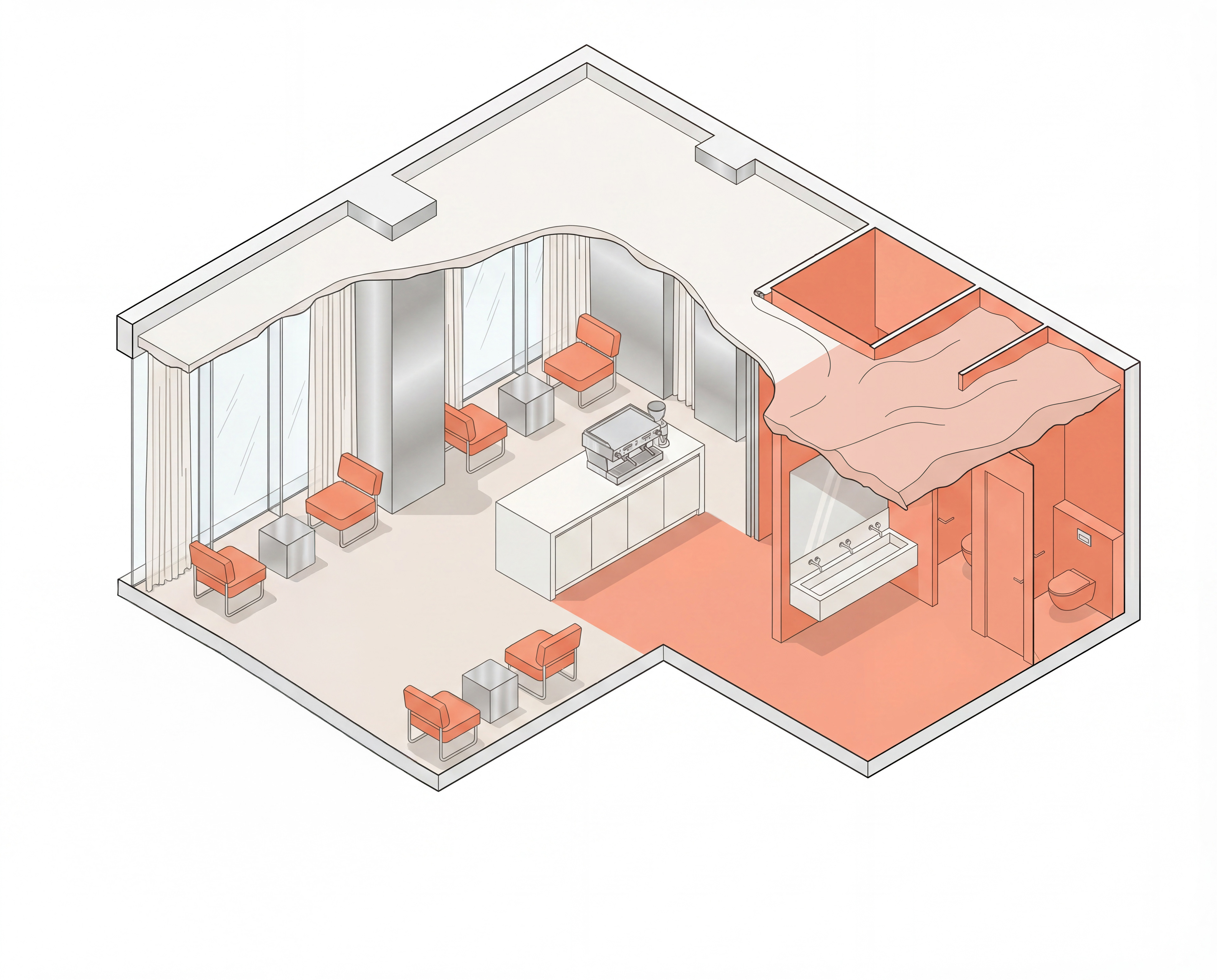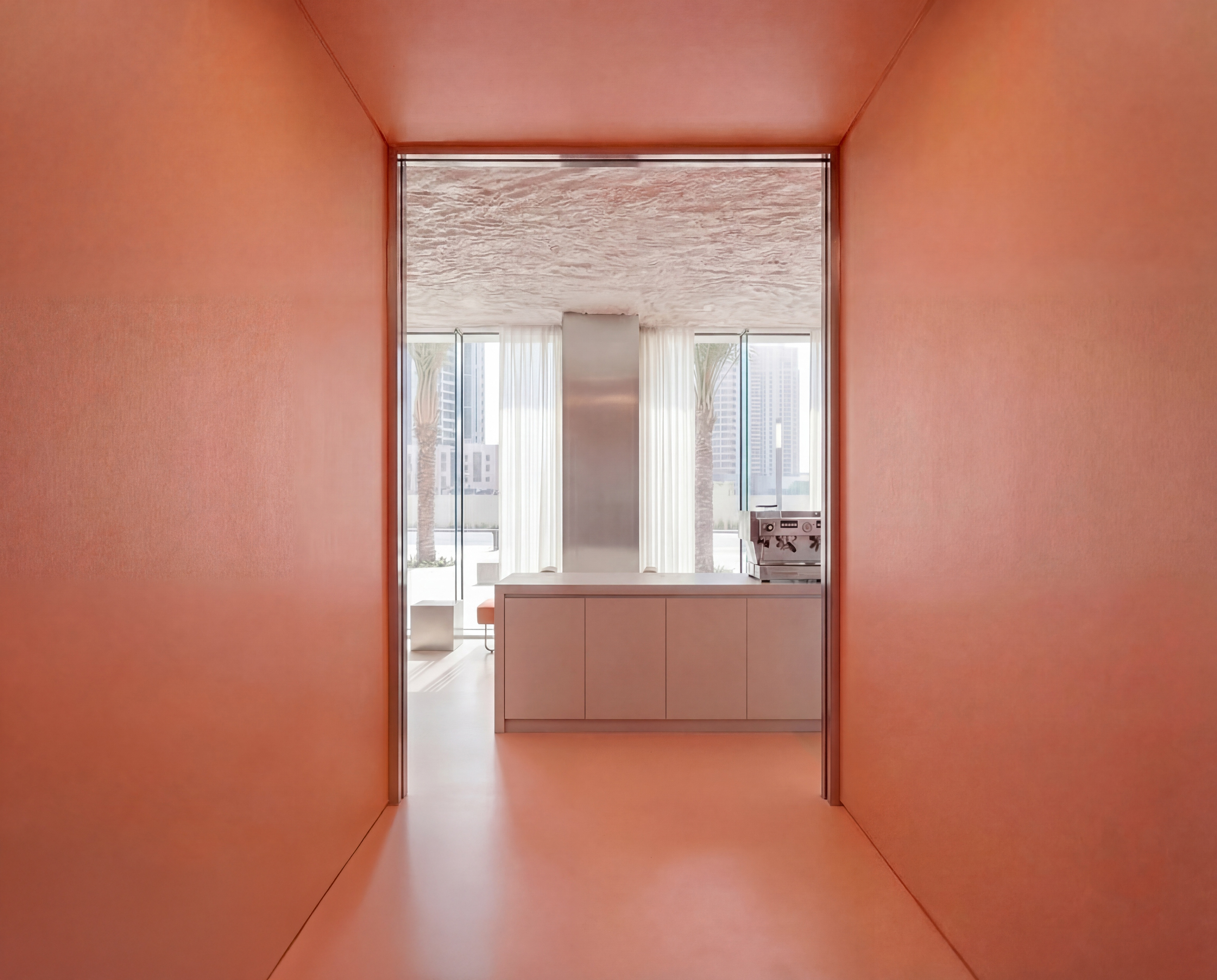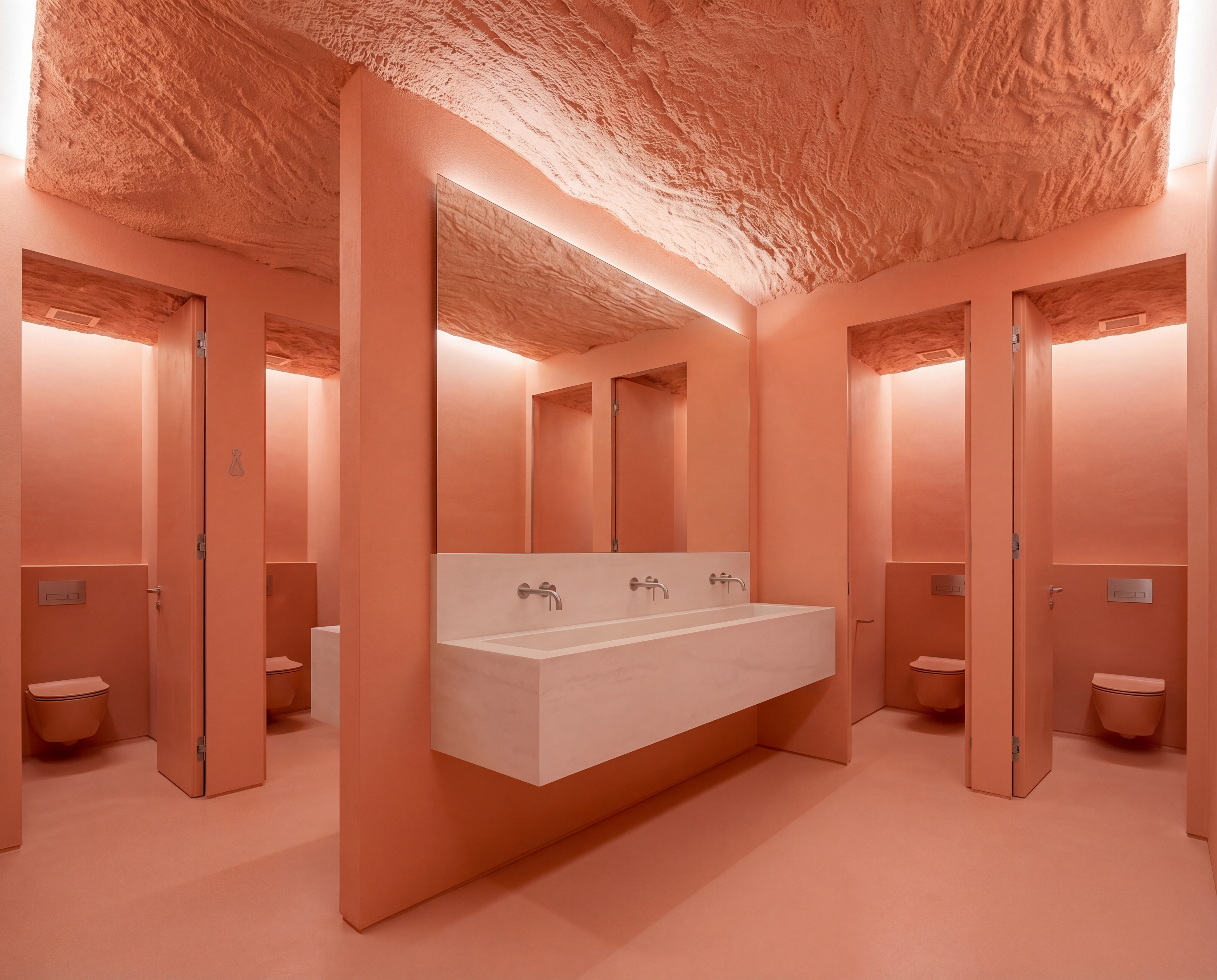The space combines a soft, neutral base with warm terracotta accents. Textured plaster ceilings add a raw, tactile quality, while brushed stainless steel introduces a clean, contemporary contrast. Warm leather seating ties the palette together, creating a calm and balanced atmosphere. The design balances softness and structure, warmth and minimalism.