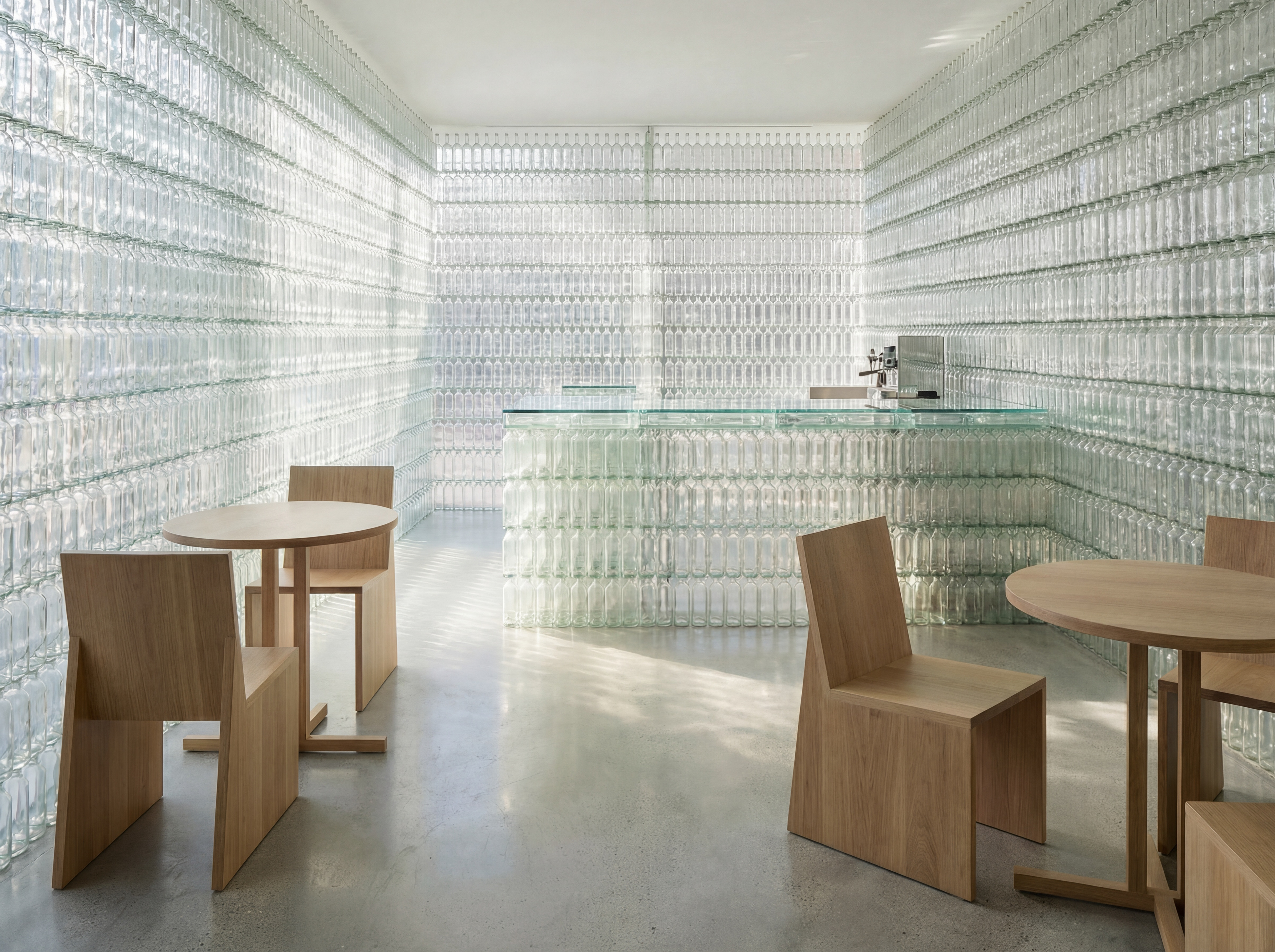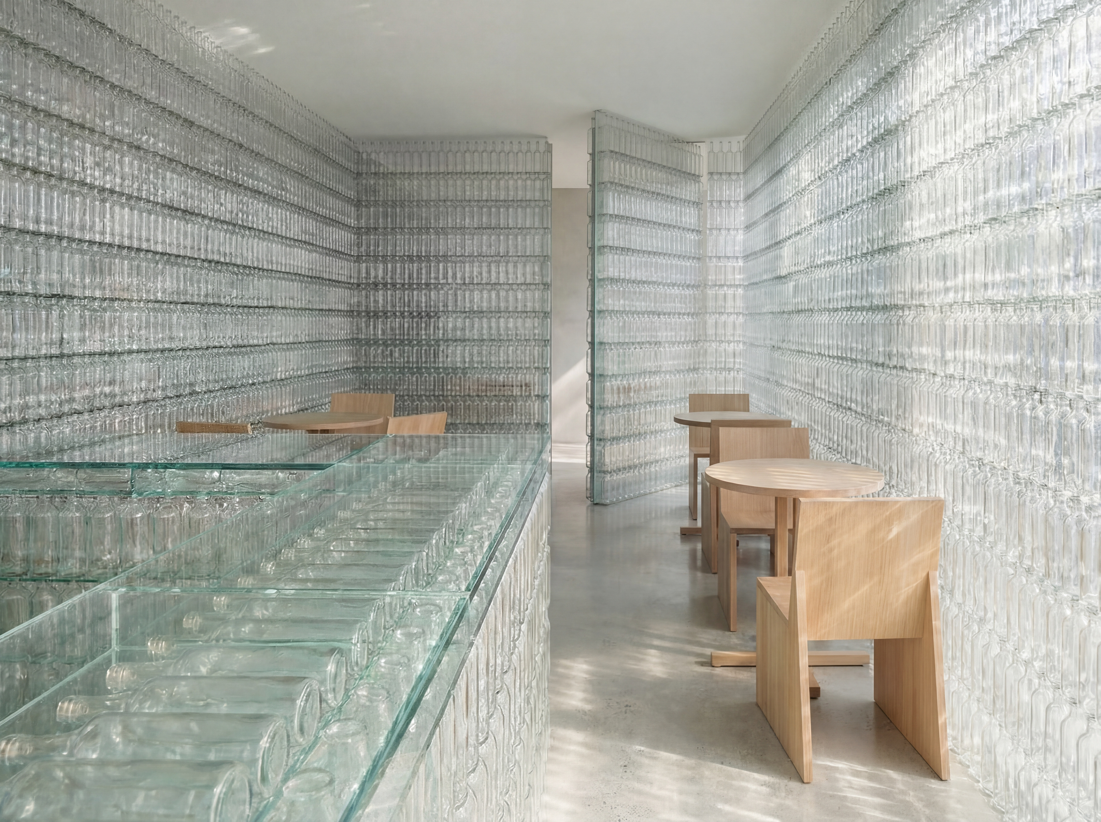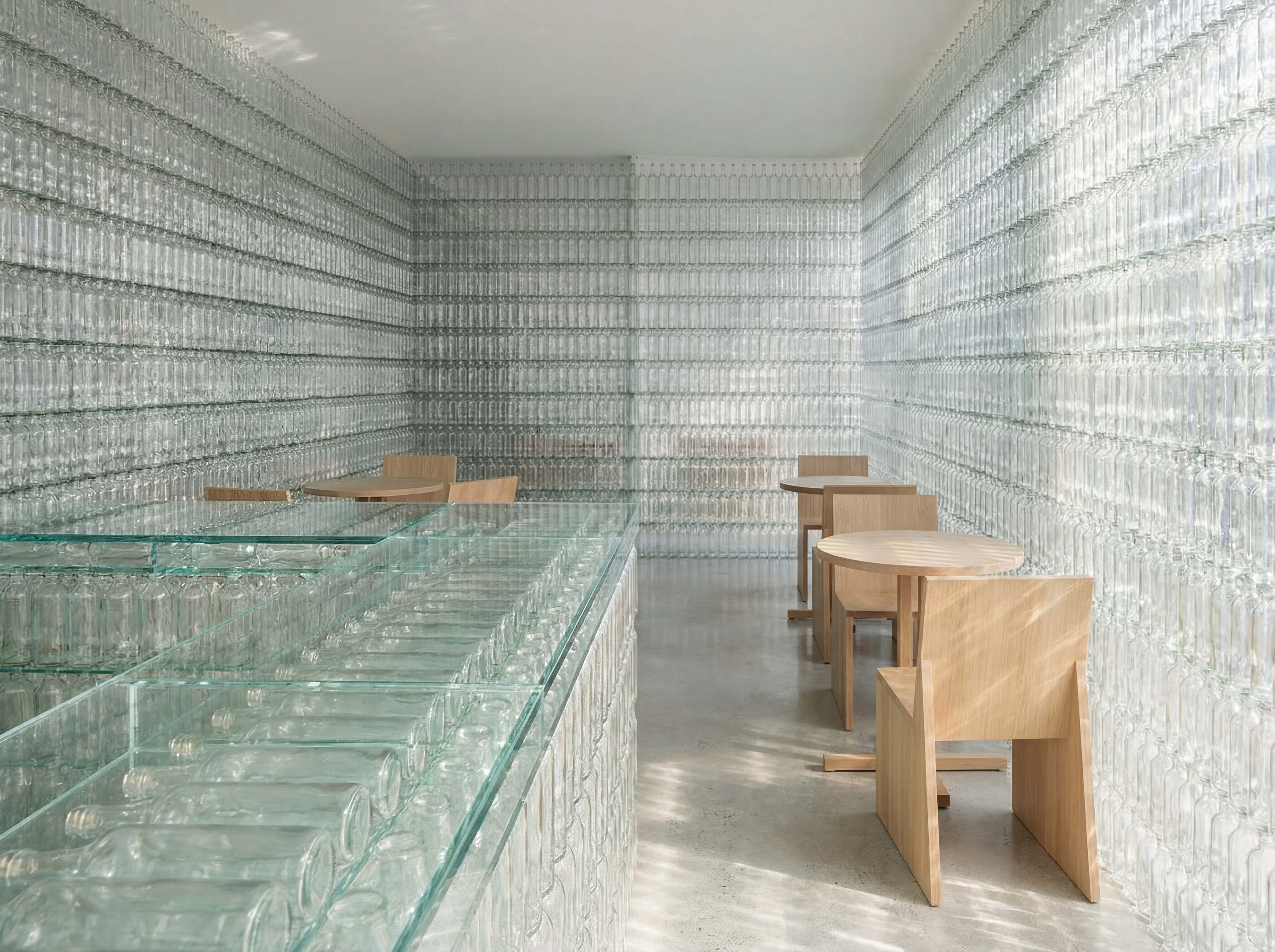 A pop-up café wrapped entirely in recycled bottles, where light becomes texture and sustainability becomes space.