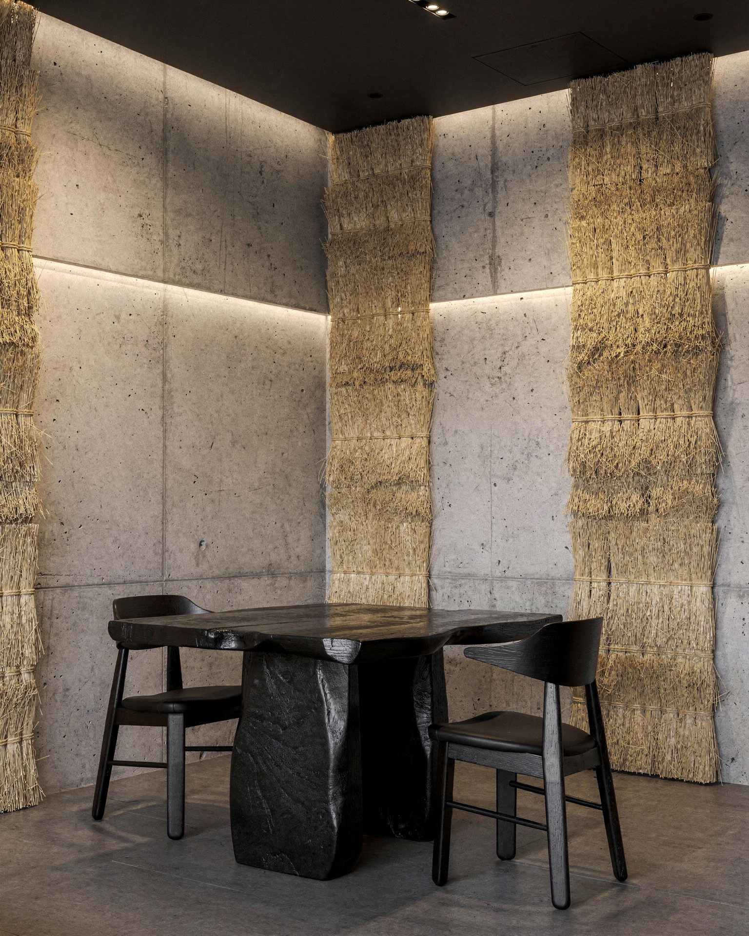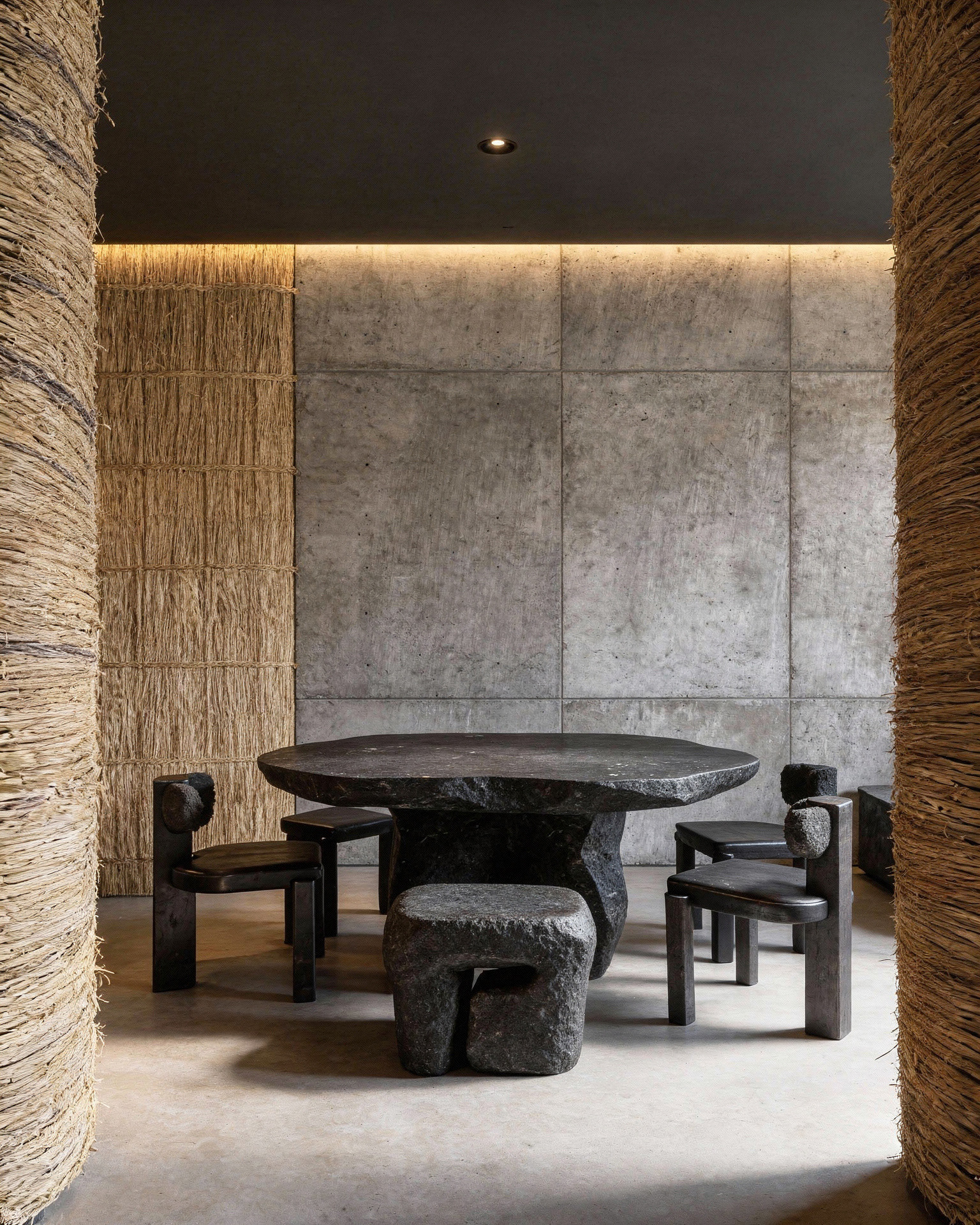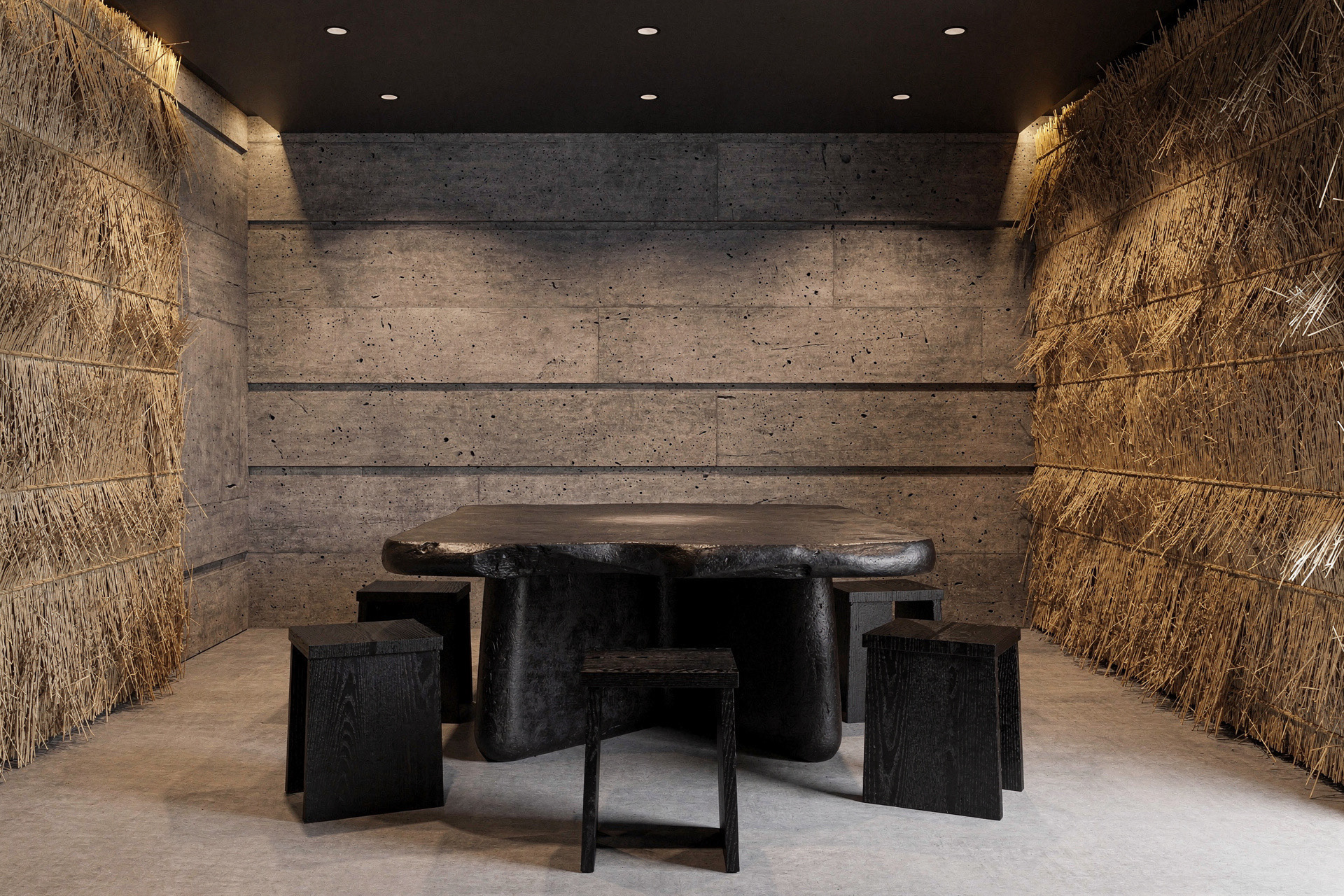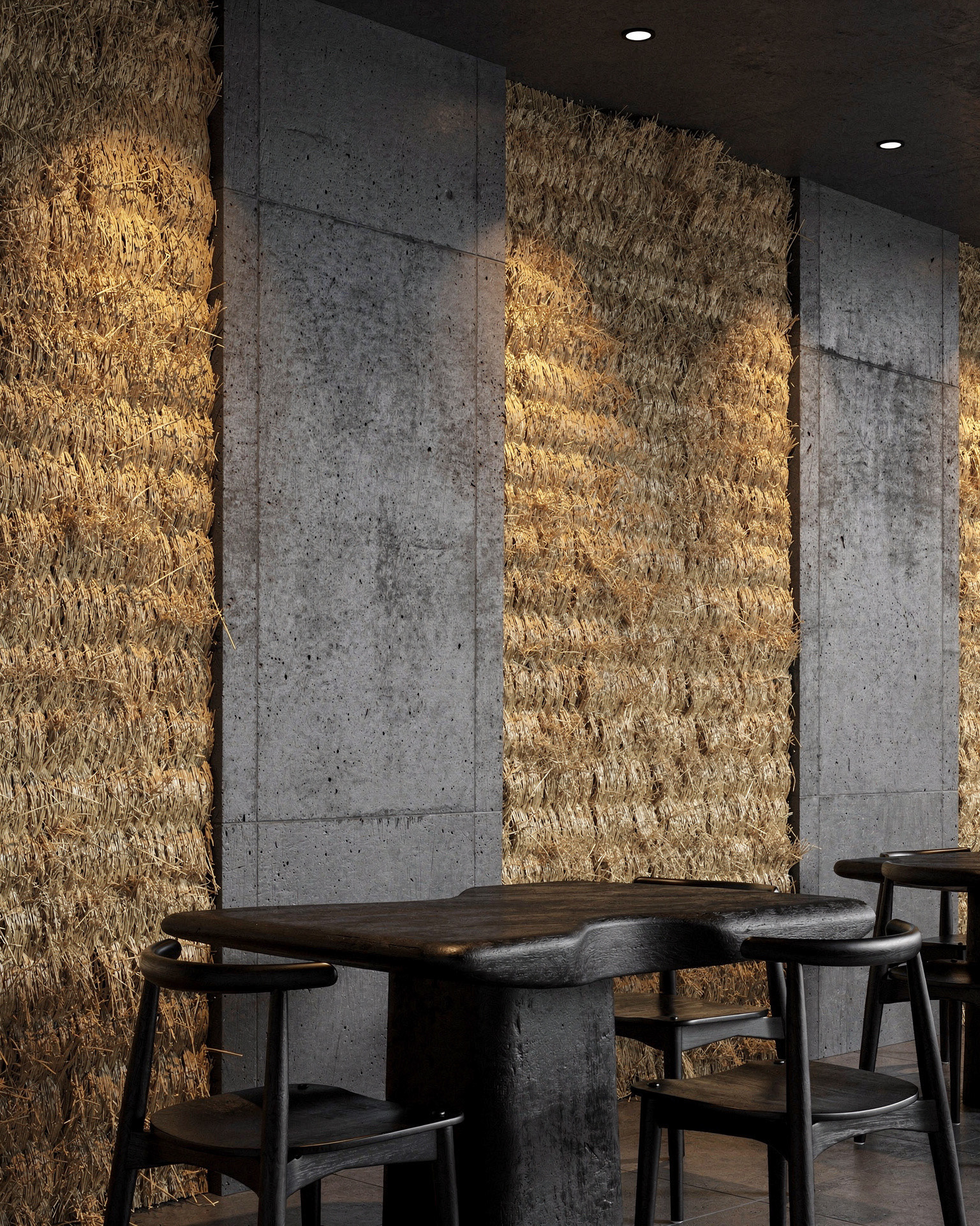 STRO Café is a dialogue between two opposing materials: raw concrete and straw. Concrete defines the structure. It is heavy, silent, and permanent, a material that carries weight, time, and stability. In contrast, straw introduces softness, warmth, and texture. Its fibrous nature absorbs light and sound, creating a tactile and human counterpoint to the rigid concrete surfaces. Soft, indirect lighting filters through the straw surfaces, warming the space and softening the concrete volumes. The result is an atmosphere that feels grounded and calm, where the heaviness of concrete is held and moderated by the natural presence of straw.