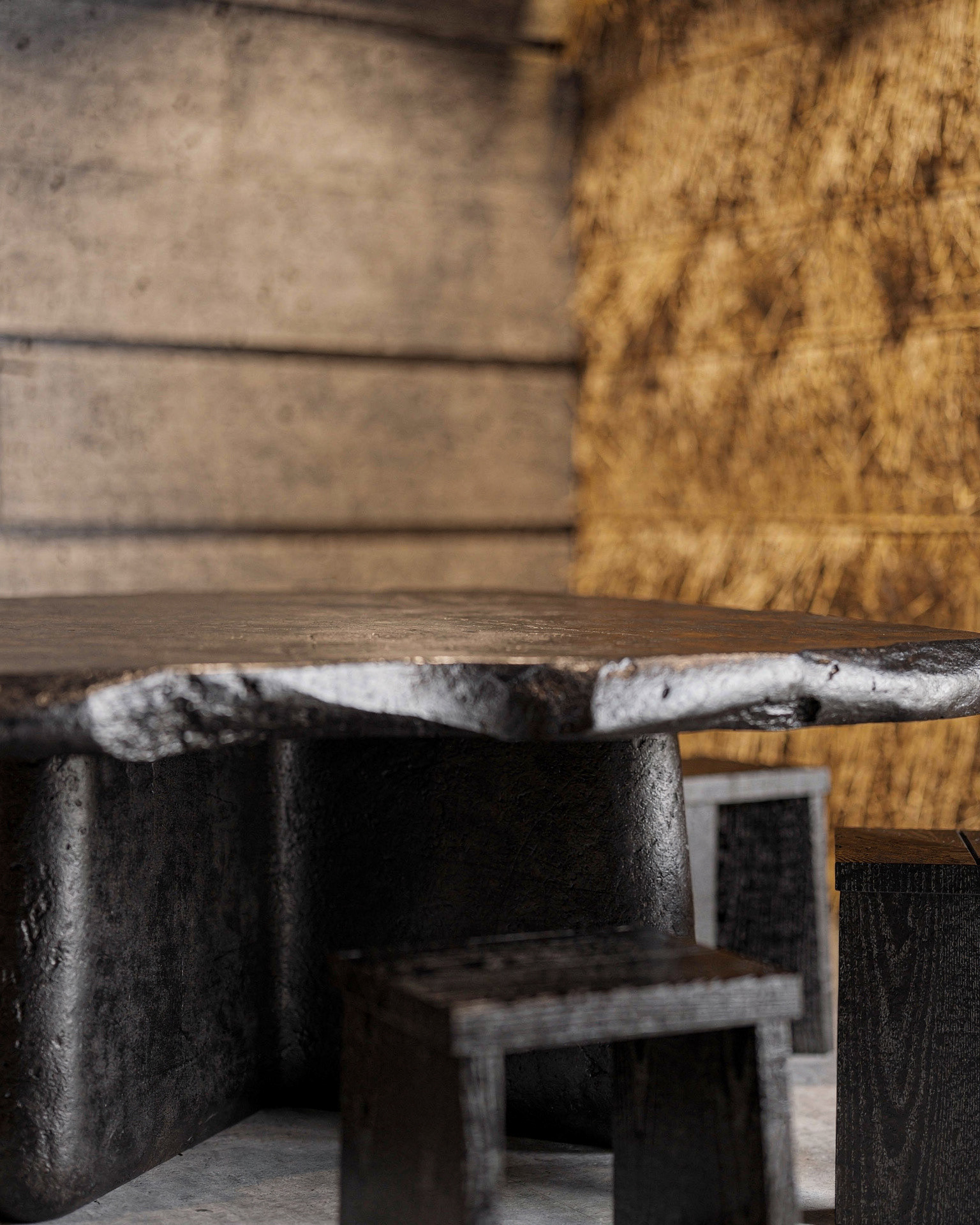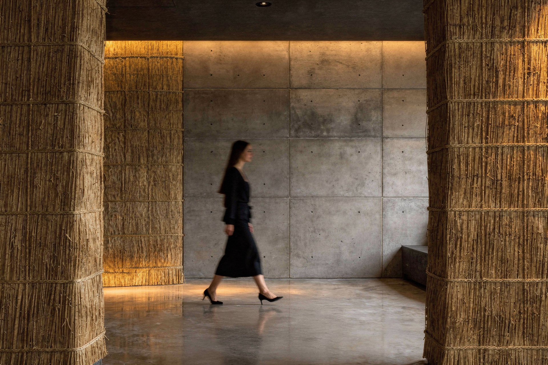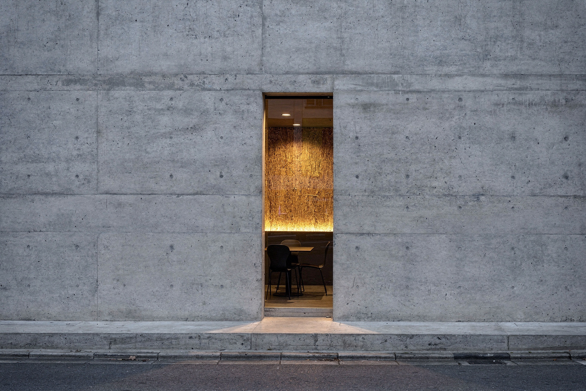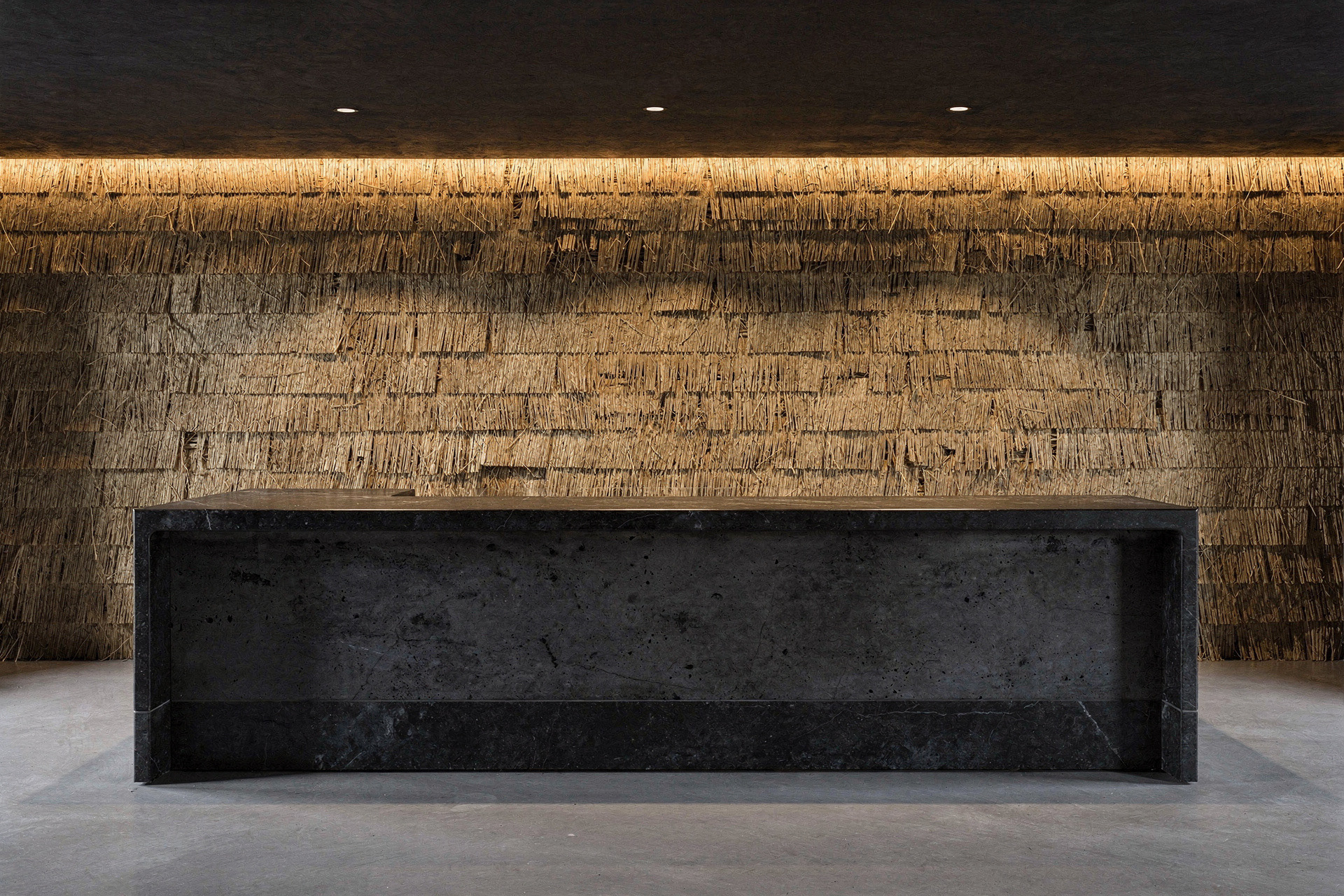 STRO Café is a dialogue between two opposing materials: raw concrete and straw. Concrete defines the structure. It is heavy, silent, and permanent, a material that carries weight, time, and stability. In contrast, straw introduces softness, warmth, and texture. Its fibrous nature absorbs light and sound, creating a tactile and human counterpoint to the rigid concrete surfaces. Soft, indirect lighting filters through the straw surfaces, warming the space and softening the concrete volumes. The result is an atmosphere that feels grounded and calm, where the heaviness of concrete is held and moderated by the natural presence of straw.