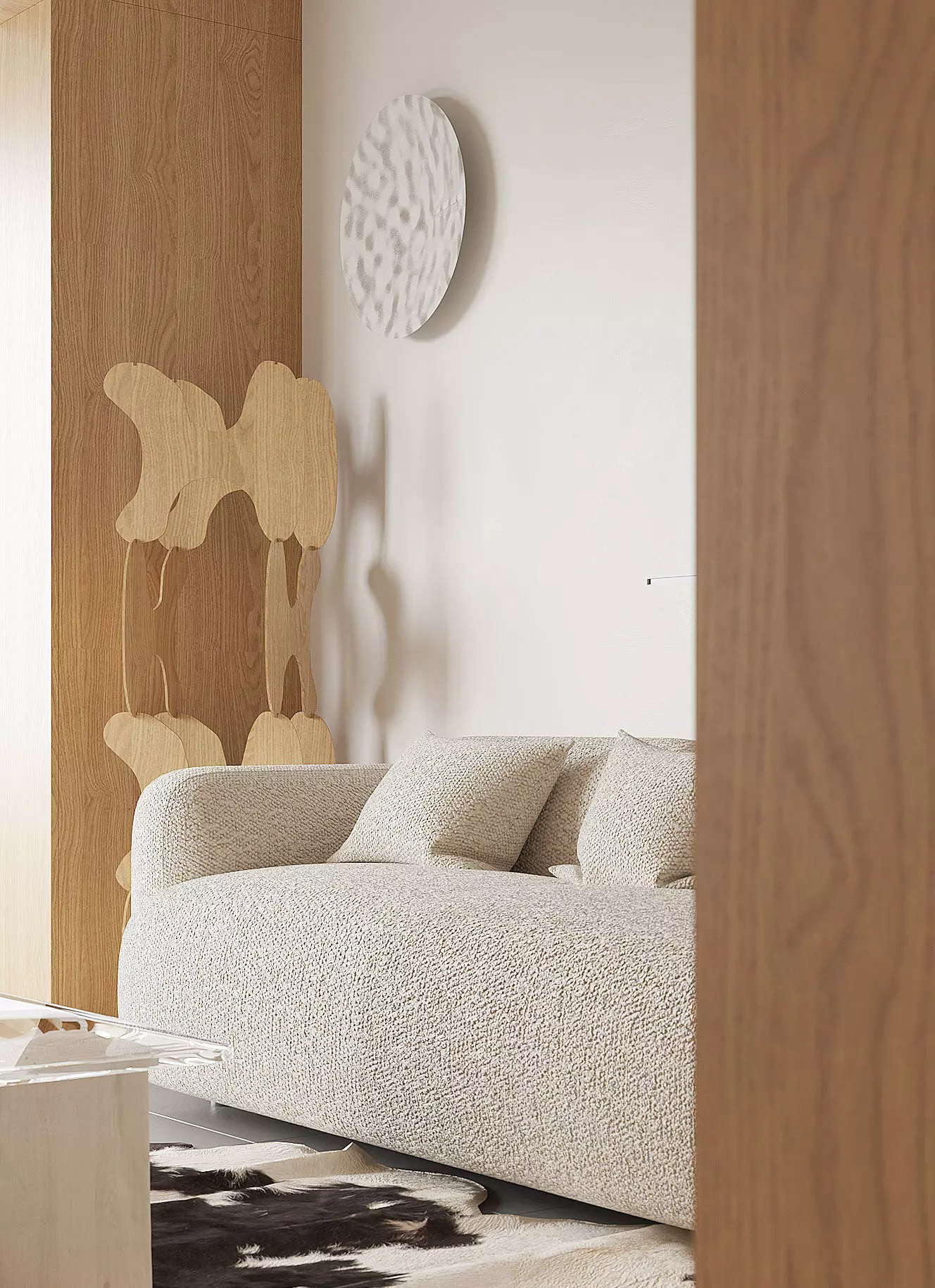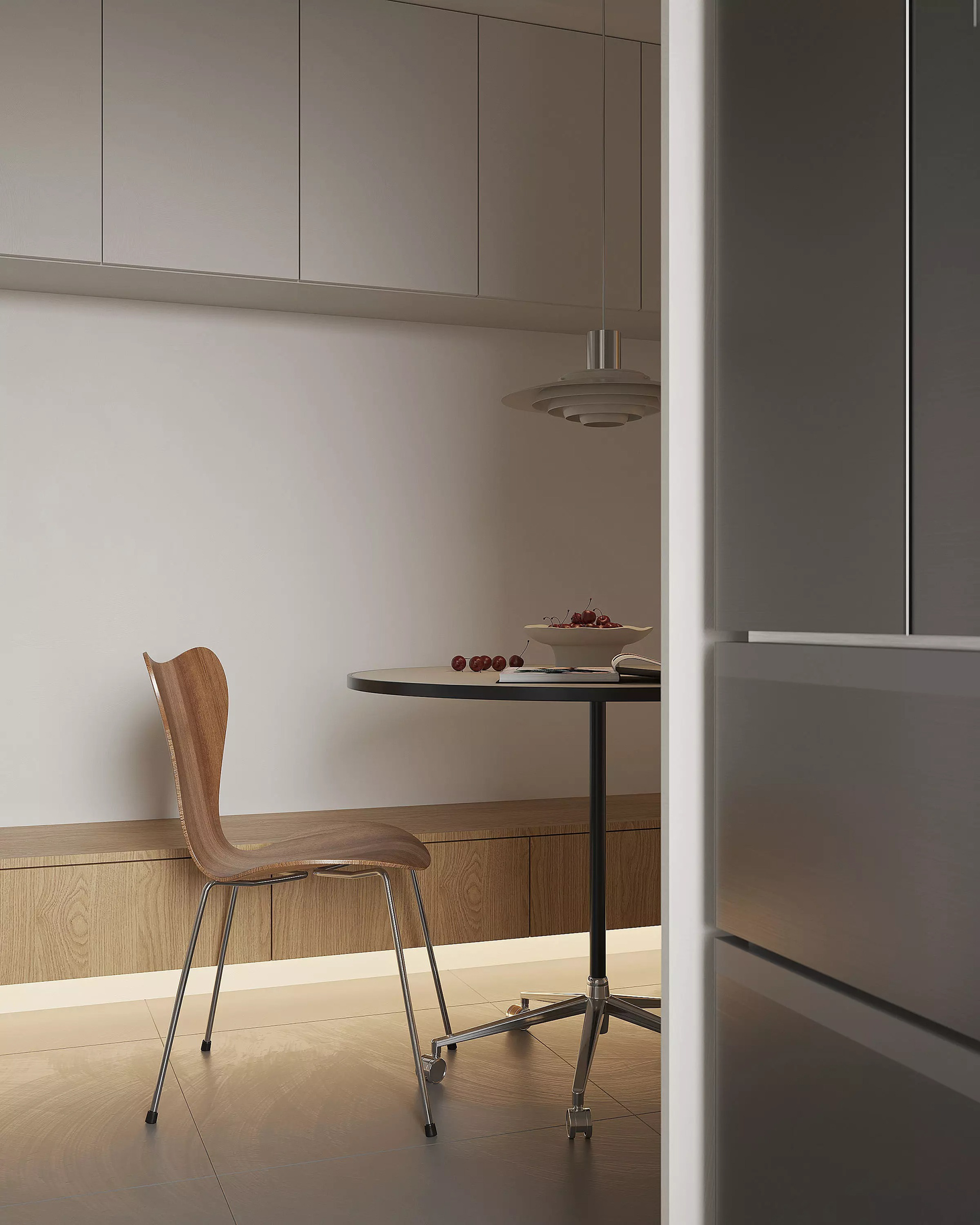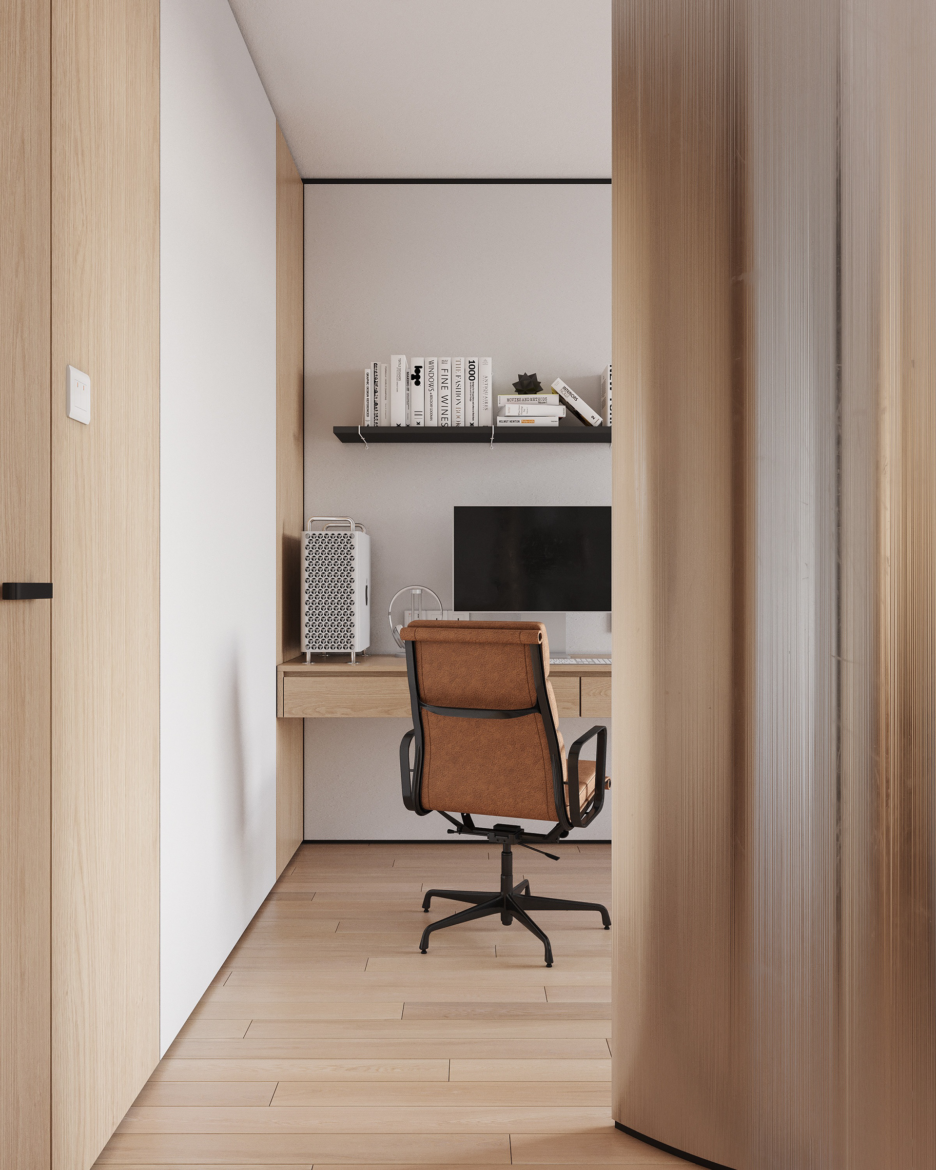 The space is designed to support daily use, with clear circulation and well-defined areas that function independently without visual clutter. Custom-built elements such as wall paneling, integrated storage, and fixed furniture optimize the available space and maintain a consistent material language throughout the apartment.