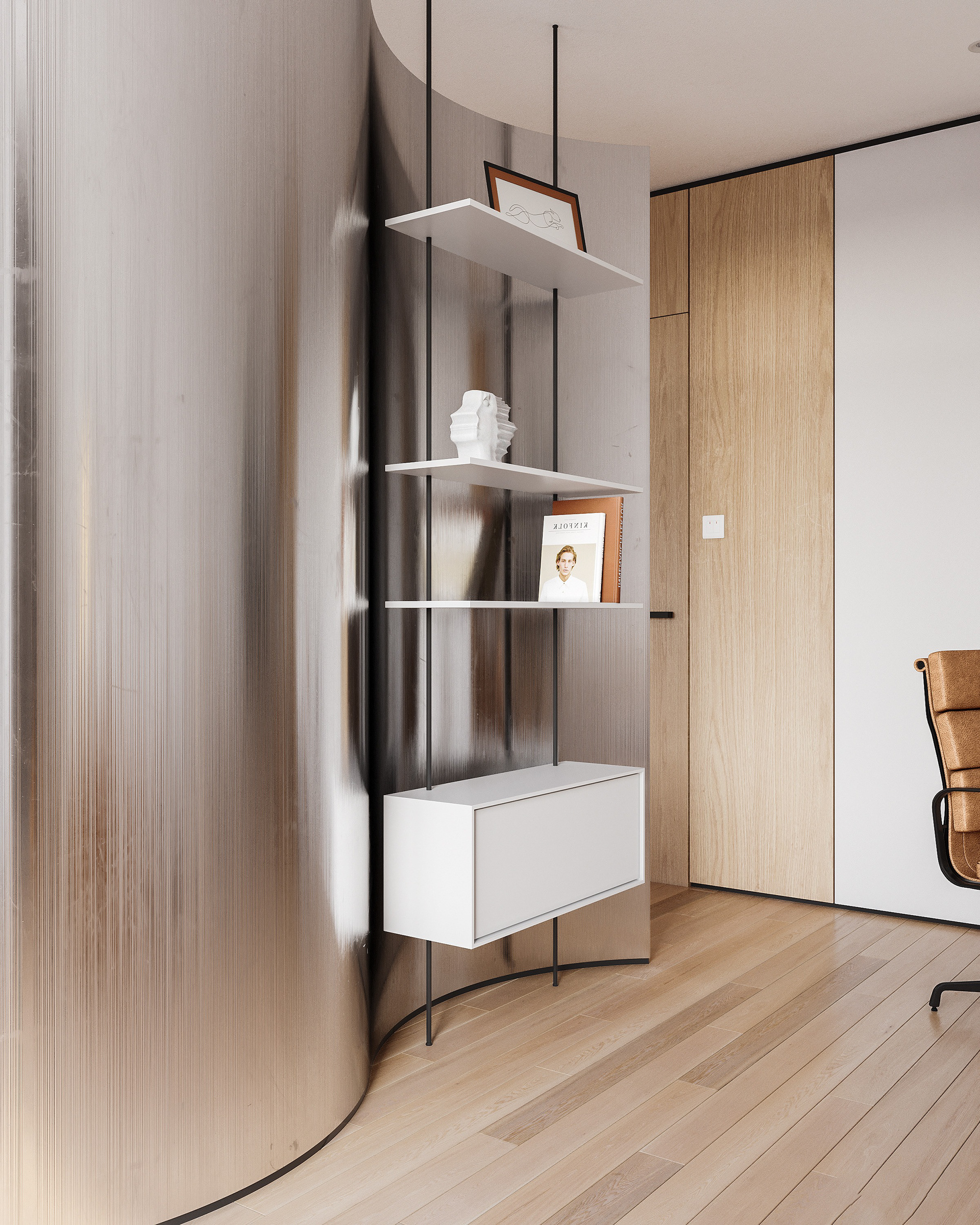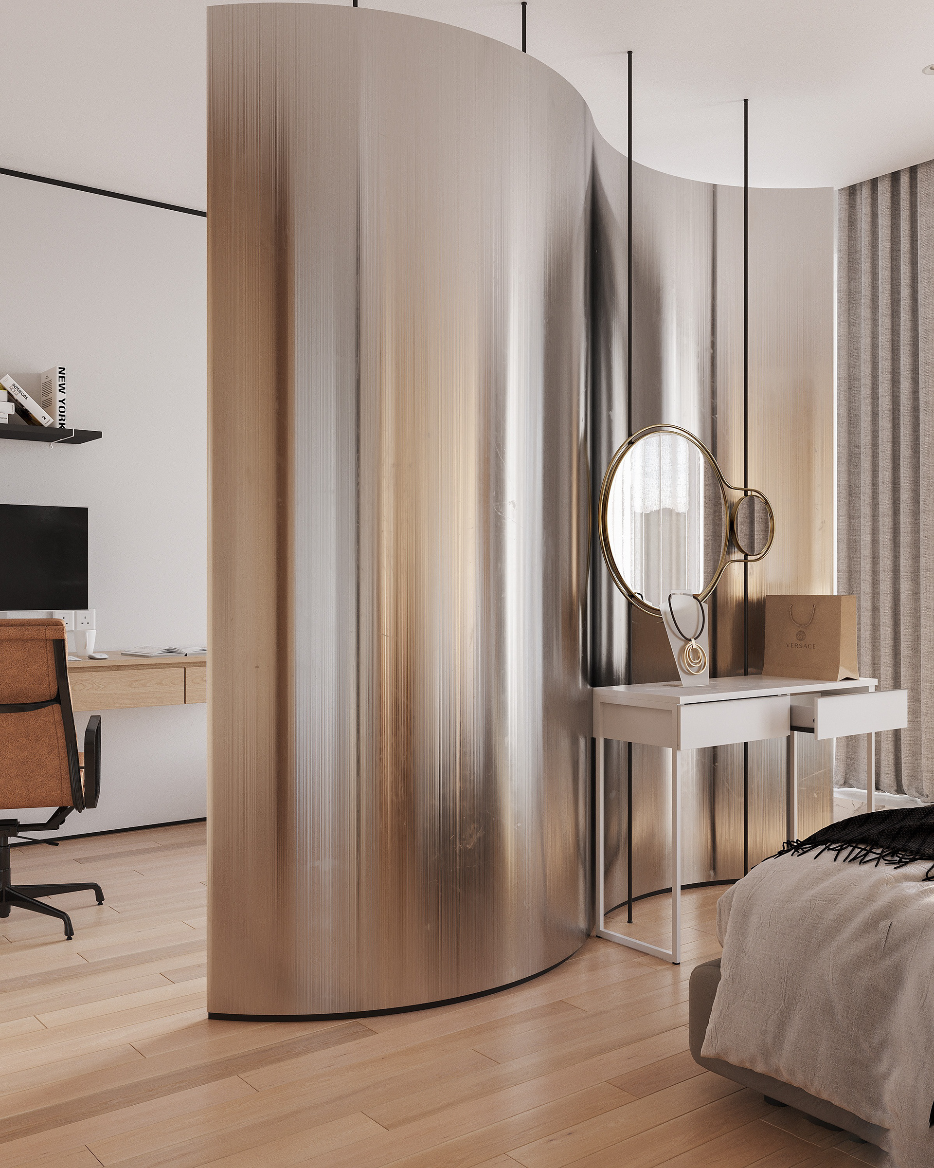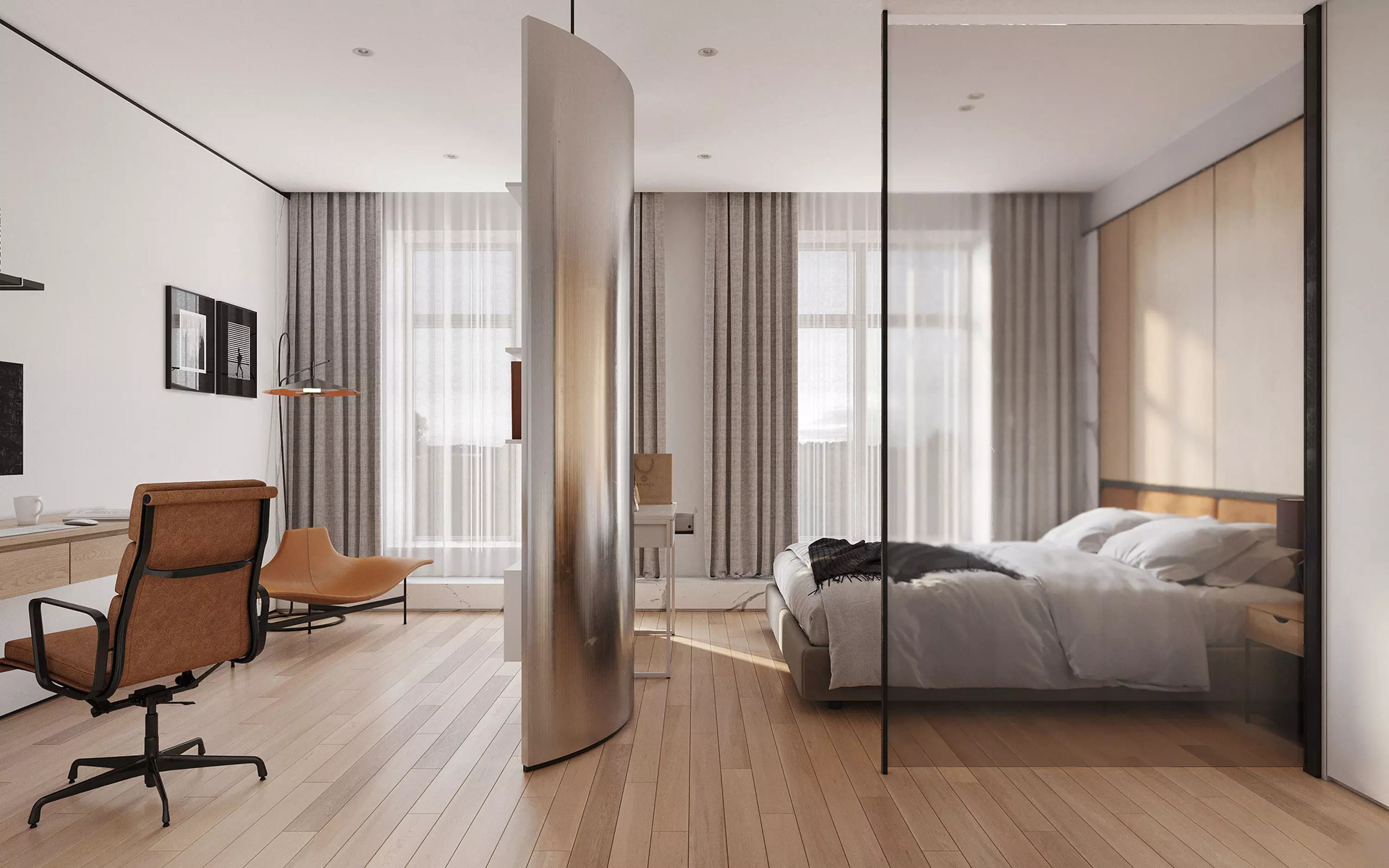 Modern open-plan apartment organized into clear functional zones: sleeping, working, and living. The spaces are subtly divided by a curved metal panel that provides privacy while maintaining visual continuity. The interior features a balanced mix of natural wood, satin-finish metal, and glass, combined with neutral tones and warm lighting. Furniture is minimalist and practical, designed for everyday living, with integrated storage and clean, precise lines.