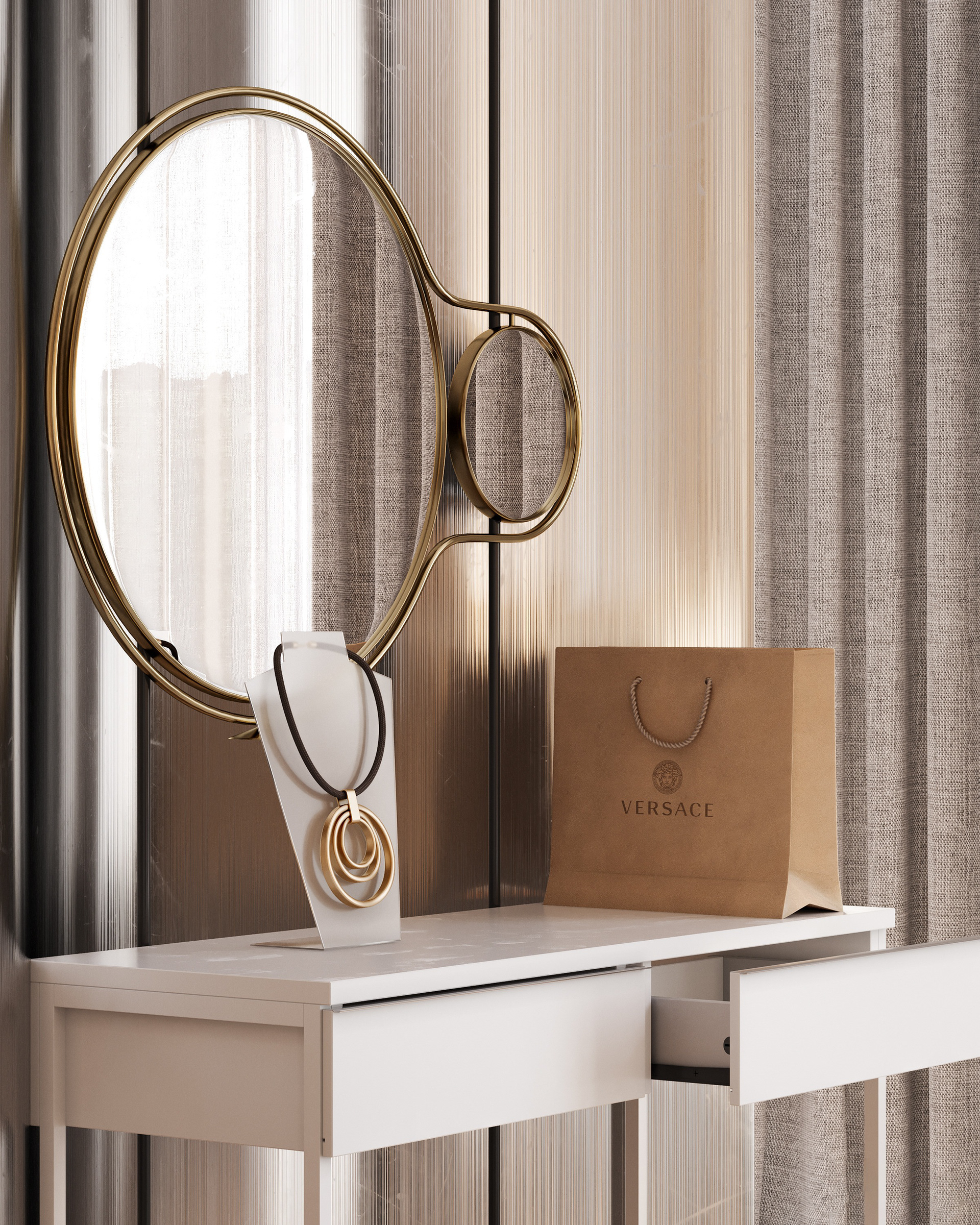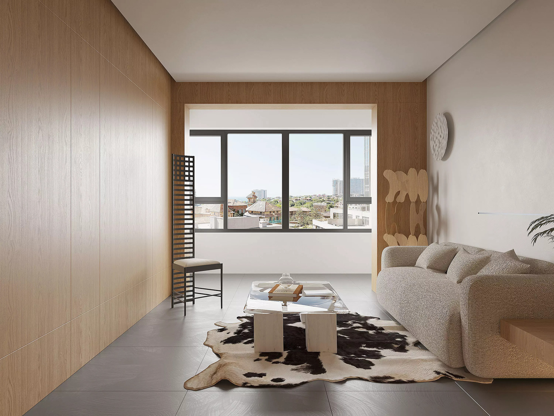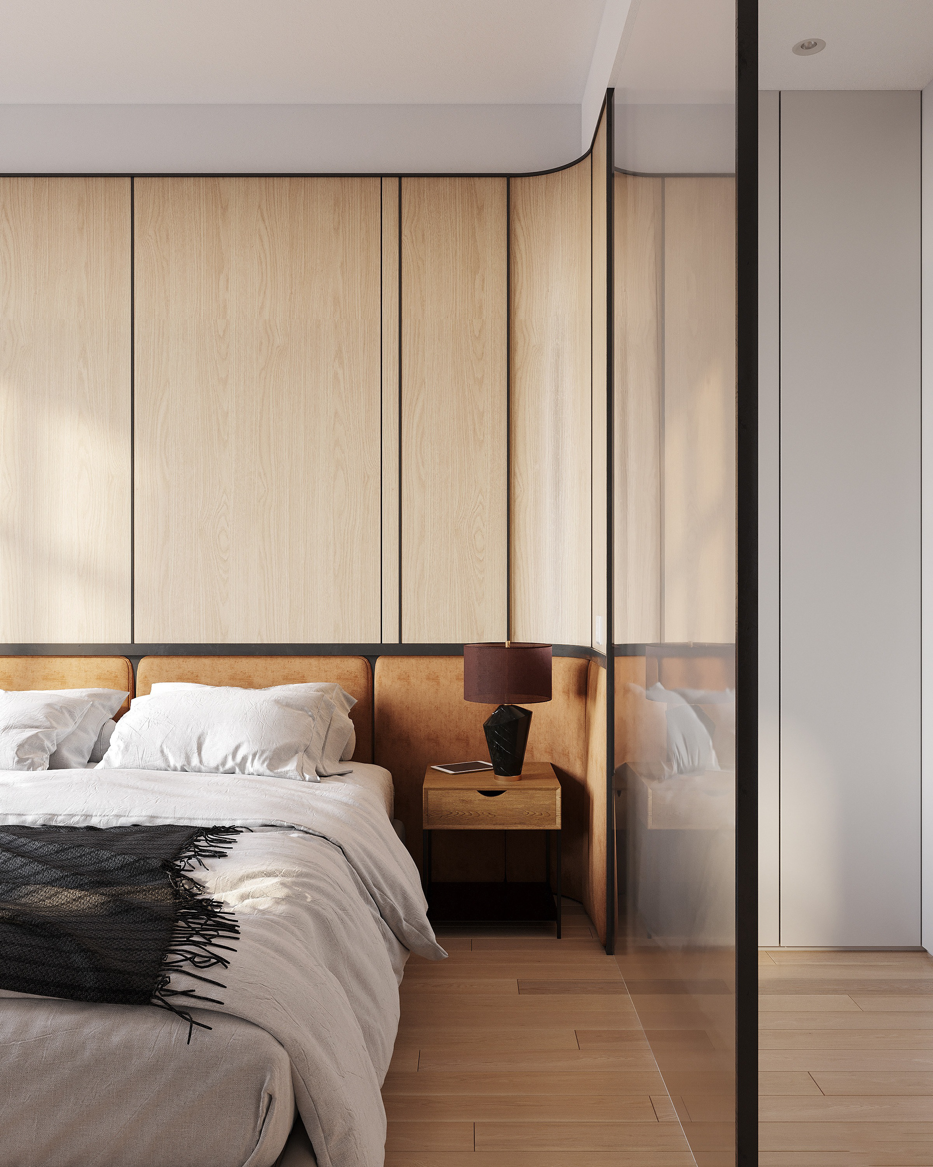 Modern open-plan apartment organized into clear functional zones: sleeping, working, and living. The spaces are subtly divided by a curved metal panel that provides privacy while maintaining visual continuity. The interior features a balanced mix of natural wood, satin-finish metal, and glass, combined with neutral tones and warm lighting. Furniture is minimalist and practical, designed for everyday living, with integrated storage and clean, precise lines.